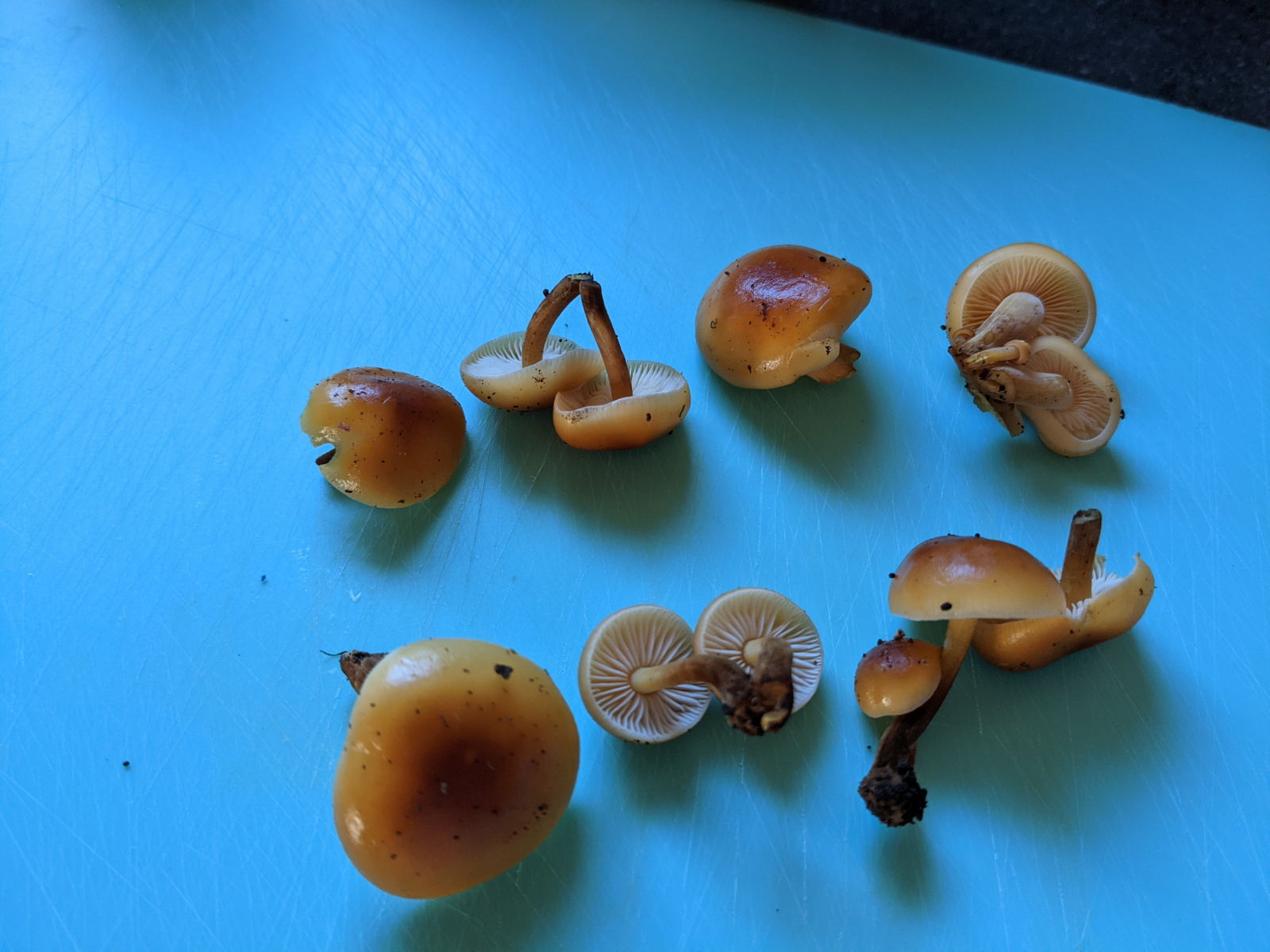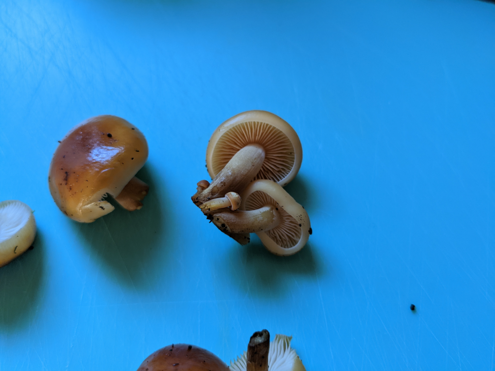 Die Huthaut ist klebrig, kein Ring, helle Lamellen und der fein samtige Fuß. Härchen erkenne ich zwar nicht, aber er fühlt sich weich an. Die Pilze sind noch sehr jung, es waren bereits jeweils die größten an den Stellen. Der größte gut auf den Bildern hat ca 3cm Durchmesser.