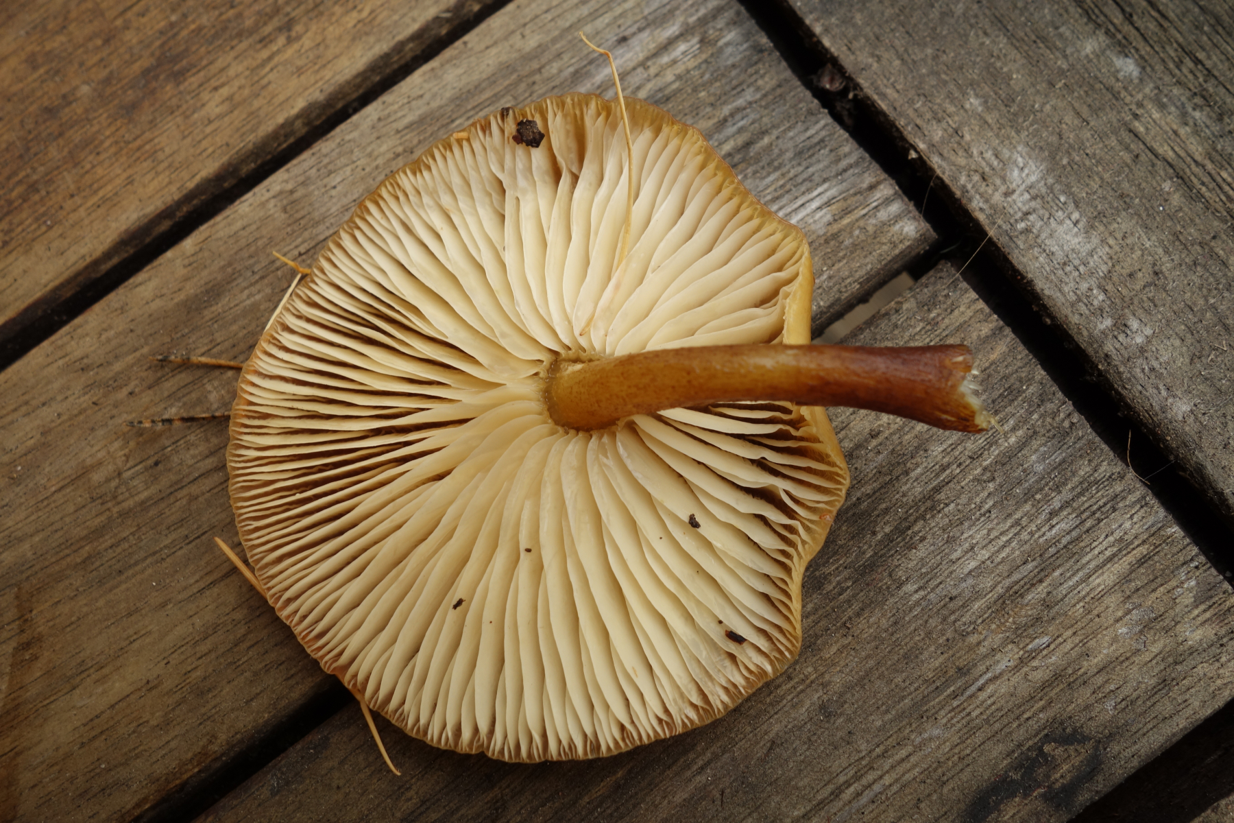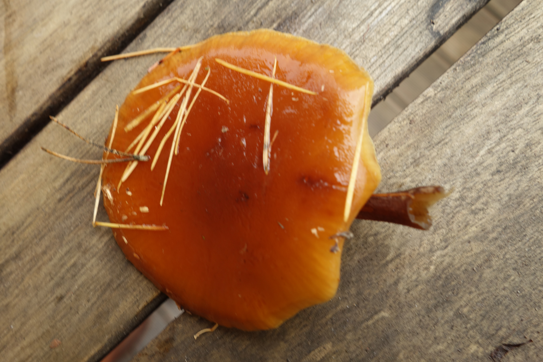 Nummer 3: Hut gelbbraun, am rand fein durchscheinend gerieft, sehr schmierig. Lamellen cremefarben. Stiel an der Spitze gelb, zur Basis hin dunkelbraun, hohl. Samtfußrübling?