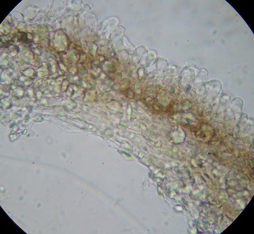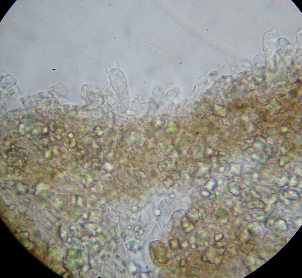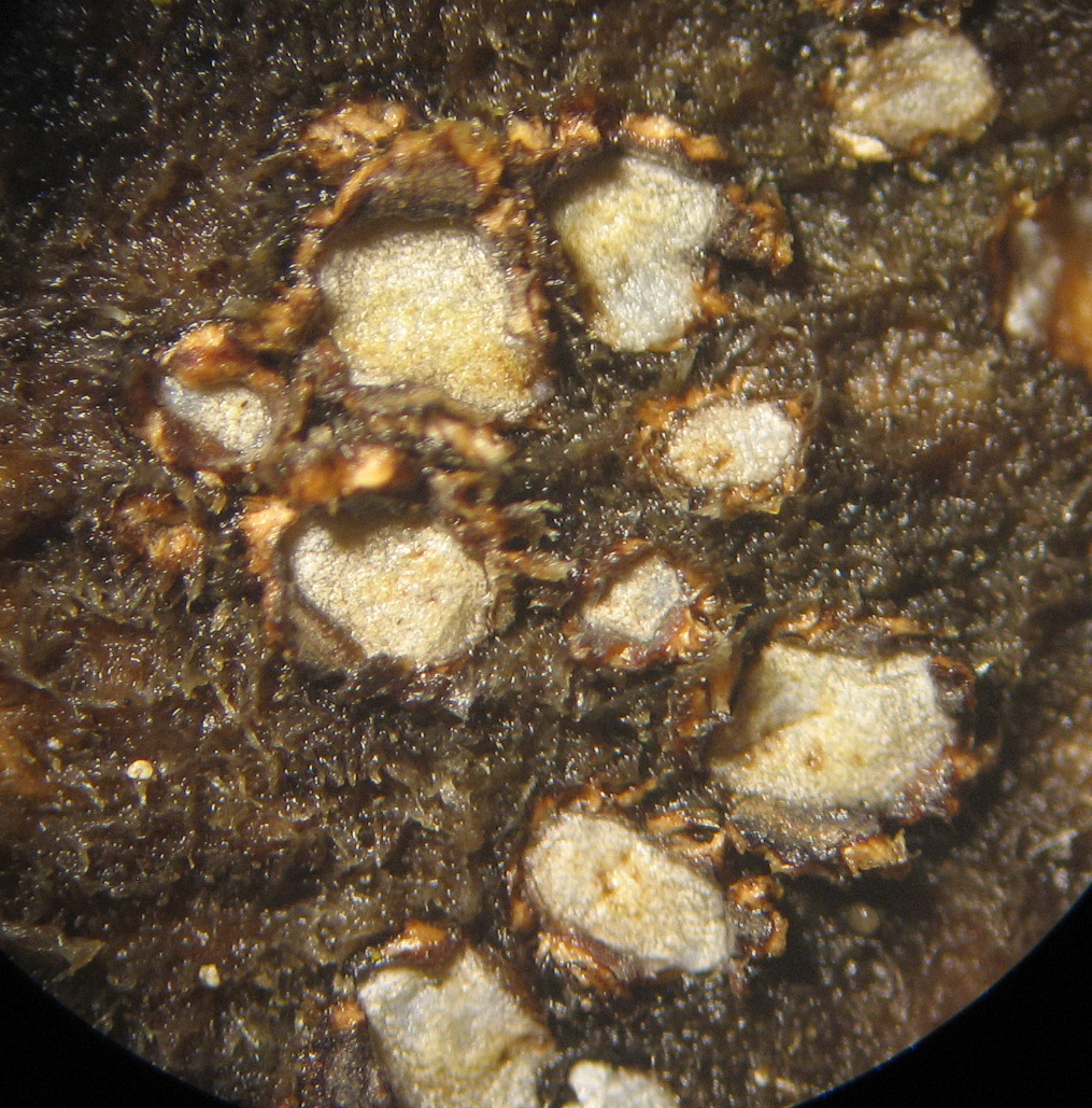 muschel - bis becherförmige, sehr dünne, ca 1-3mm große Fruchtkörper zu sehen.
