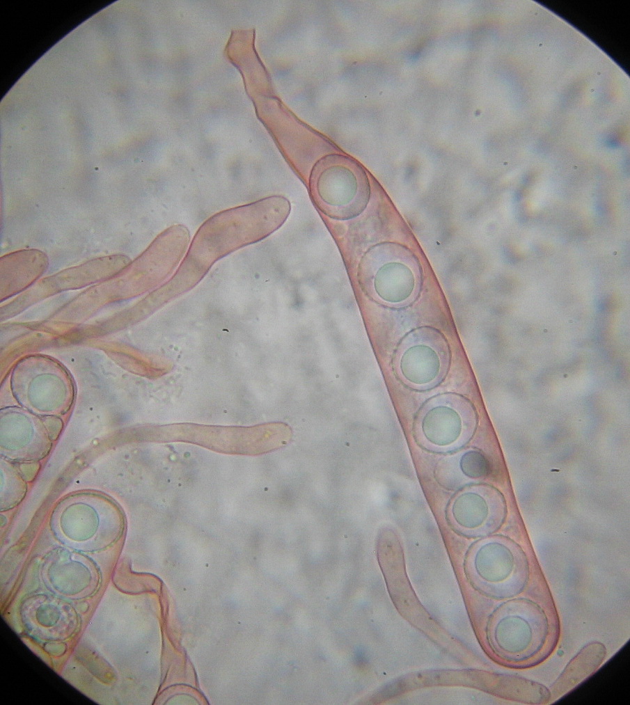 Hier Ascus mit Sporen und Paraphysen mit Kresylblau eingefärbt