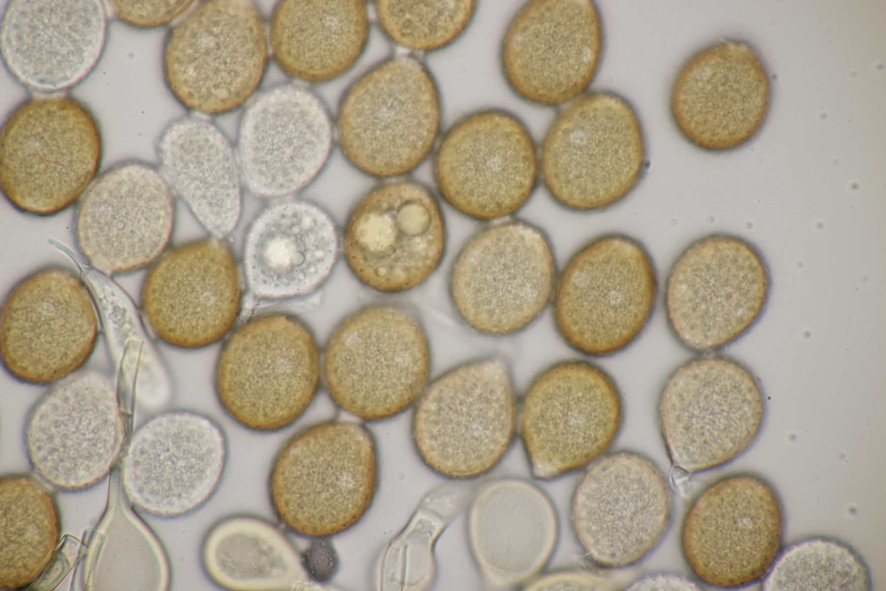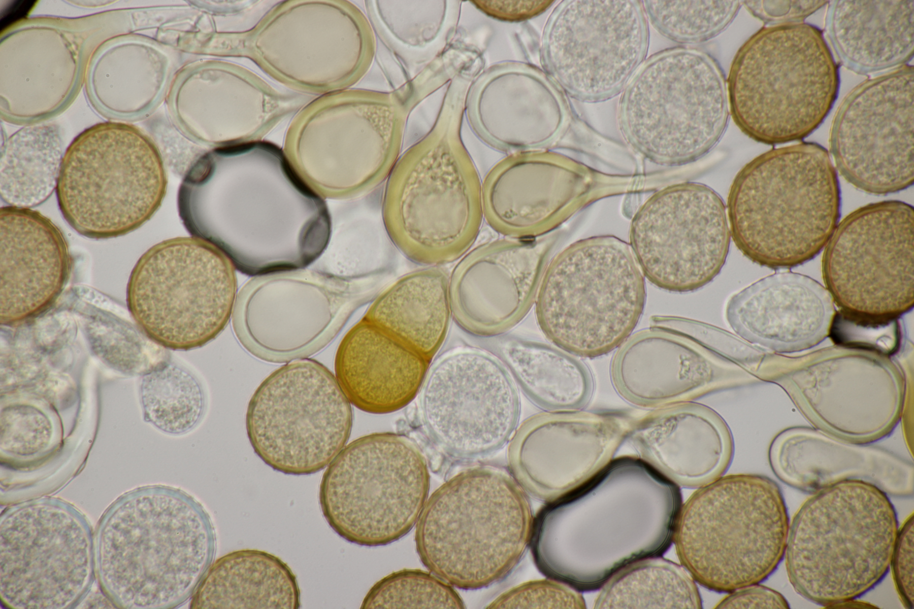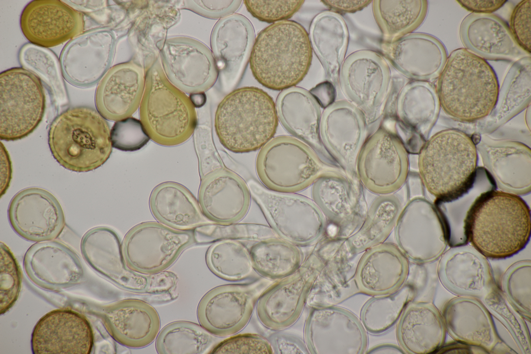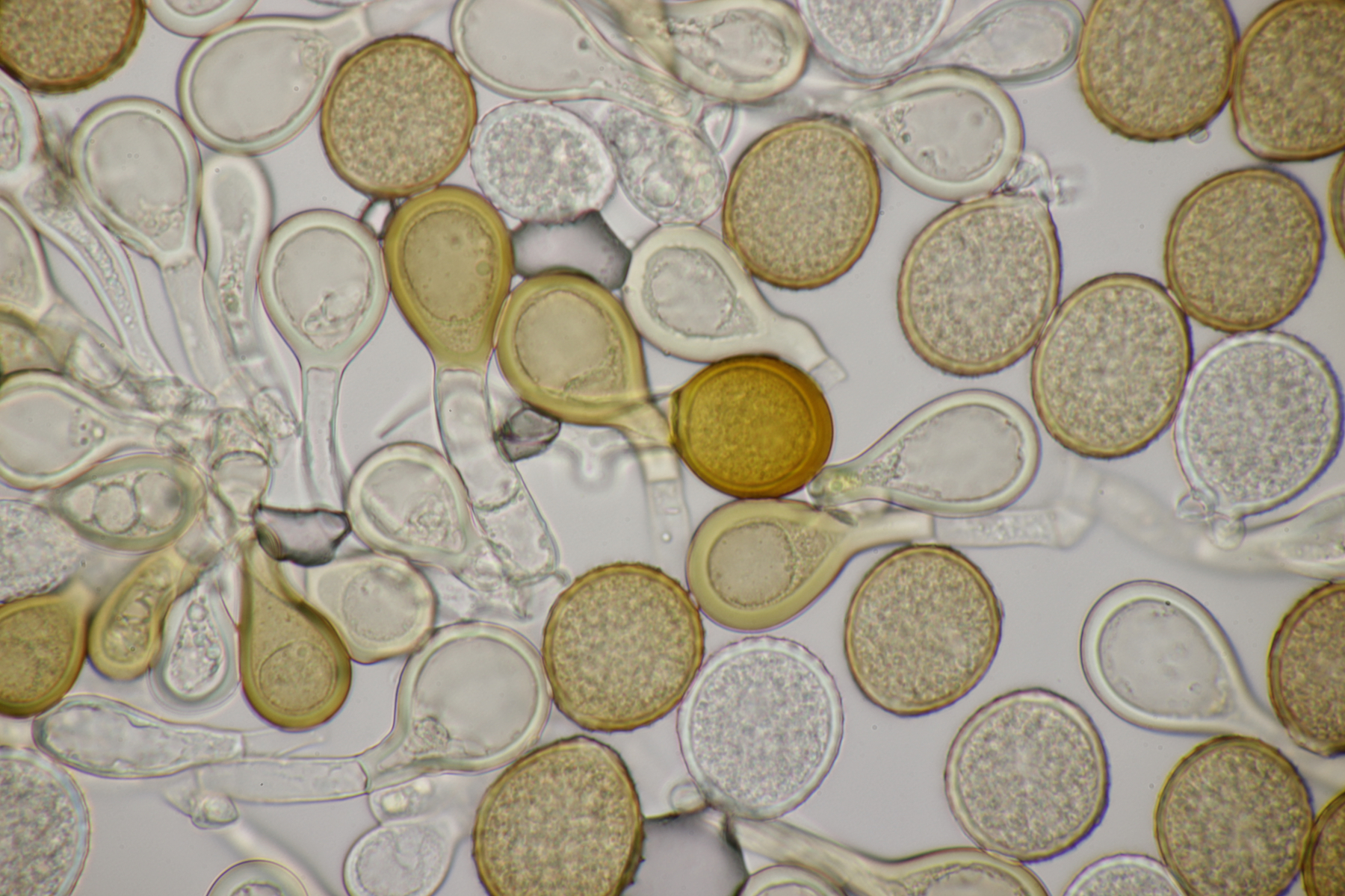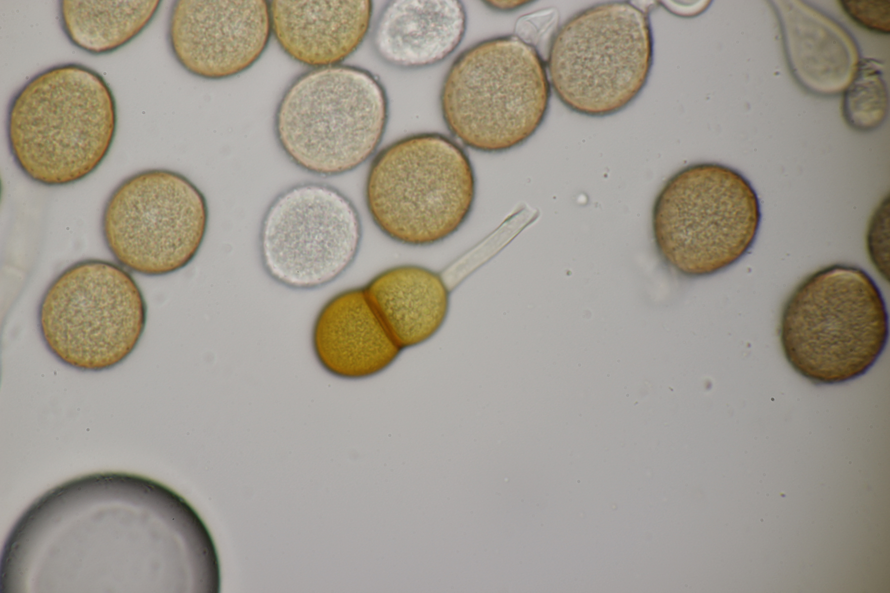 4. Den Fund hier würde ich Bovista plumbeum nennen wollen, wenn es keine Einwände gibt. Sporen (4.9+-0.4) µm x (4.5+-0.3) µm, Q=1.1+-0.1 bzw. (3.9-5.4) µm x (3.9-5.0) µm, Q=1.0-1.3, Capillitium vom Bovista-Typ ohne Poren.
