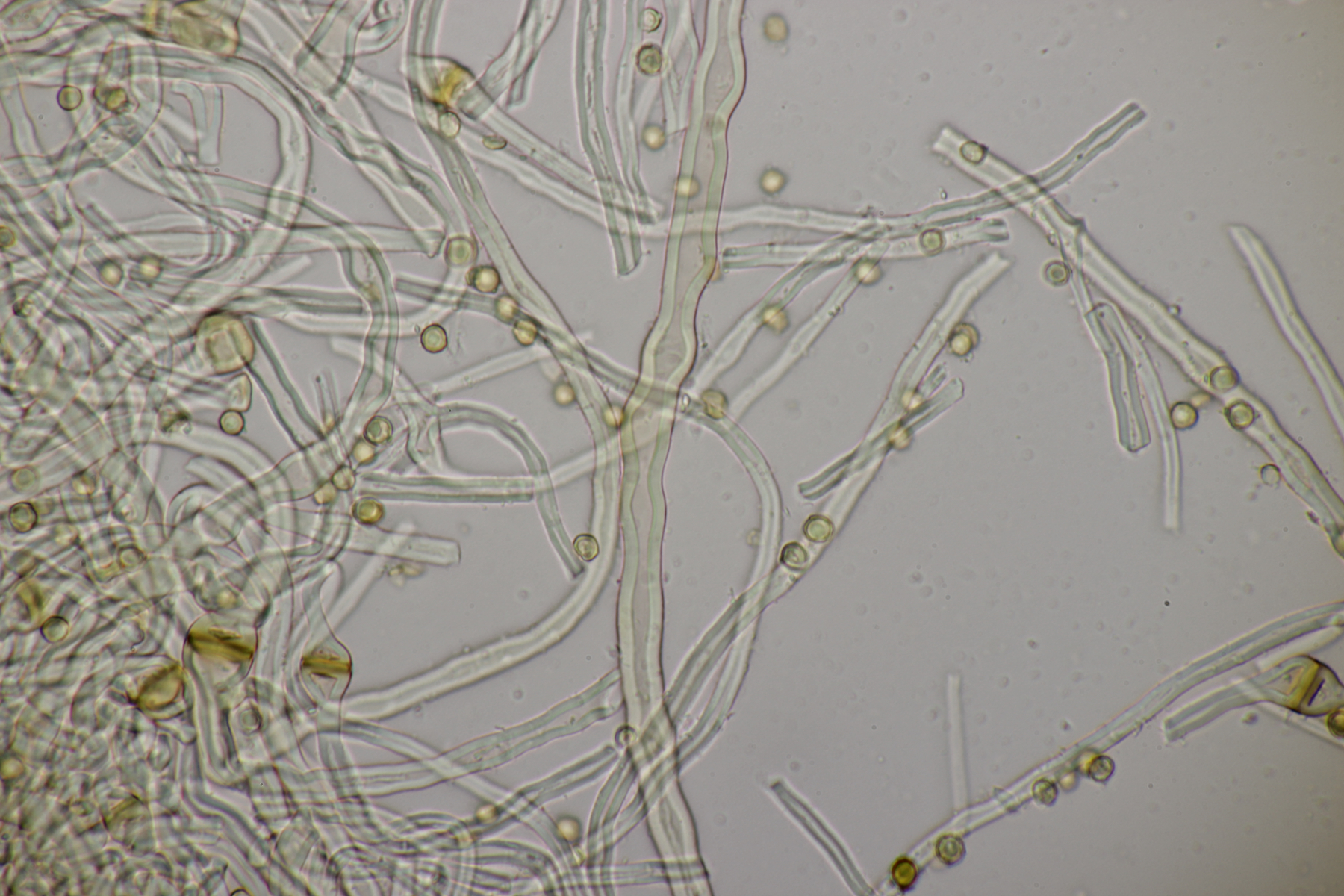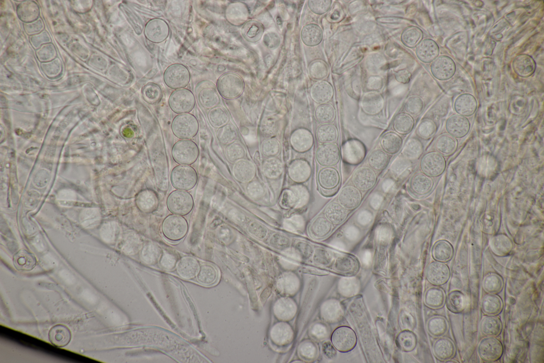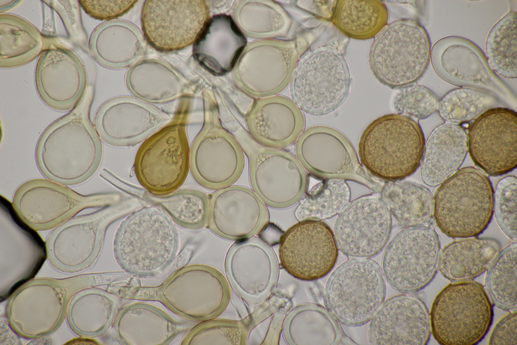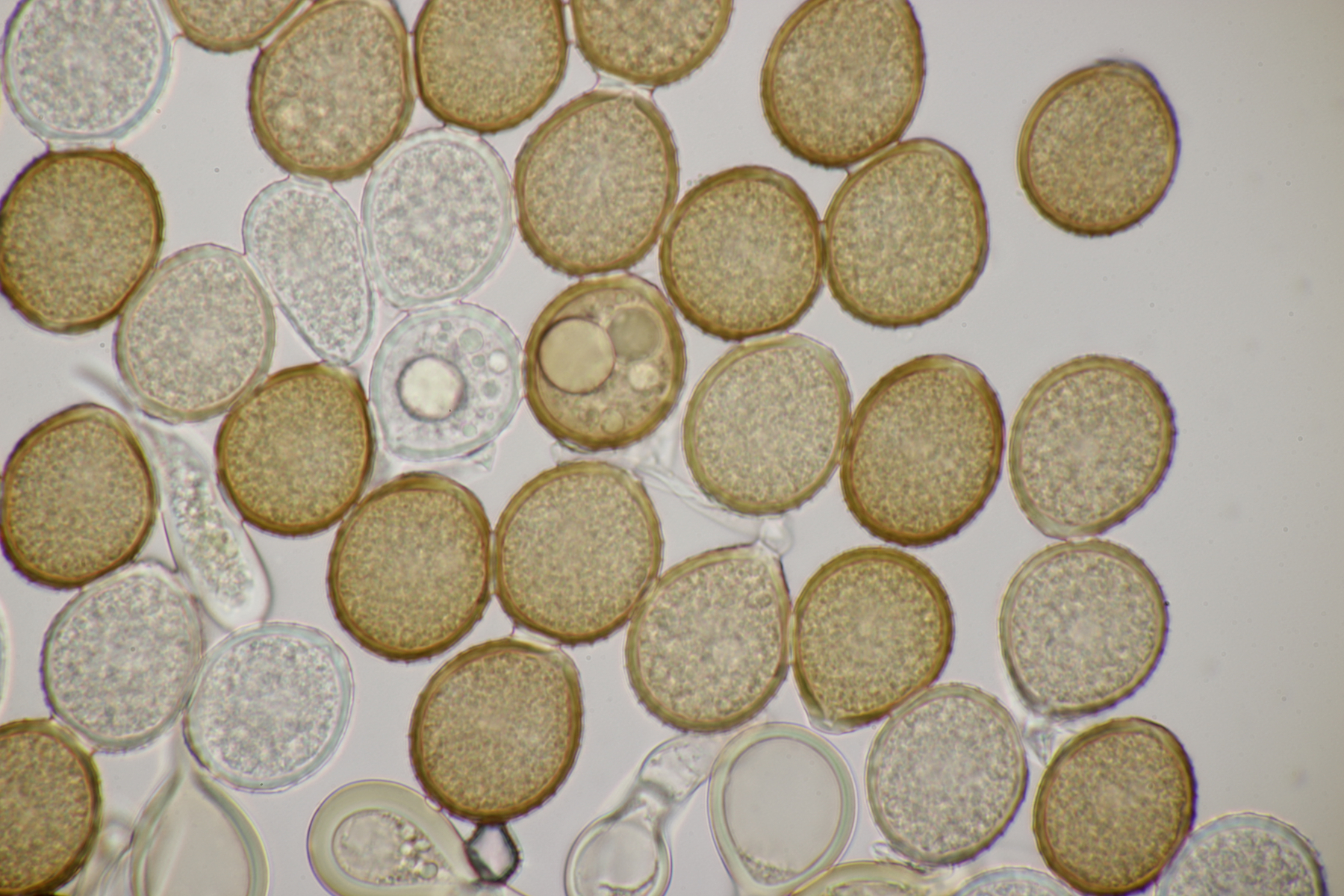 4. Den Fund hier würde ich Bovista plumbeum nennen wollen, wenn es keine Einwände gibt. Sporen (4.9+-0.4) µm x (4.5+-0.3) µm, Q=1.1+-0.1 bzw. (3.9-5.4) µm x (3.9-5.0) µm, Q=1.0-1.3, Capillitium vom Bovista-Typ ohne Poren.