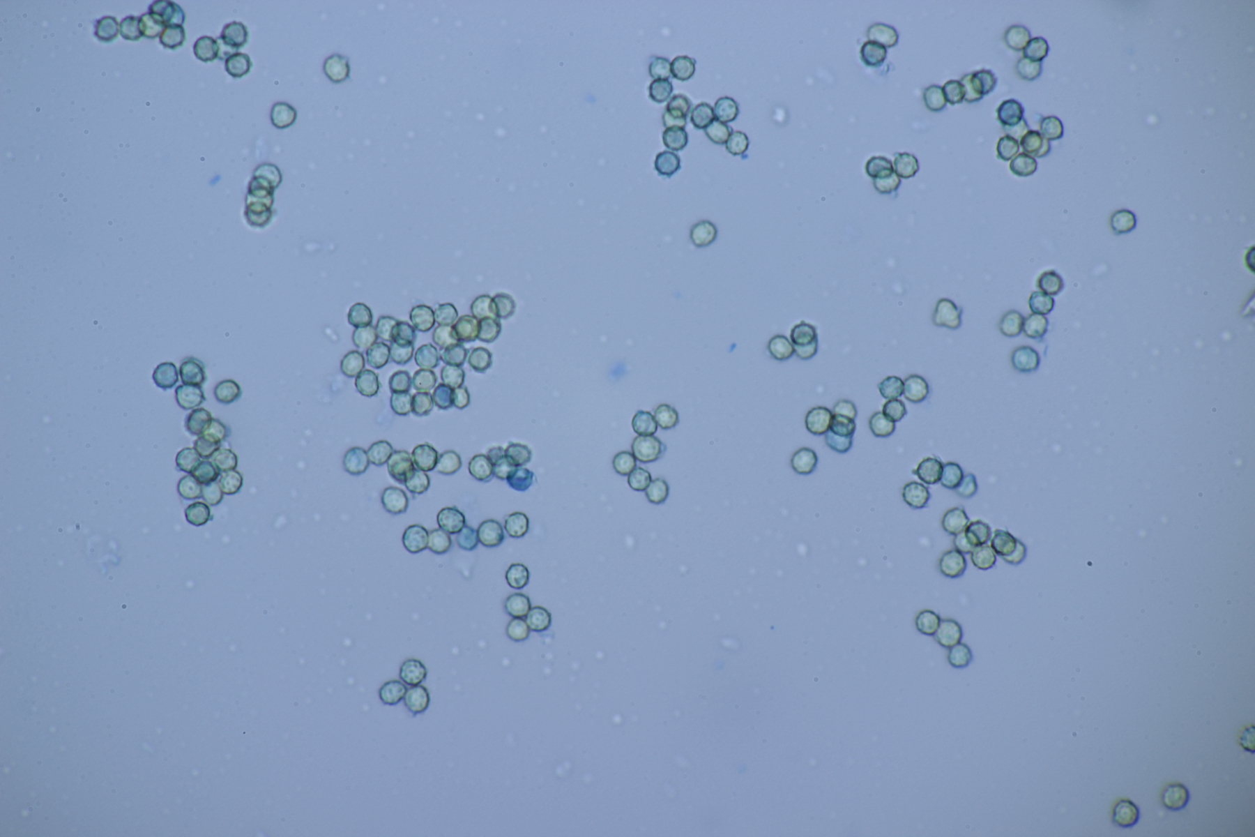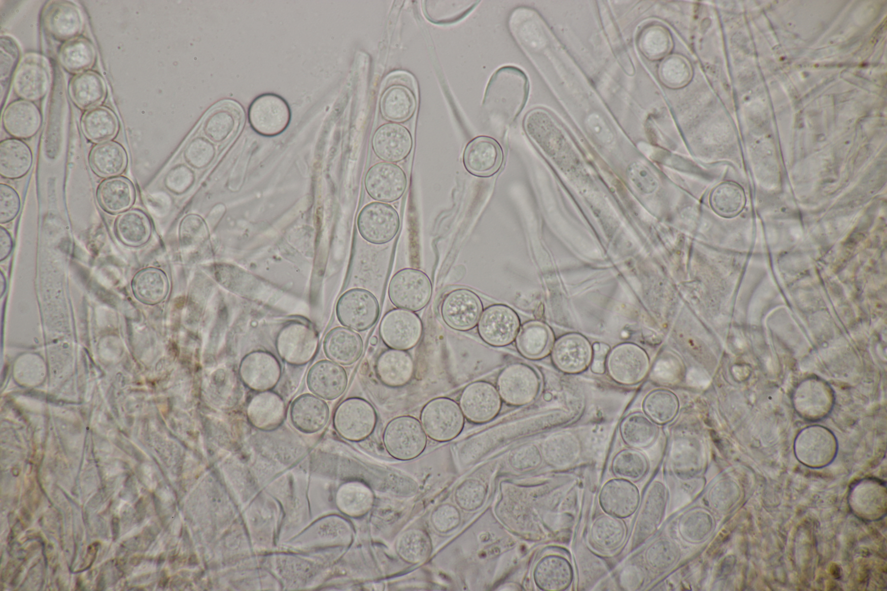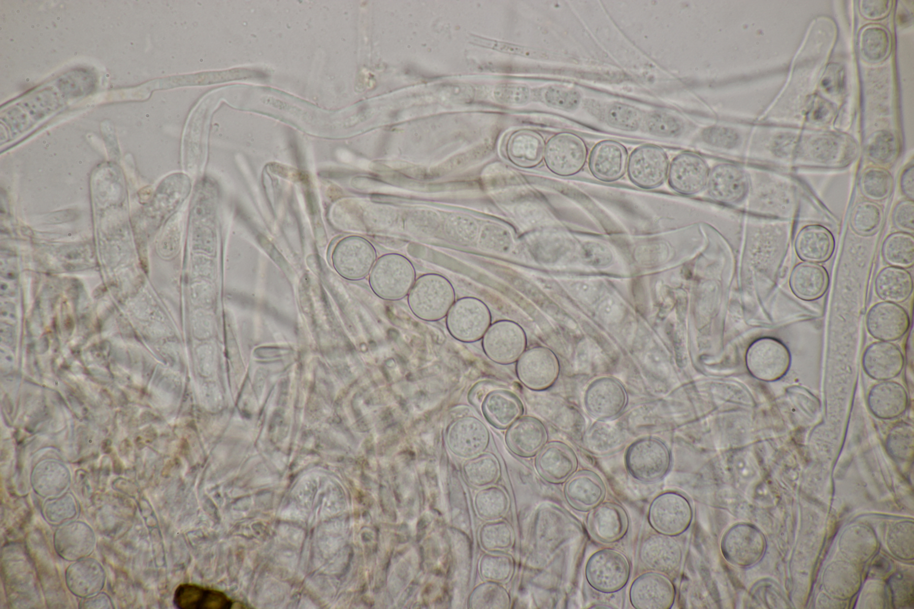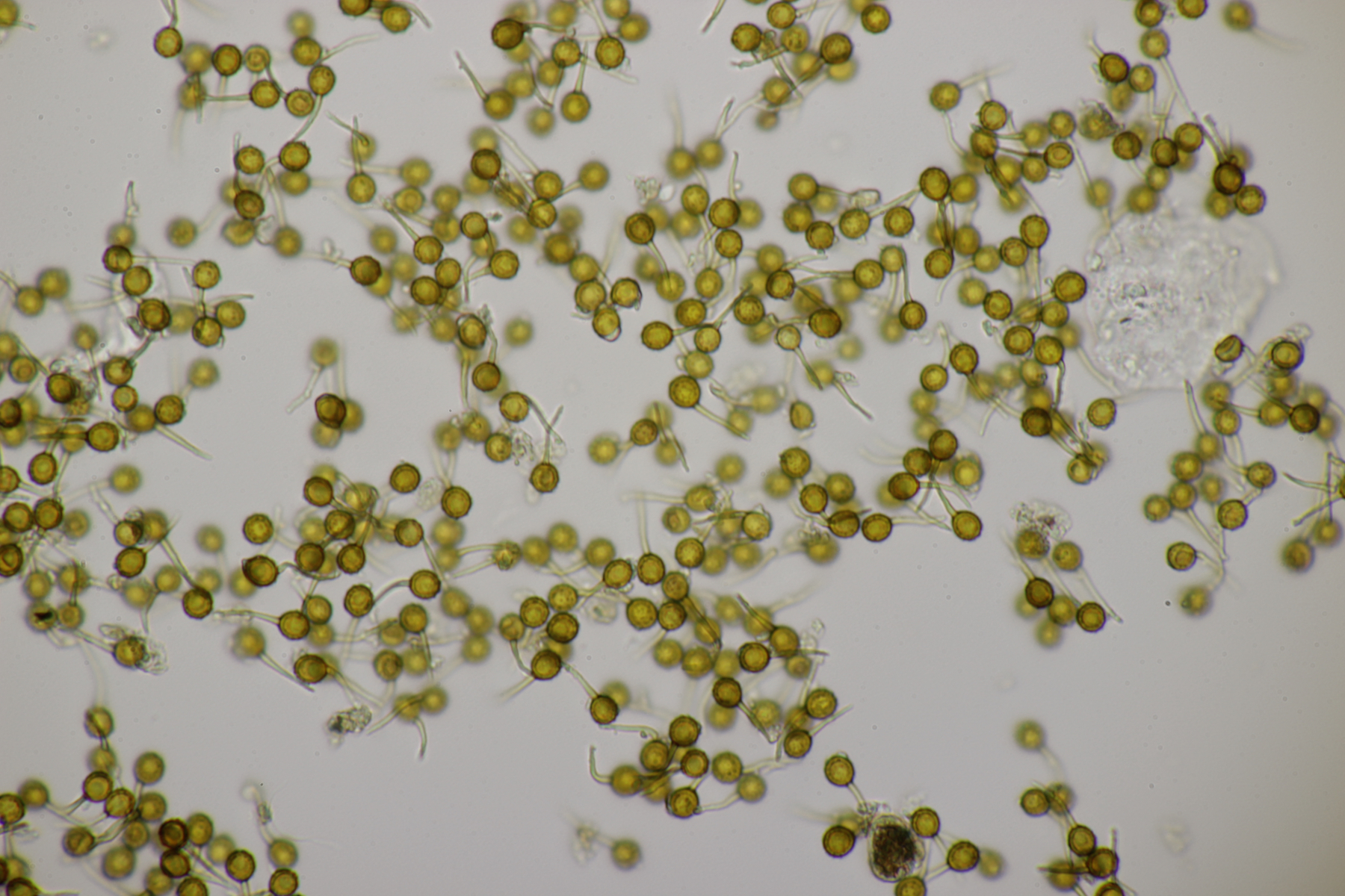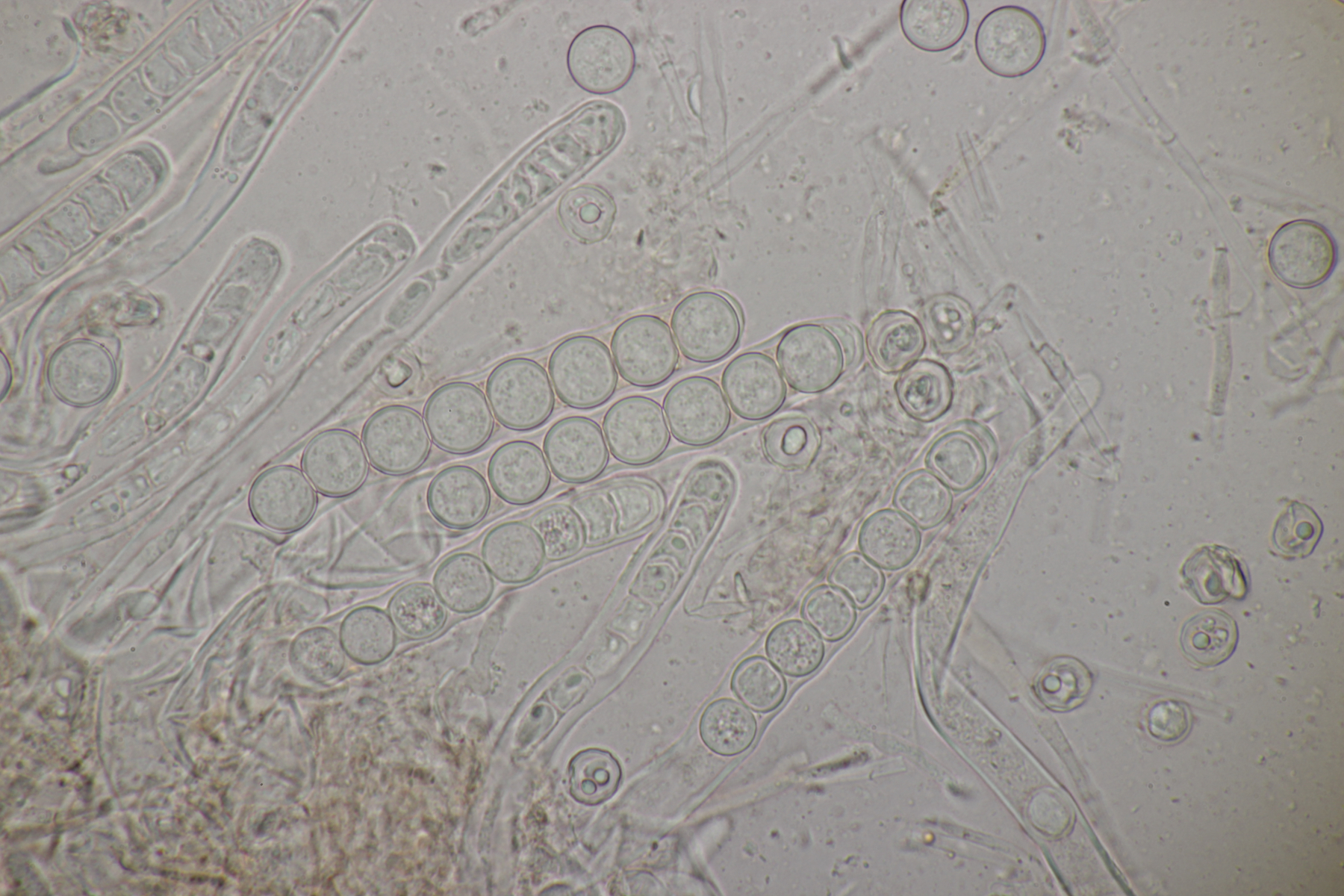 4. Den Fund hier würde ich Bovista plumbeum nennen wollen, wenn es keine Einwände gibt. Sporen (4.9+-0.4) µm x (4.5+-0.3) µm, Q=1.1+-0.1 bzw. (3.9-5.4) µm x (3.9-5.0) µm, Q=1.0-1.3, Capillitium vom Bovista-Typ ohne Poren.