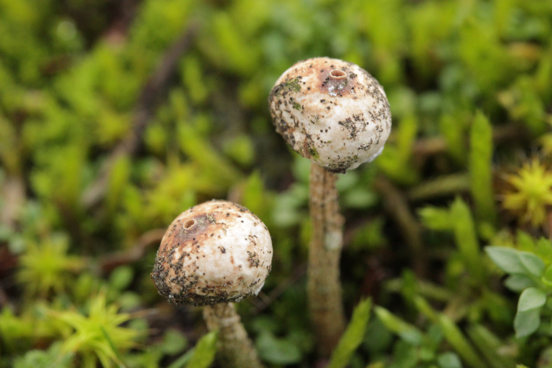 2. Eine Tulostoma, die abgesehen von den fehlenden Kristallen am Capillitium gut zu T. brumale paßt. Sporengröße (4.2+-0.2) µm x (3.8+-0.2) µm, Q=1.1+-0.1 bzw. (3.8-4.8) µm x (3.5-4.2) µm, Q=1.0-1.2