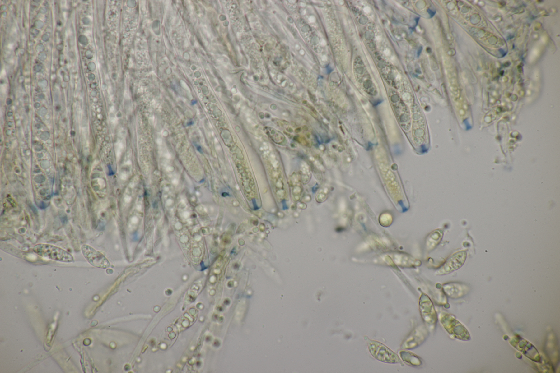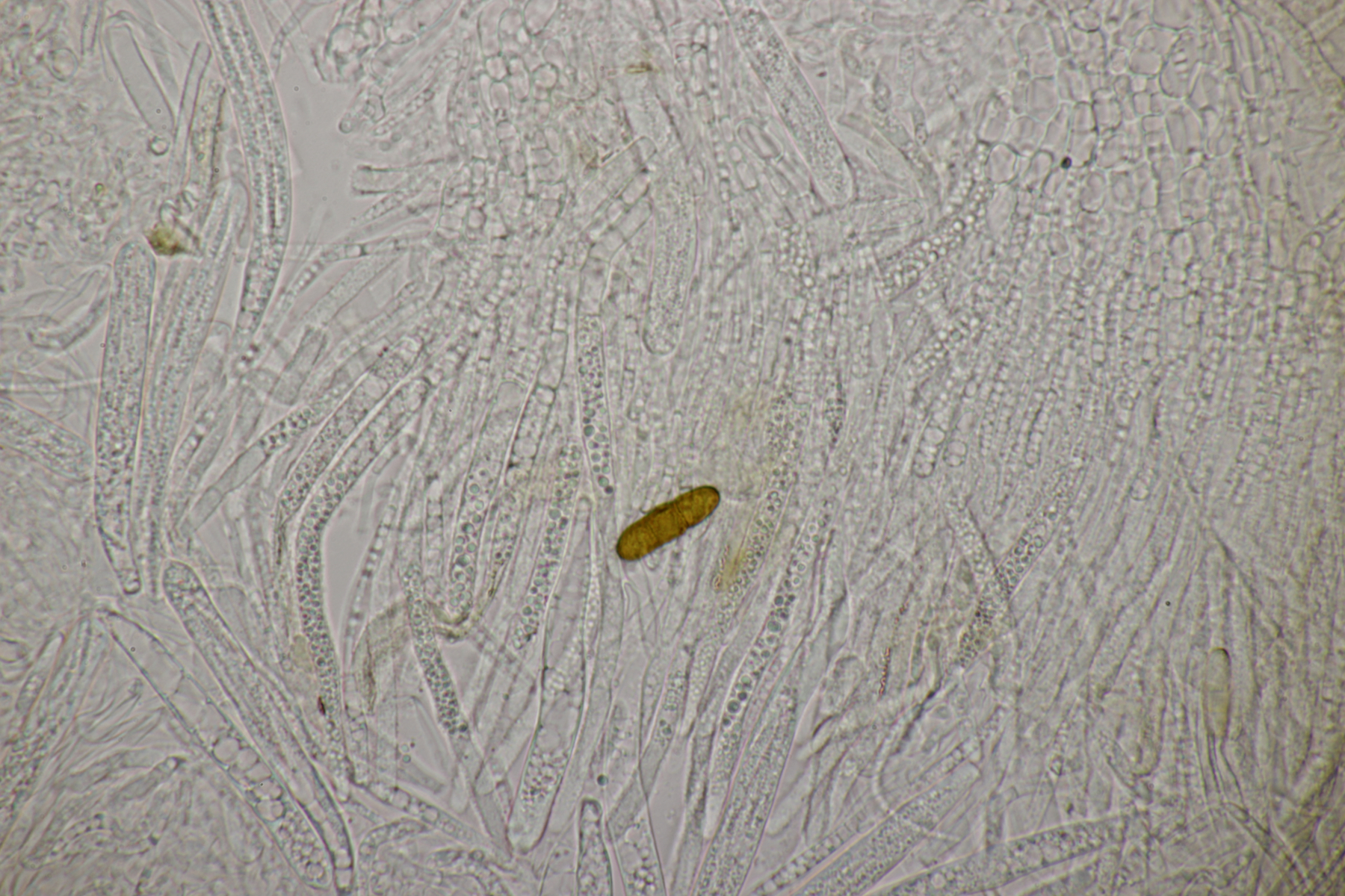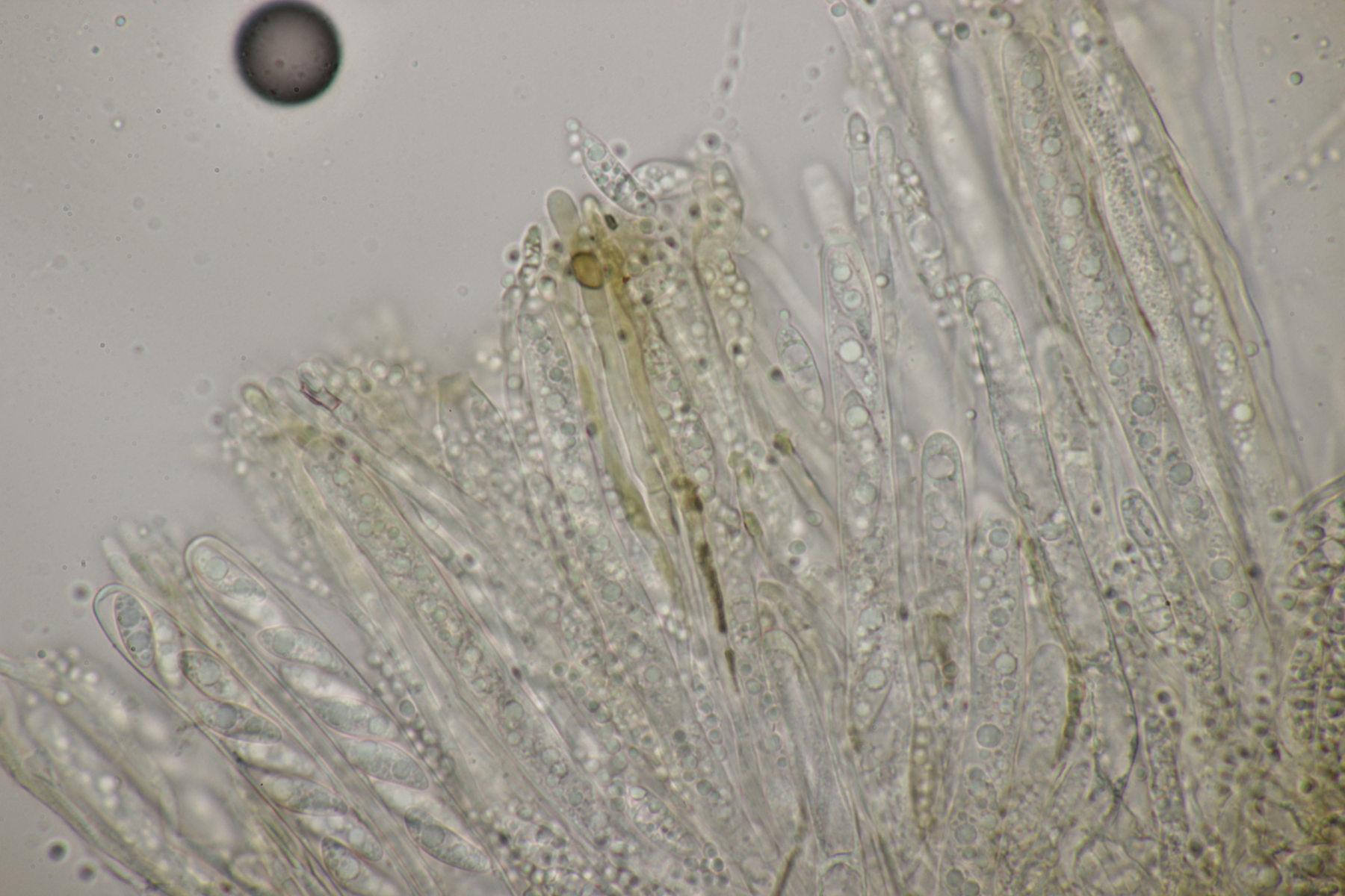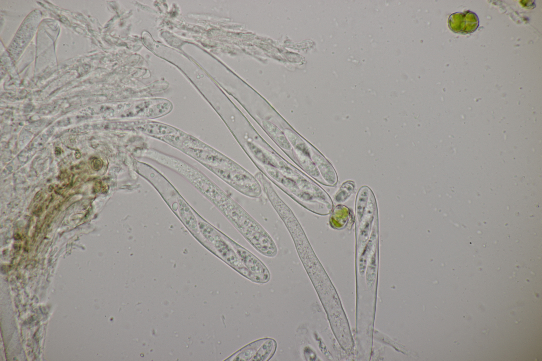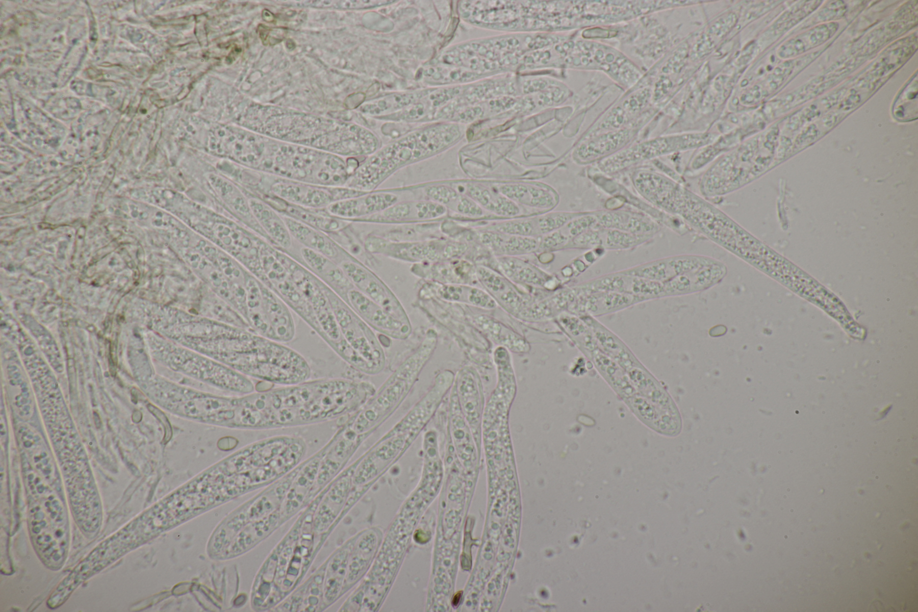 3. Ebenfalls an Eiche. Im Feld dachte ich hier erstmal an irgendwelche Heterobasidiomyceten, aber im Mikroskop zeigten sich dann Schläuche. Die Sporen messen (14.7-17.1) µm x (3.8-4.5) µm, Q=3.3-4.4, die Asci reagieren mit Lugol blau und ich meine Haken gesehen zu haben. Paraphysen konnte ich keine entdecken. Hat jemand hier eine Idee?