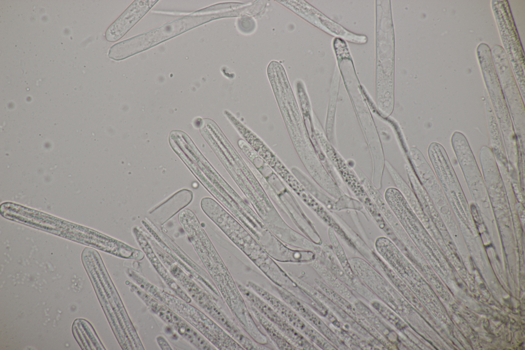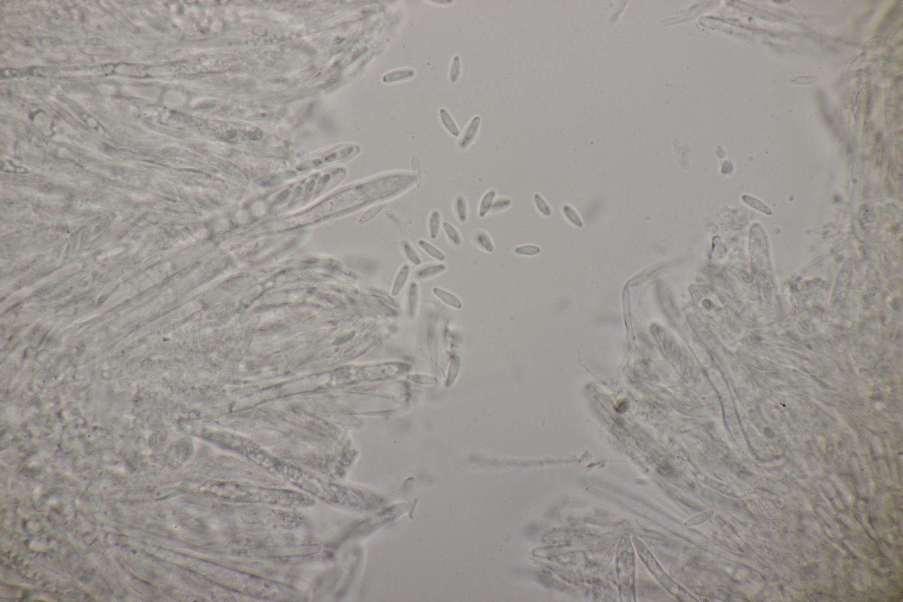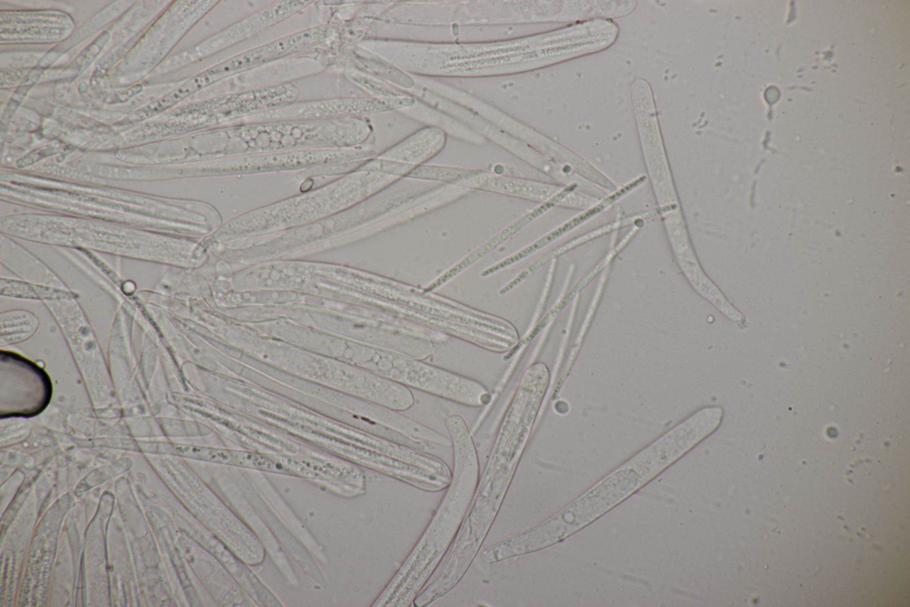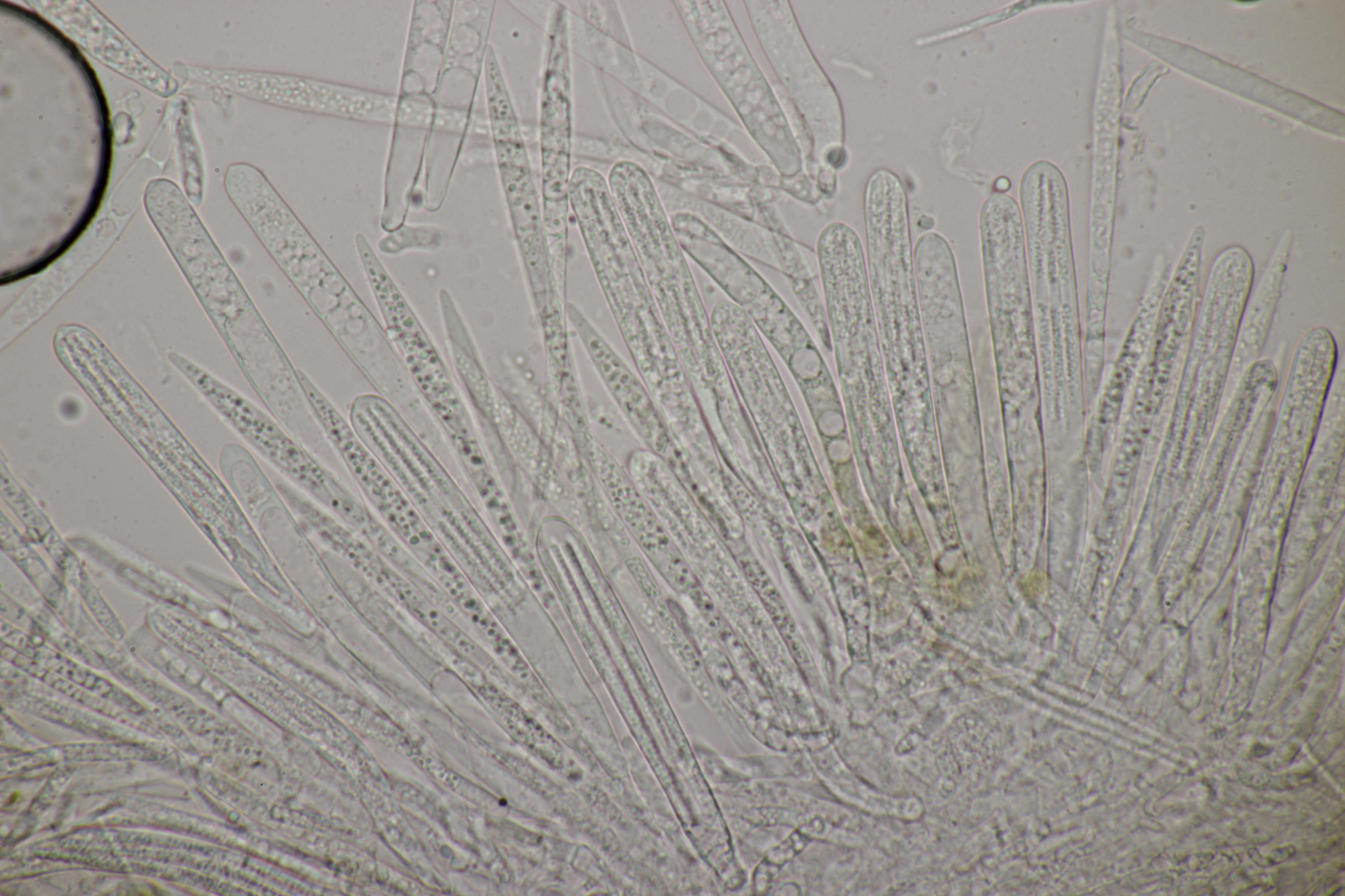 3. Ebenfalls an Eiche. Im Feld dachte ich hier erstmal an irgendwelche Heterobasidiomyceten, aber im Mikroskop zeigten sich dann Schläuche. Die Sporen messen (14.7-17.1) µm x (3.8-4.5) µm, Q=3.3-4.4, die Asci reagieren mit Lugol blau und ich meine Haken gesehen zu haben. Paraphysen konnte ich keine entdecken. Hat jemand hier eine Idee?