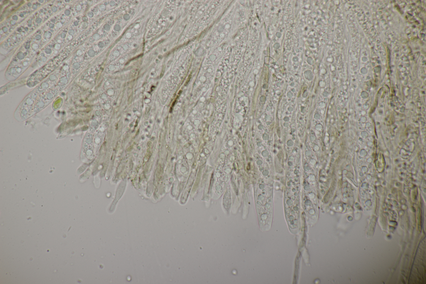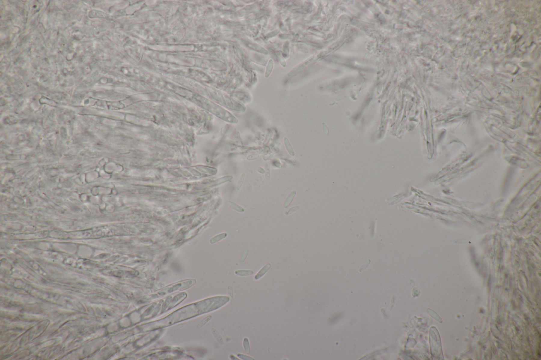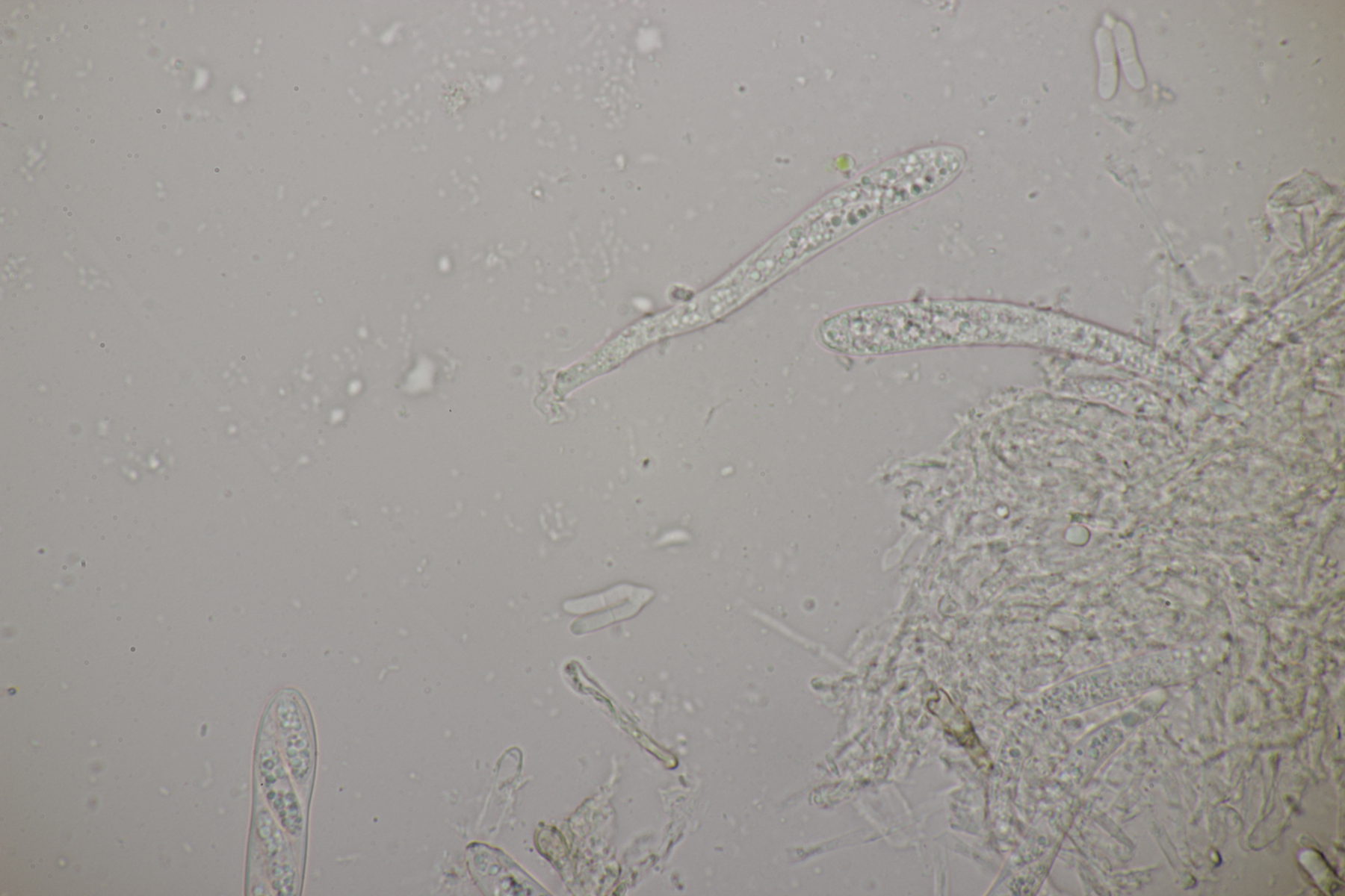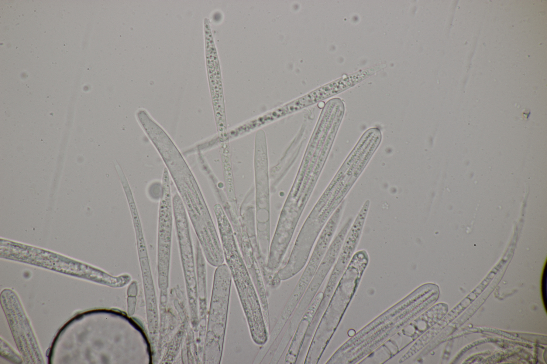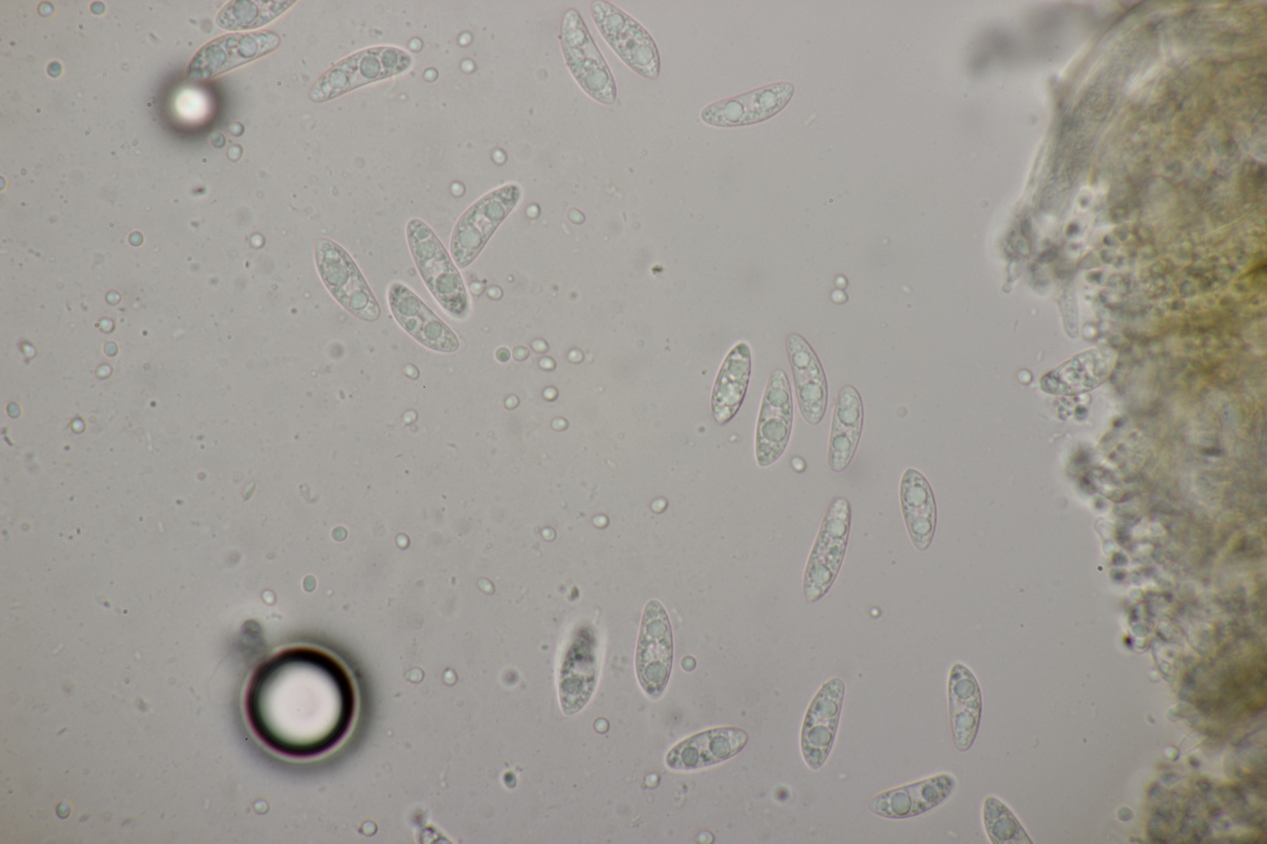 3. Ebenfalls an Eiche. Im Feld dachte ich hier erstmal an irgendwelche Heterobasidiomyceten, aber im Mikroskop zeigten sich dann Schläuche. Die Sporen messen (14.7-17.1) µm x (3.8-4.5) µm, Q=3.3-4.4, die Asci reagieren mit Lugol blau und ich meine Haken gesehen zu haben. Paraphysen konnte ich keine entdecken. Hat jemand hier eine Idee?