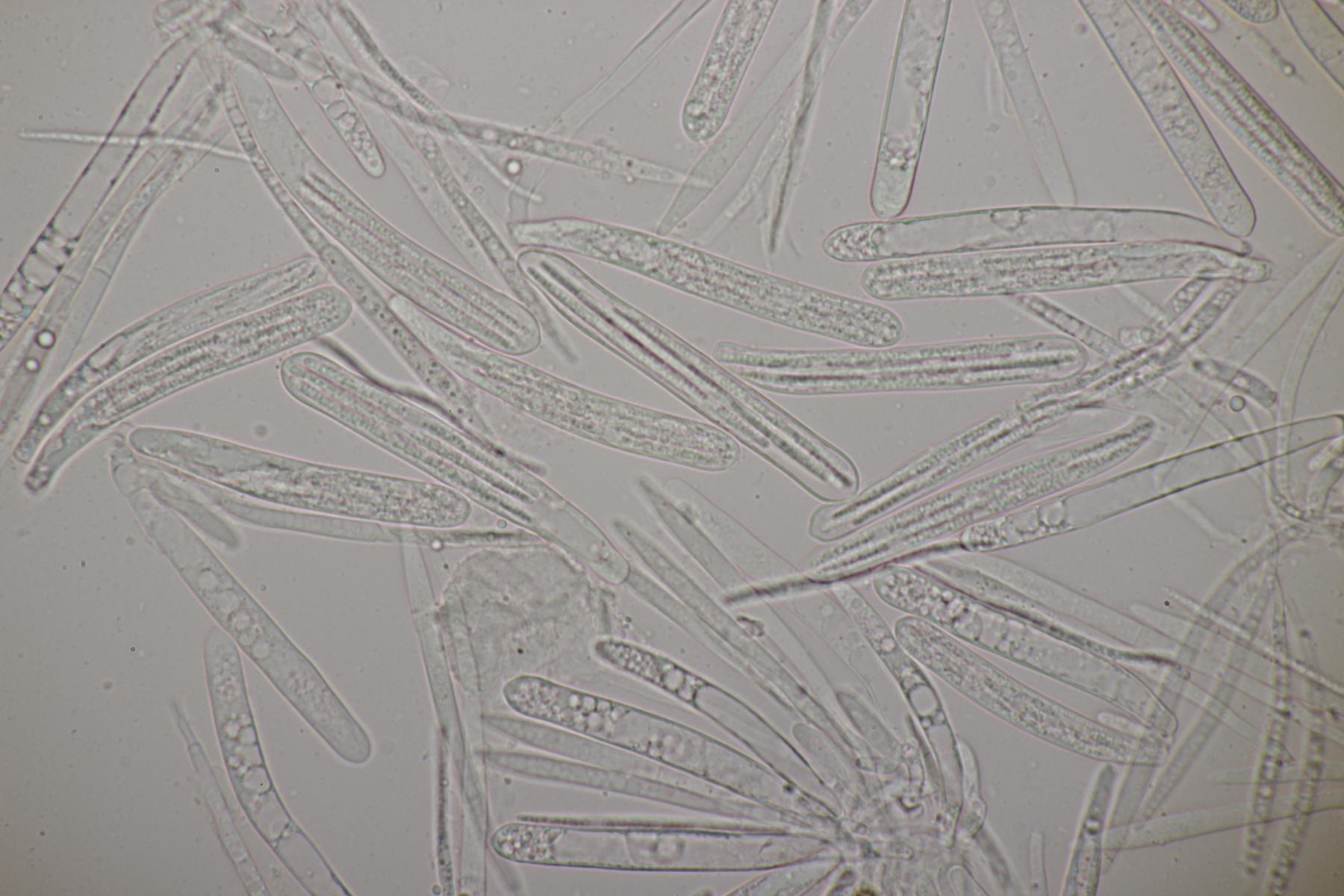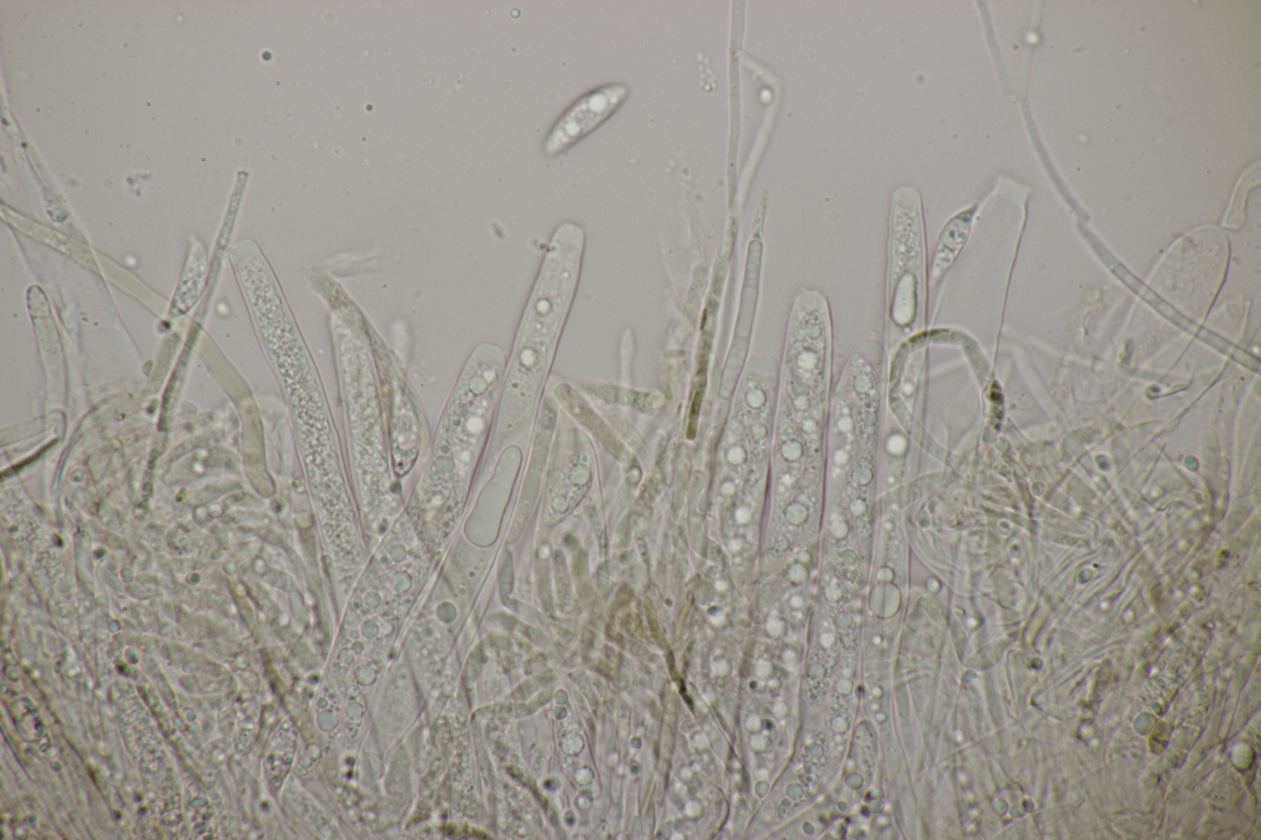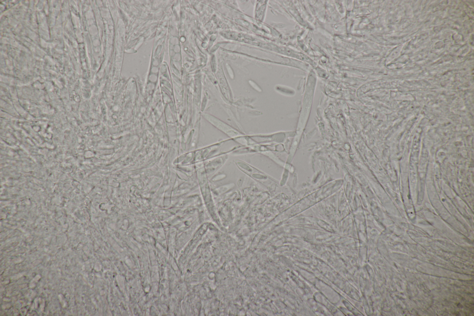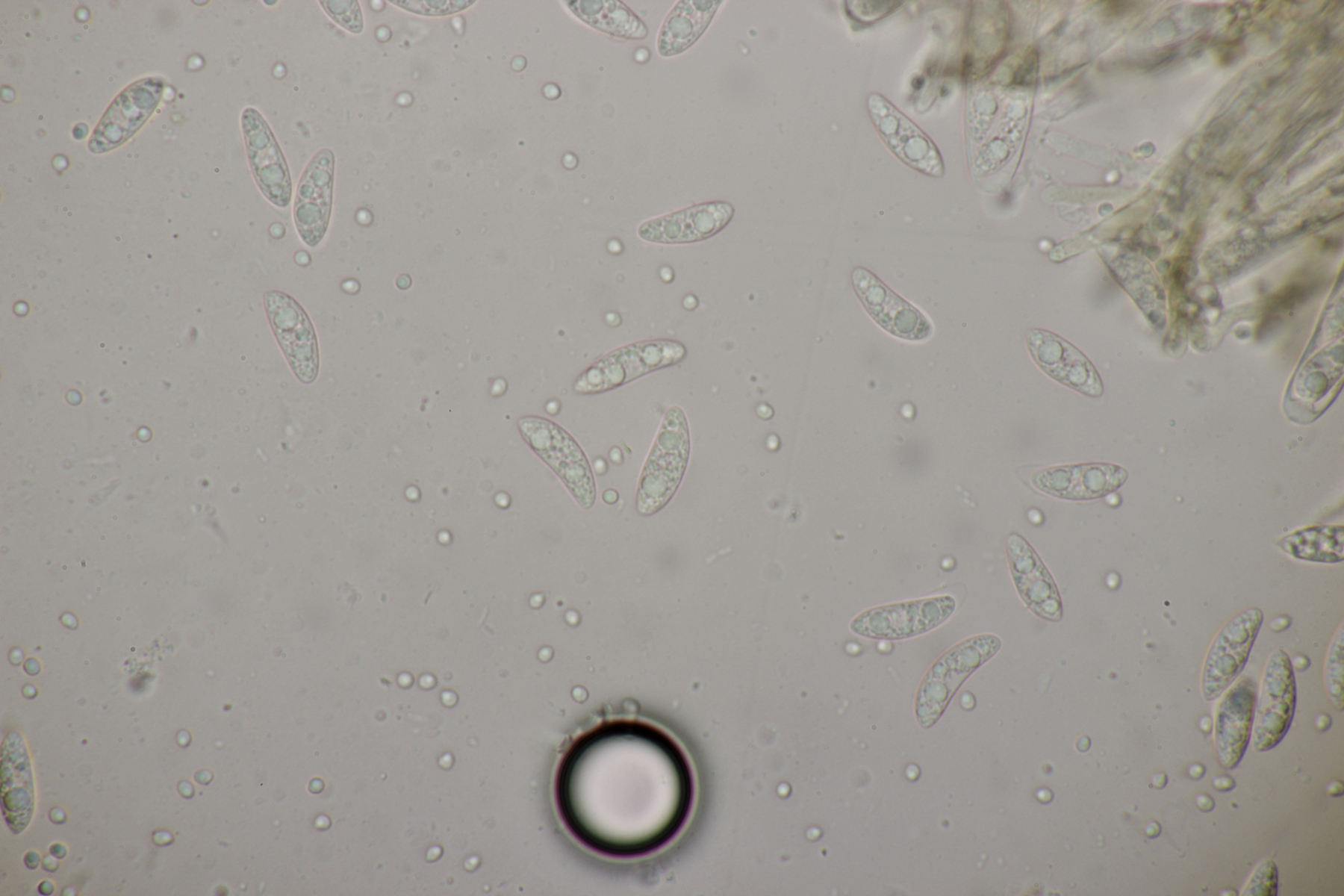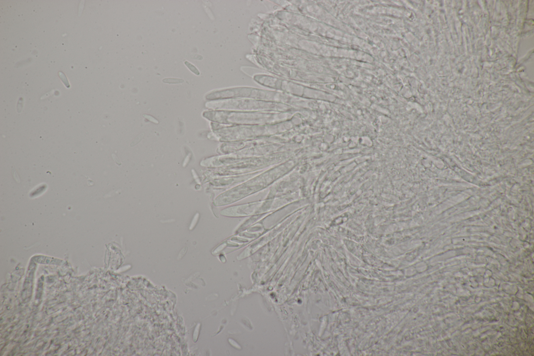 3. Ebenfalls an Eiche. Im Feld dachte ich hier erstmal an irgendwelche Heterobasidiomyceten, aber im Mikroskop zeigten sich dann Schläuche. Die Sporen messen (14.7-17.1) µm x (3.8-4.5) µm, Q=3.3-4.4, die Asci reagieren mit Lugol blau und ich meine Haken gesehen zu haben. Paraphysen konnte ich keine entdecken. Hat jemand hier eine Idee?