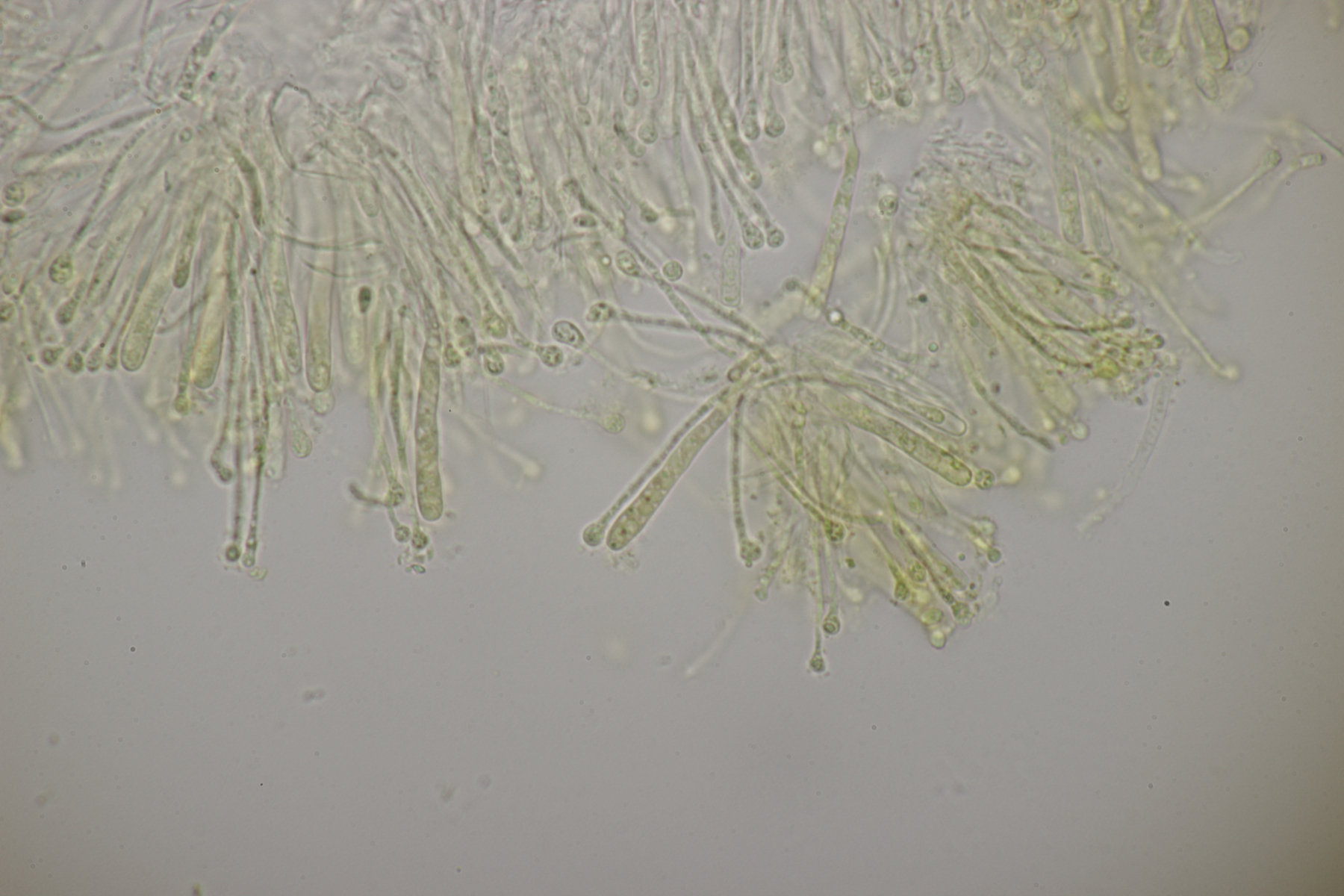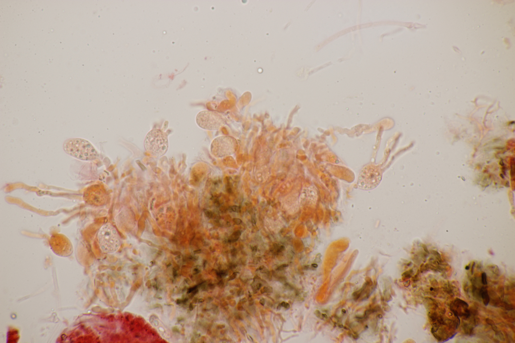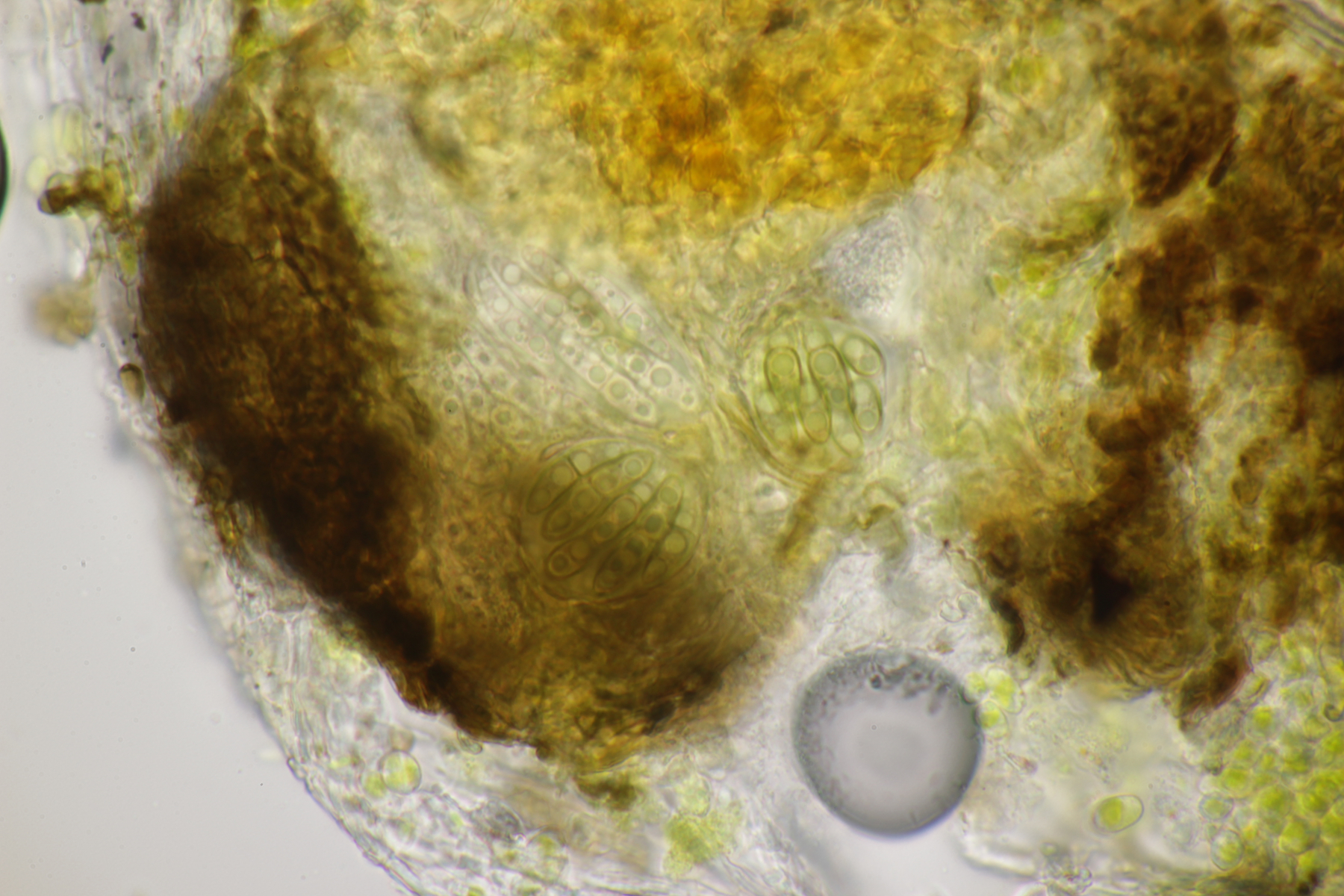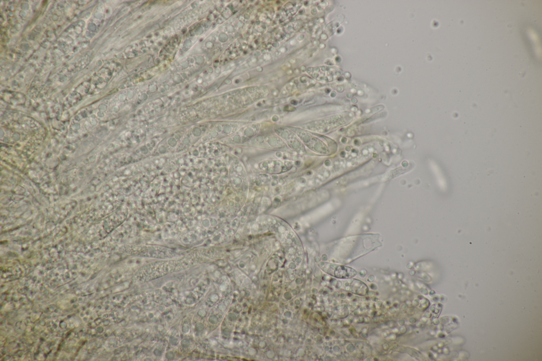 3. Ebenfalls an Eiche. Im Feld dachte ich hier erstmal an irgendwelche Heterobasidiomyceten, aber im Mikroskop zeigten sich dann Schläuche. Die Sporen messen (14.7-17.1) µm x (3.8-4.5) µm, Q=3.3-4.4, die Asci reagieren mit Lugol blau und ich meine Haken gesehen zu haben. Paraphysen konnte ich keine entdecken. Hat jemand hier eine Idee?