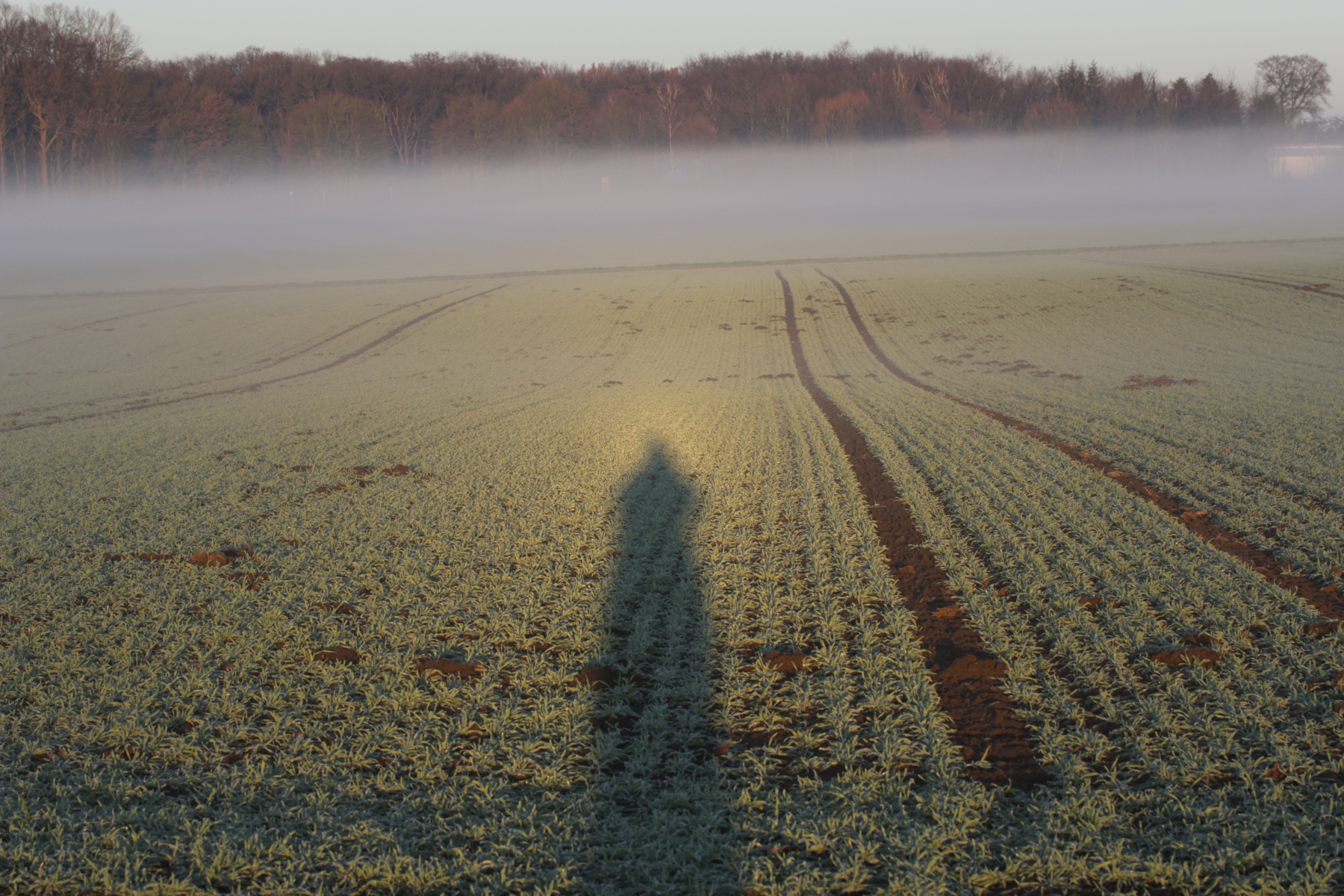 Los ging es aber mit strahlendem Sonnenschein, etwas Reif und Nebel, der sich in einer Geländemulde angesammelt hatte. In Kombination konnte man dann sehr schön sehen, wie erleuchtet ich bin ![]()