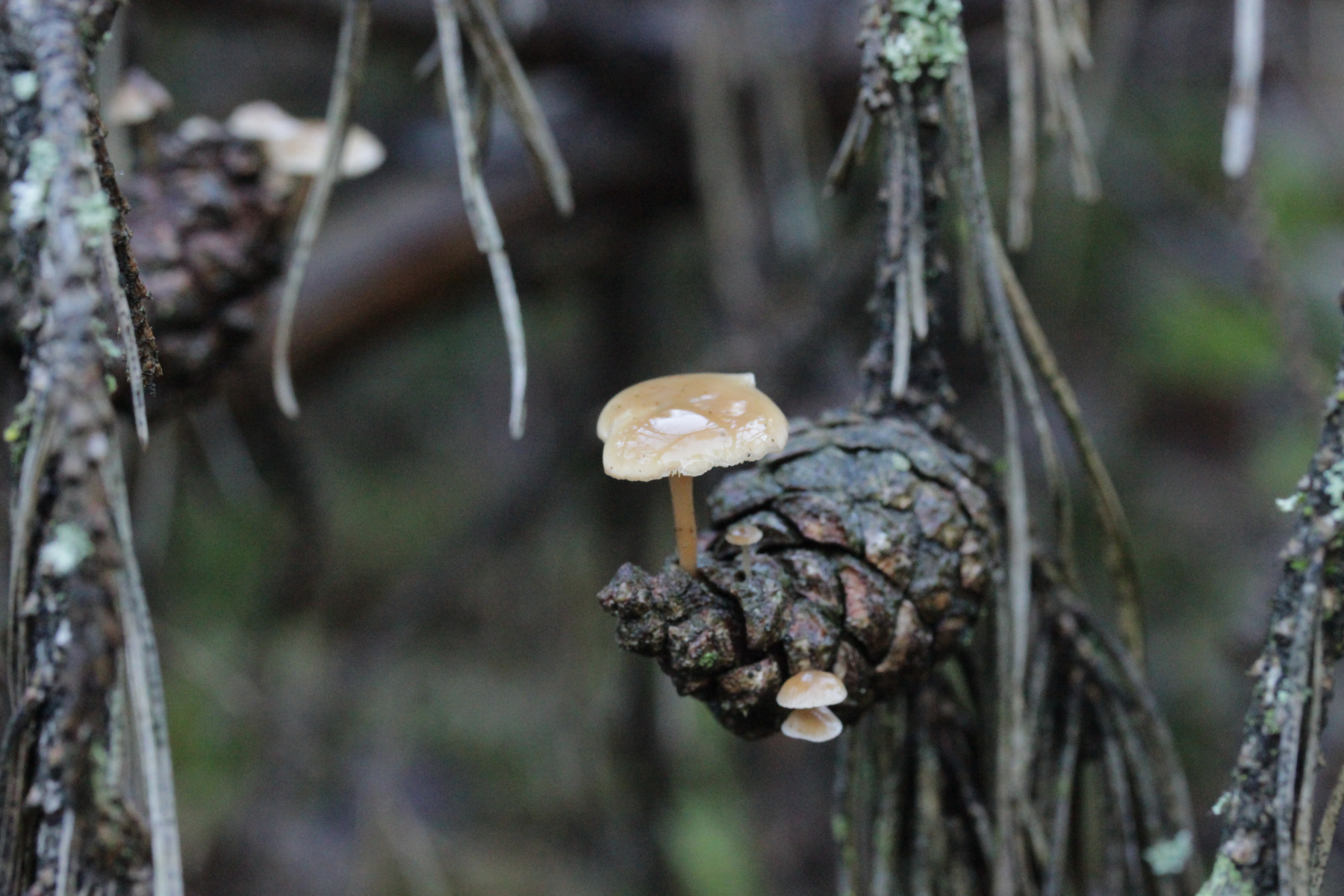 7. Warum immer nur Kiefernzapfen auf dem Boden befallen? Wenn man sich einen Zapfen schnappt, der in der Luft hängt, kann man seine Sporen viel besser verbreiten, dachte sich diese Baeospora myosura