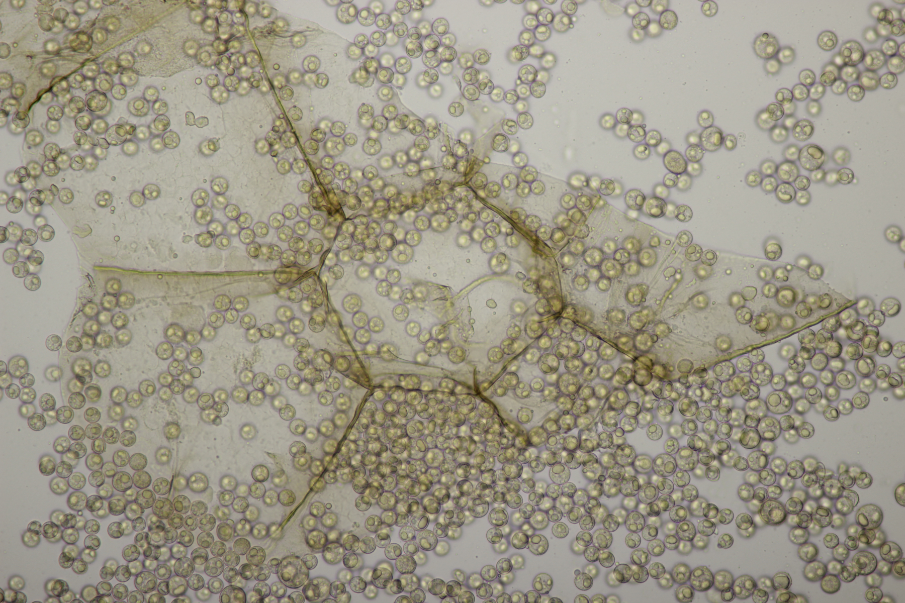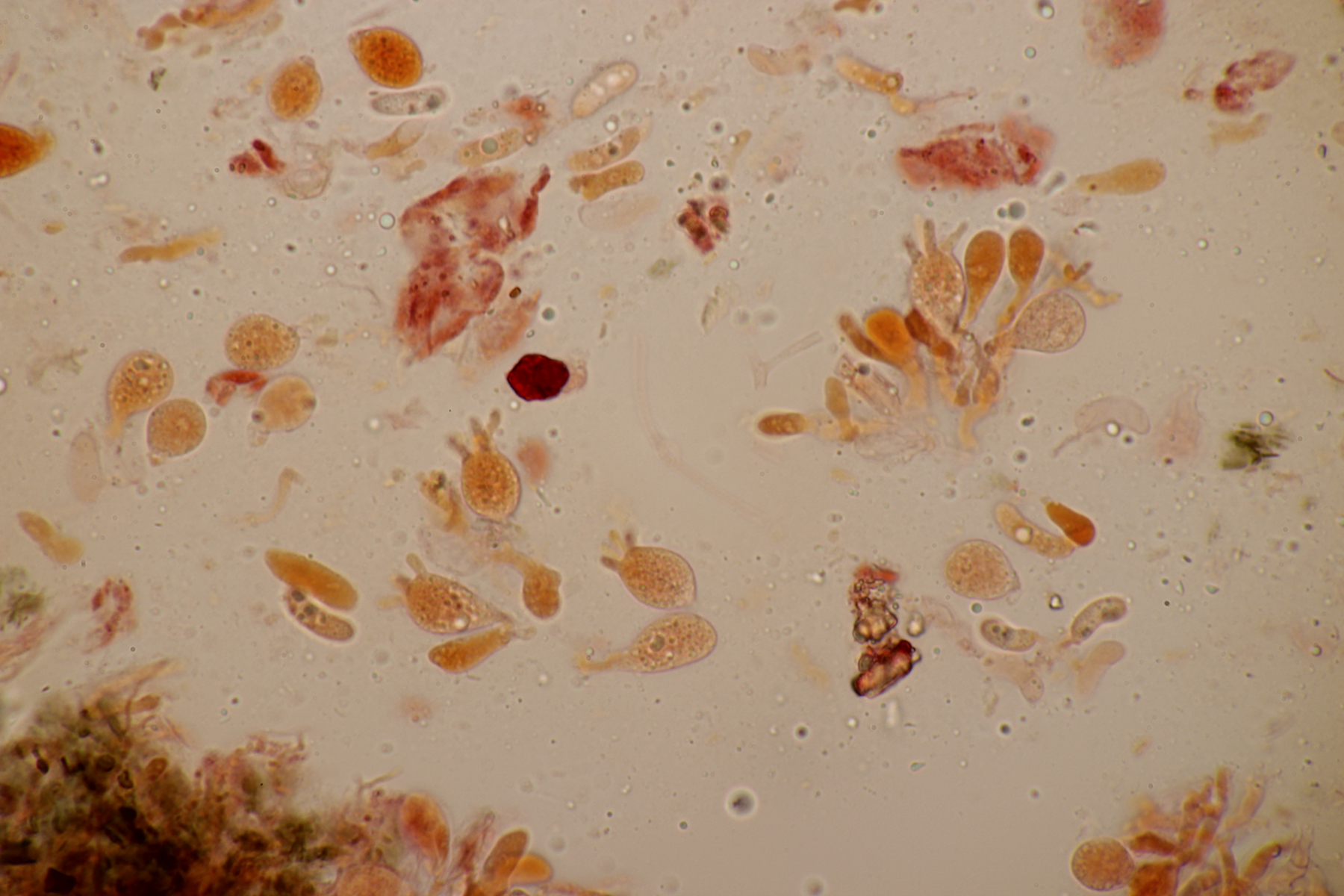 2. An einem Eichenast gab es dann Pyrenomyceten, die ich mir nicht näher angeschaut habe. Darauf saßen aber hübsche kleine Becher, die sich unterm Mikroskop dann als Orbilia entpuppten. Immerhin konnte ich diesmal einige Sporen erkennen. Diese sind eiförmig bis elliptisch, messen (3-3,5) x (2-2,5) µm und haben einen runden Tropfen., der ungefähr 1 µm Durchmesser hat. Des weiteren sind die Paraphysen oben verdickt und die Asci haben einen doppelten Fuß.