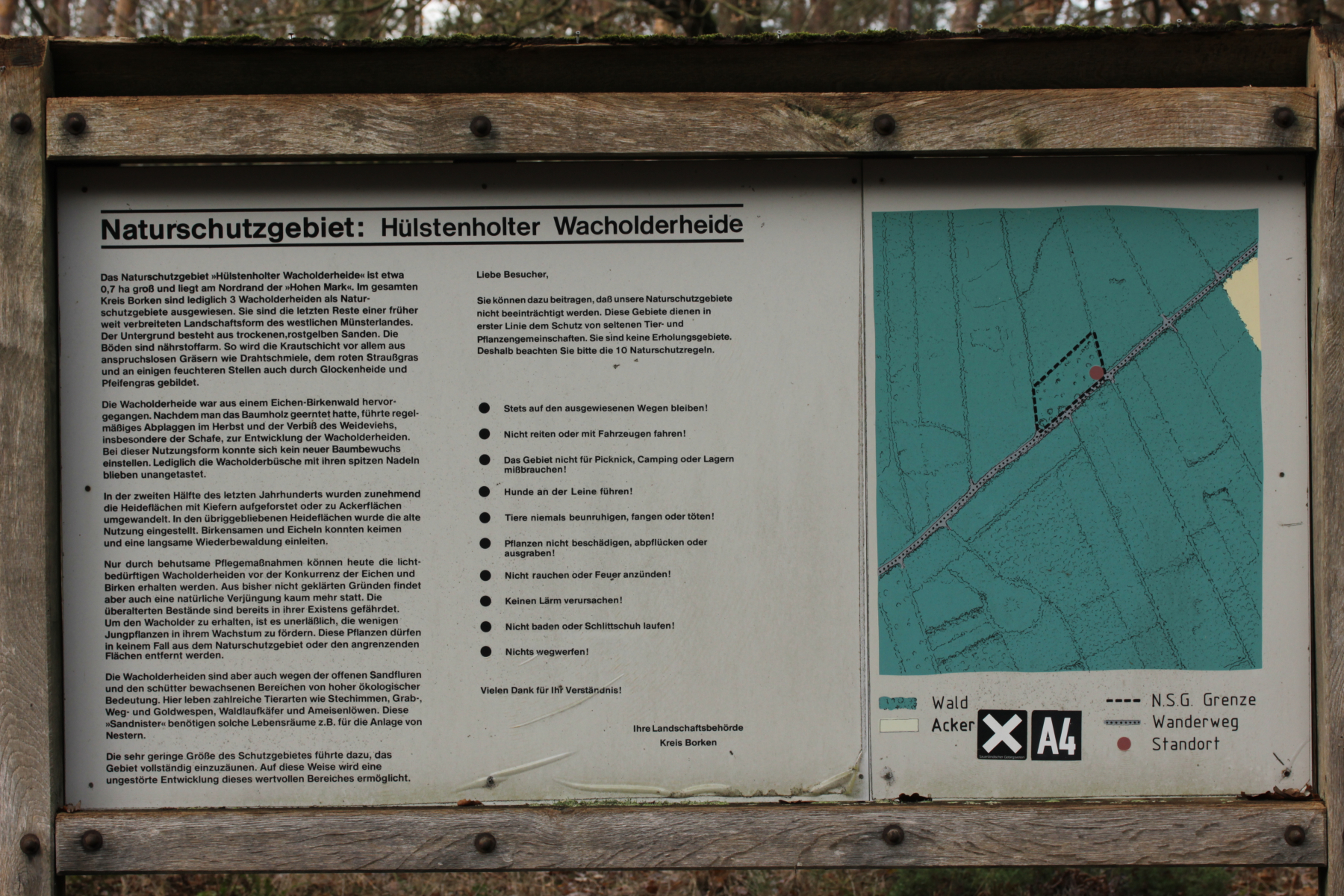 Und zum Schluß noch ein wichtiger Hinweis: In der Hülstenholter Wacholderheide darf man weder Baden noch Schlittschuhlaufen. Mir ist zwar schleierhaft, wie man ohne Wasser auch nur auf die Idee kommen sollte, das zu tun.... aber was weiß ich schon ![]()
