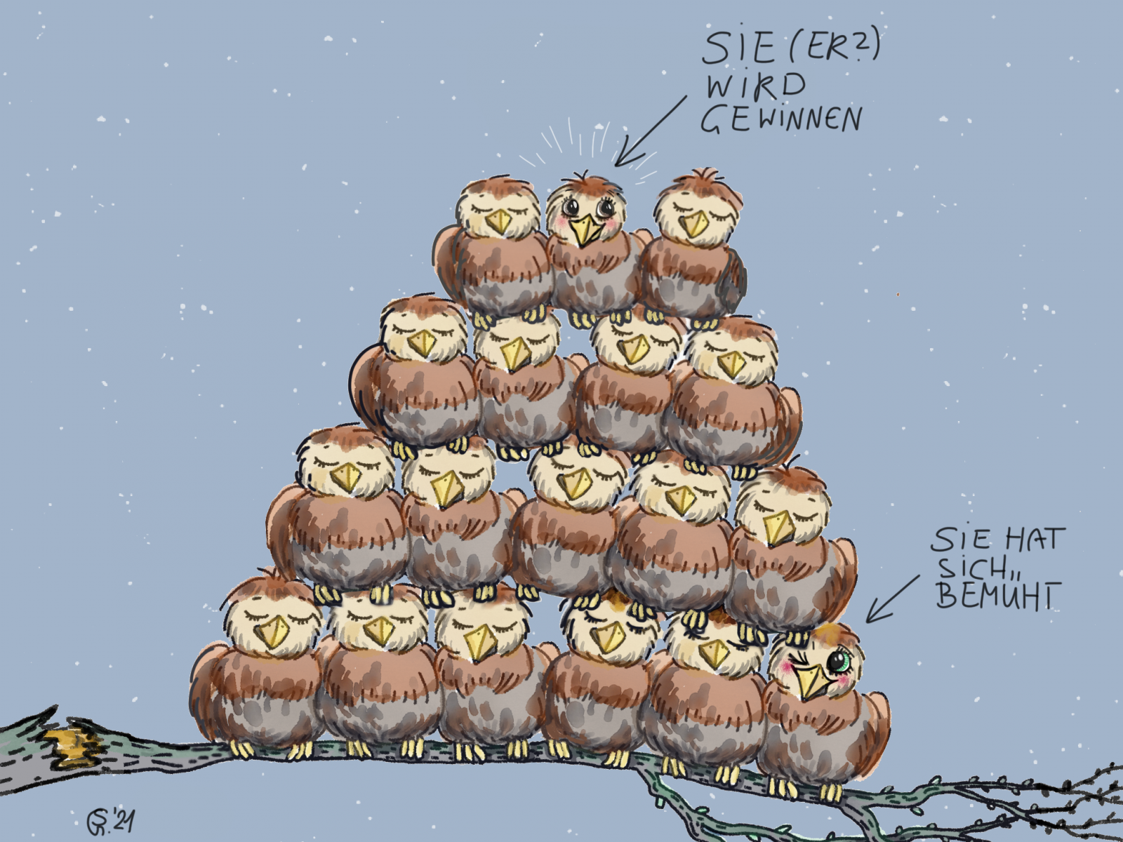 Gnobet zählt 18 wo 19 sind (ok., der obere Spatzi sitzt nicht mehr, jetzt ist auch bei mir der Groschen gefallen. Wenn man die Erbsenzählerei natürlich ausreizt, sitzen auch nicht 18 auf dem Ast, sondern nur 6).
