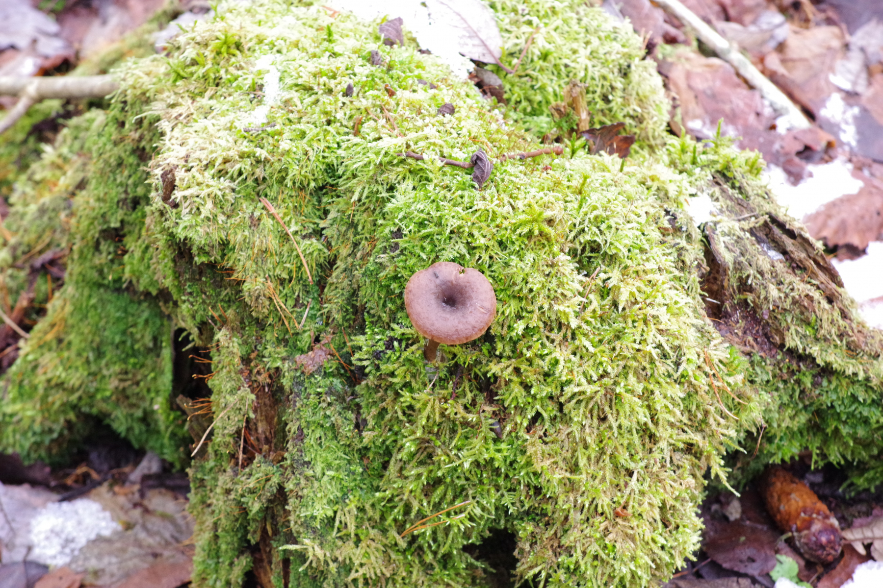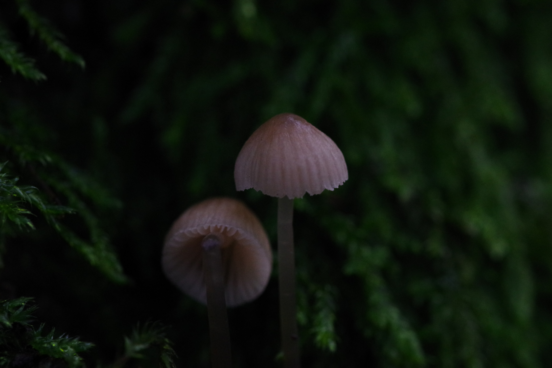 2) deutlich größere Helmlinge an Moosbesatz einer älteren Fichte
