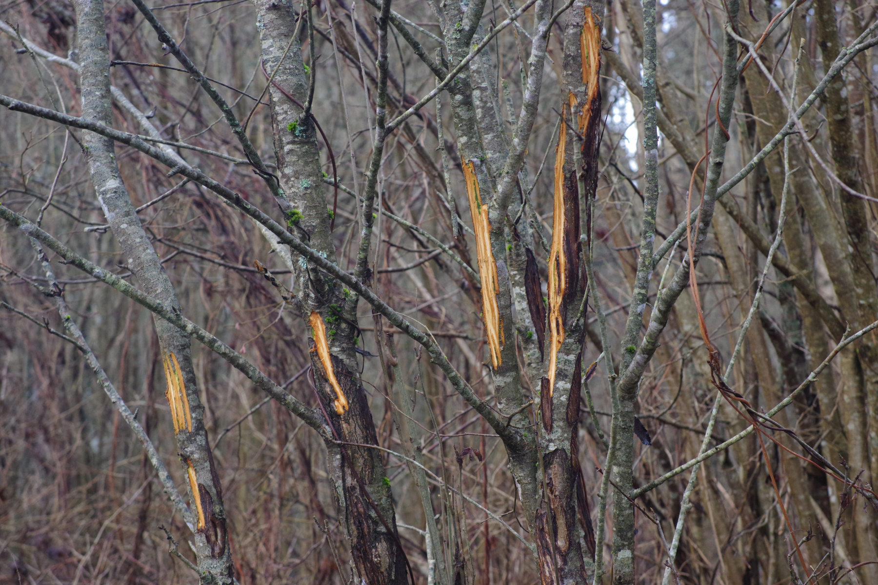 10) vorgestern traf ich hier einen Elch, genauer, eine Elchdame, die vor Schreck erstmal umfiel; das sind die frischen Knabberspuren in 2 m Höhe