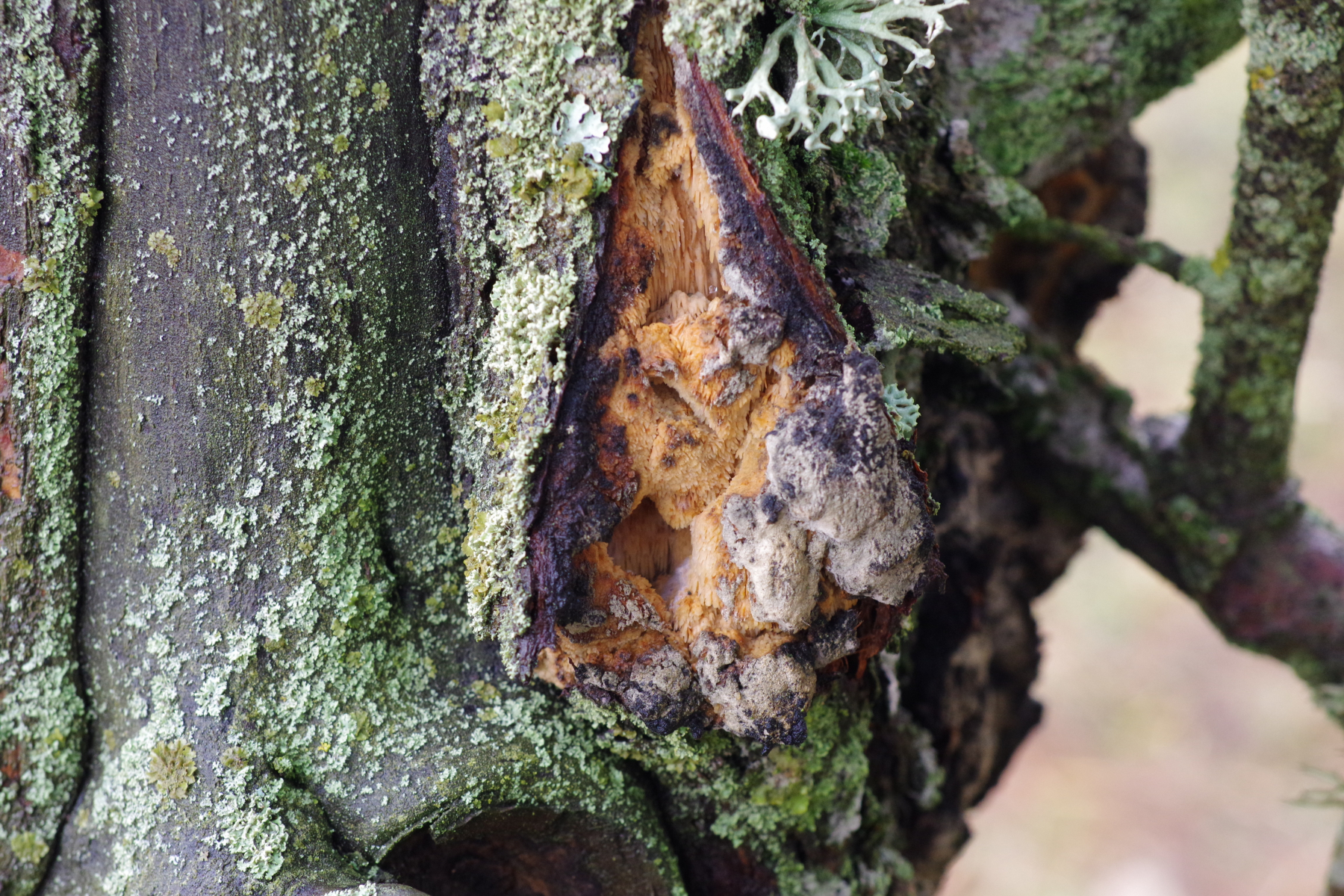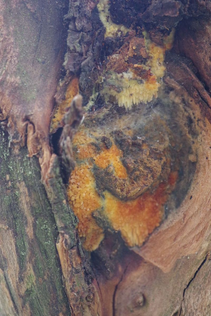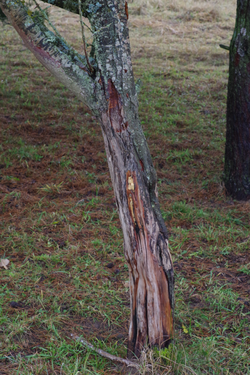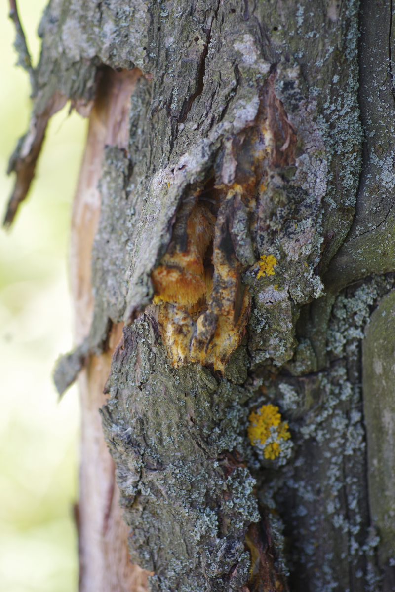 Hallo allerseits, an diesem toten Apfelbaum (15-20 Jahre, wild gekommen, den haben die Schafe auf dem Gewissen) auf der Weide habe ich heute diesen teilweise vom Pferd abgeschubbelten Pilz entdeckt.