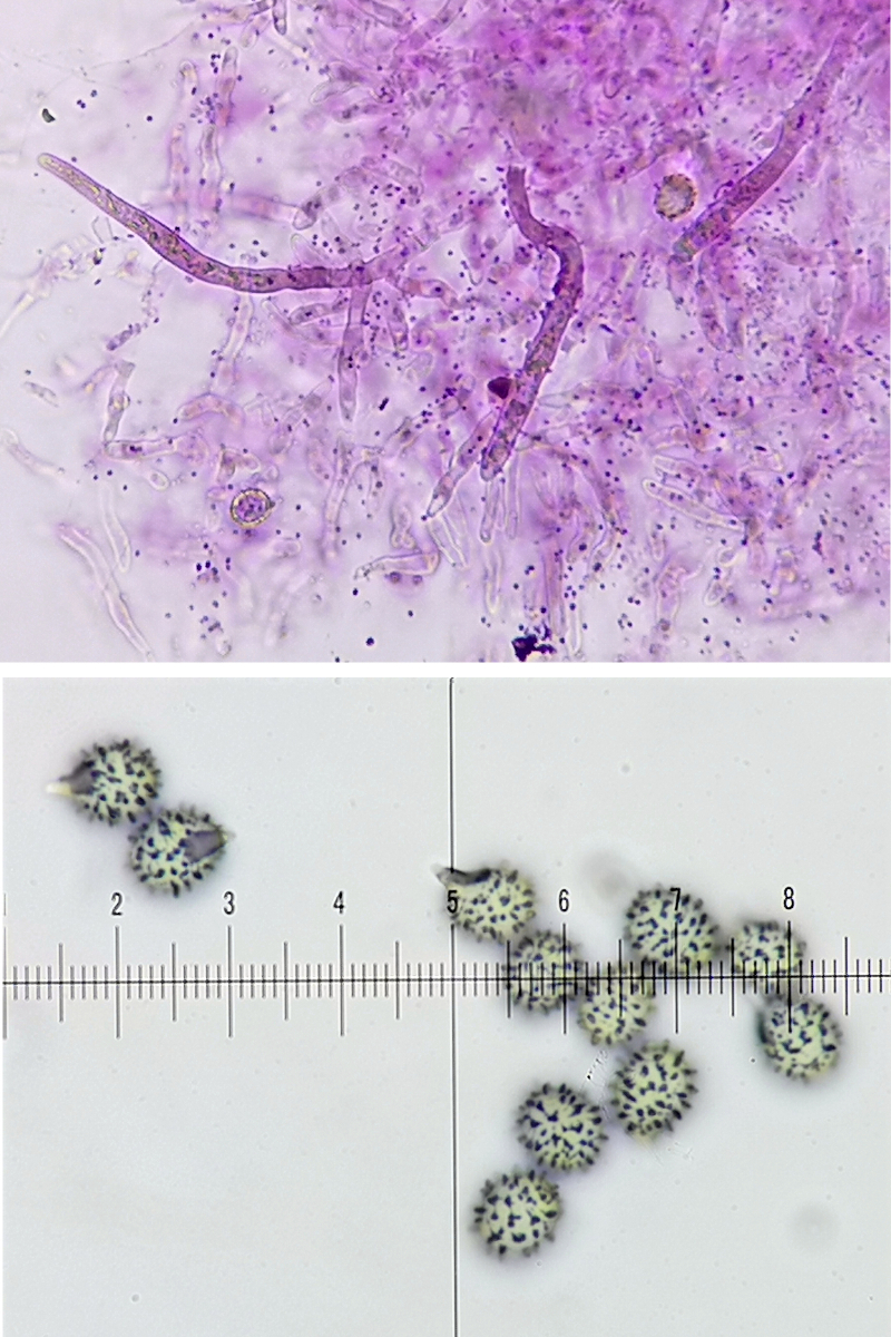 R20-041-1, teils mehrfach septierte Pileozystiden mit typischer Kopfform der R. fragilis, und eine Sporengegenüberstellung