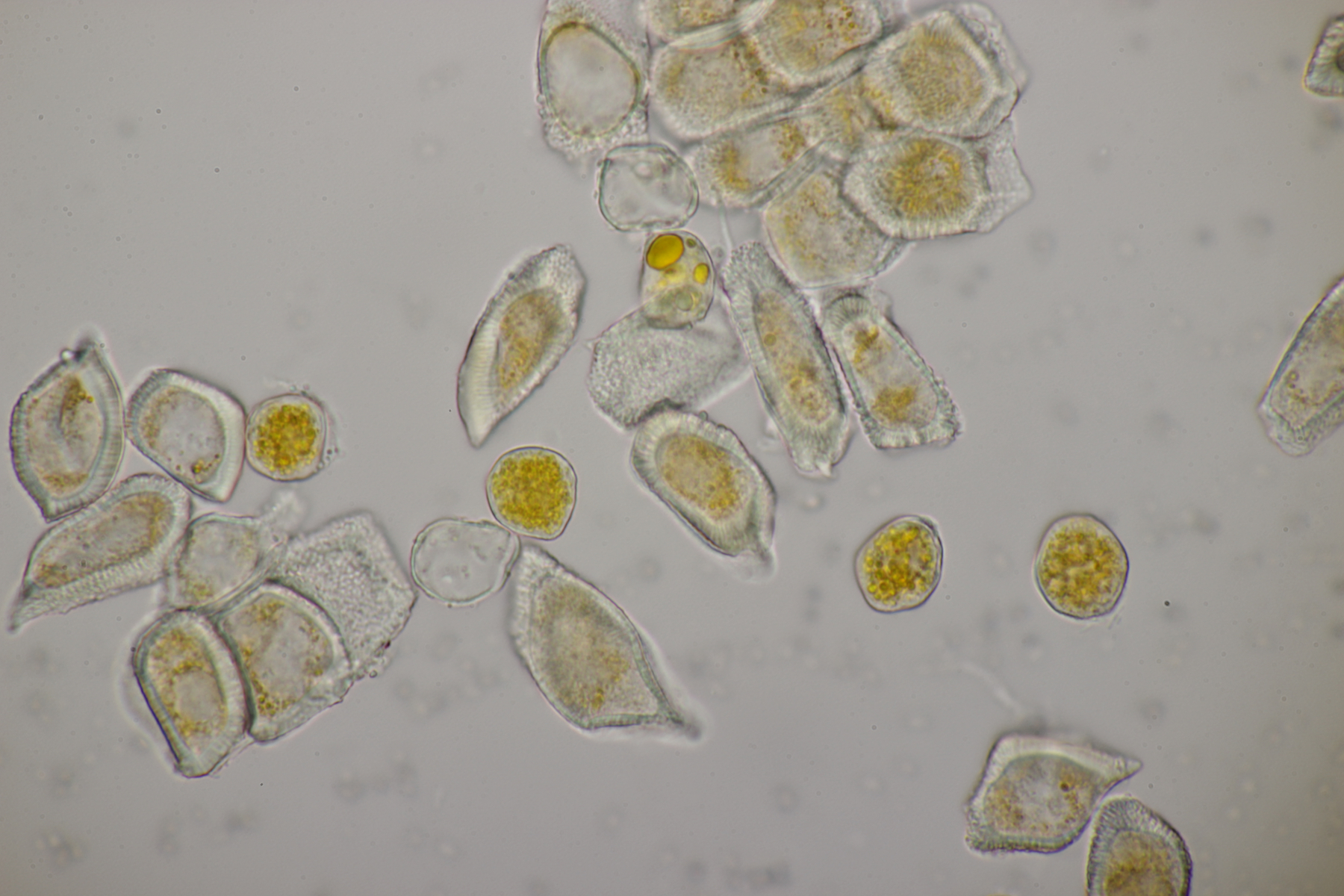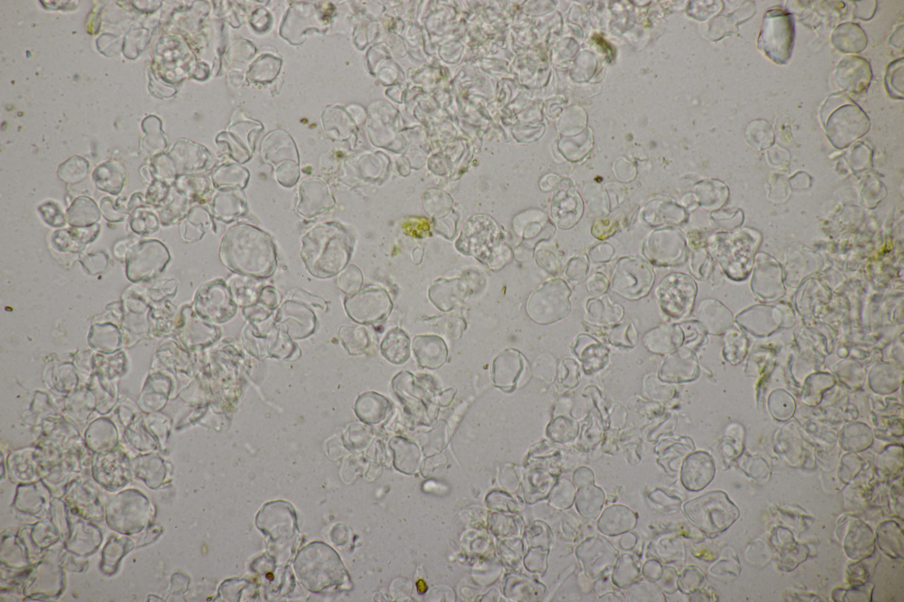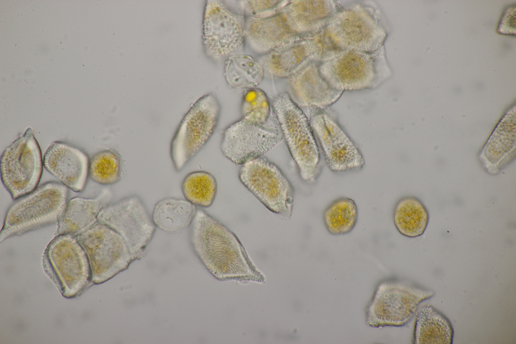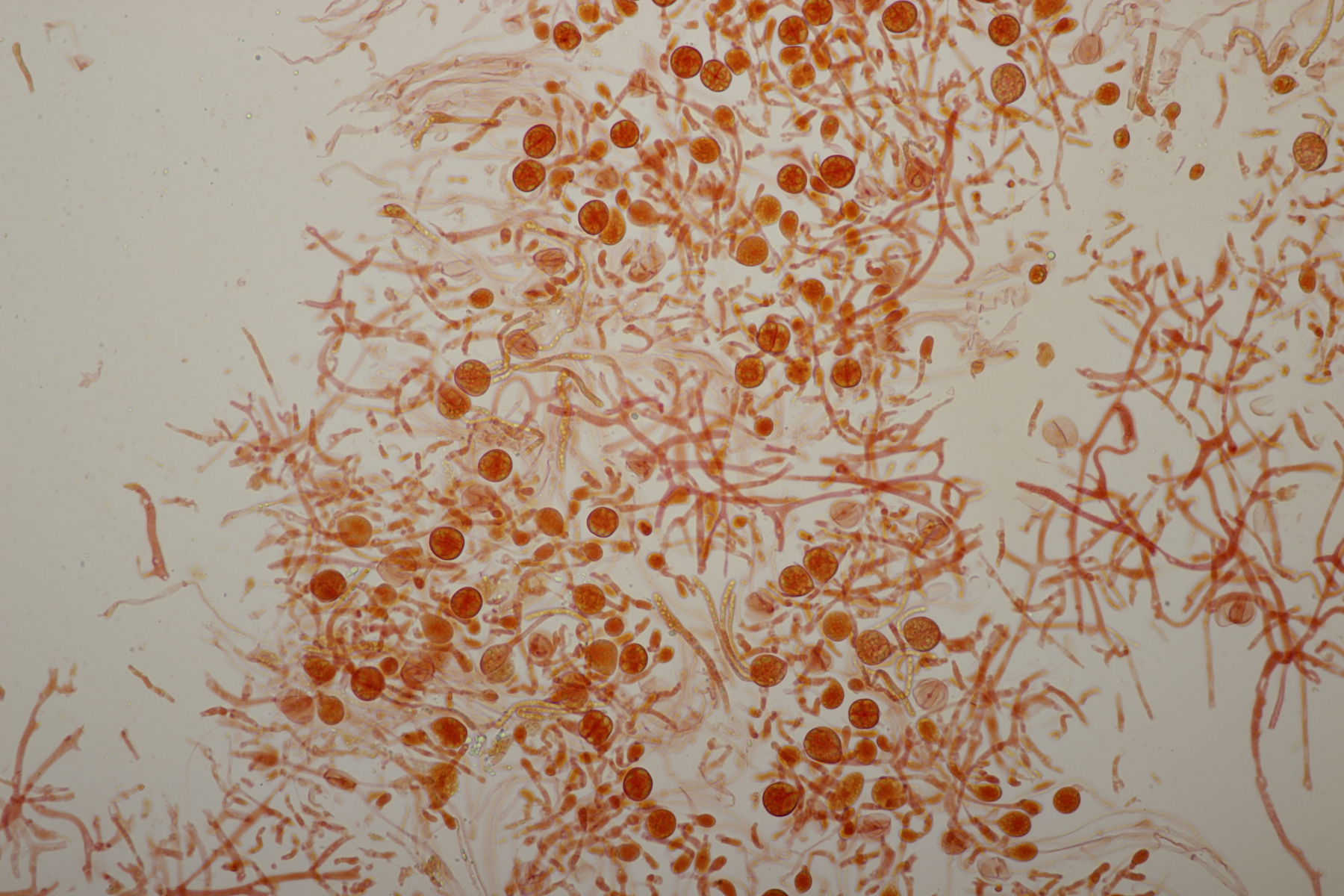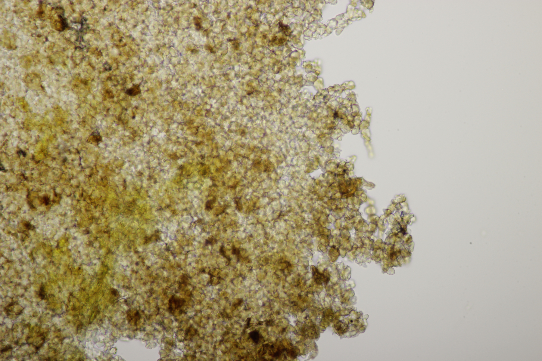 7. Hier dachte ich erst an einen hübschen Rindenpilz auf Brombeere. Aber im Mikroskop gab es dann nur unförmige Zellen. Vielleicht ein Schleimpilz-Sklerotium? Ich hab das Ganze jetzt mal in die feuchte Kammer gestellt und beobachte, was passiert.