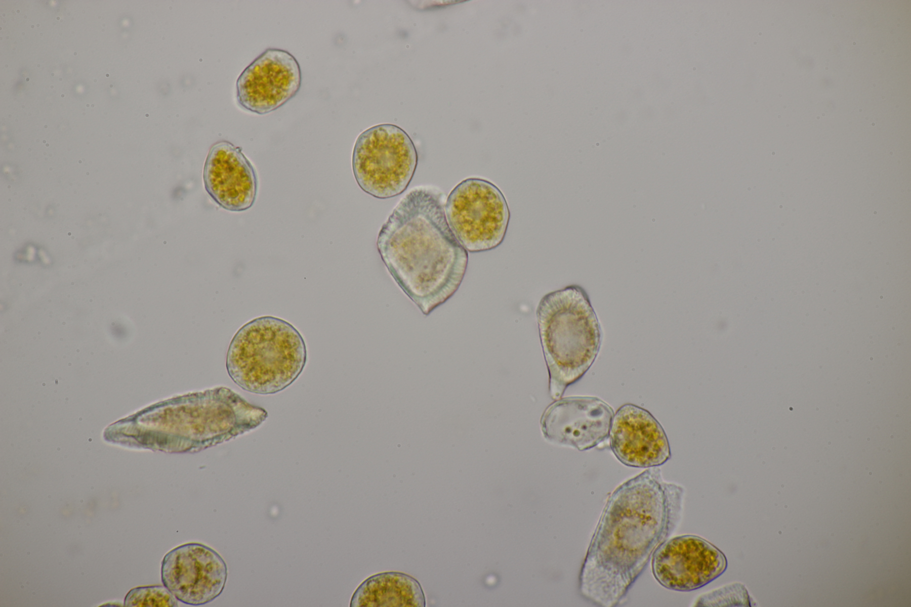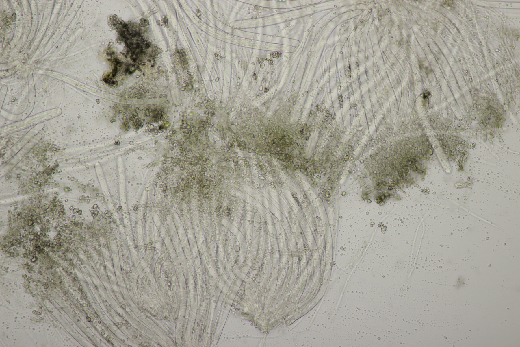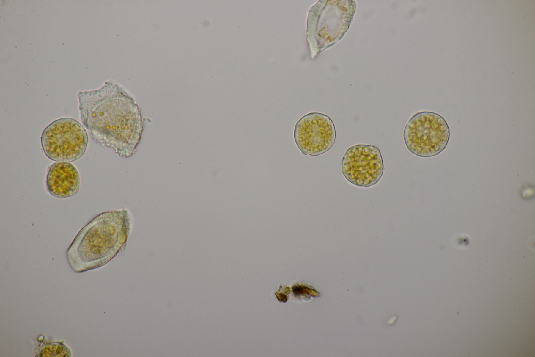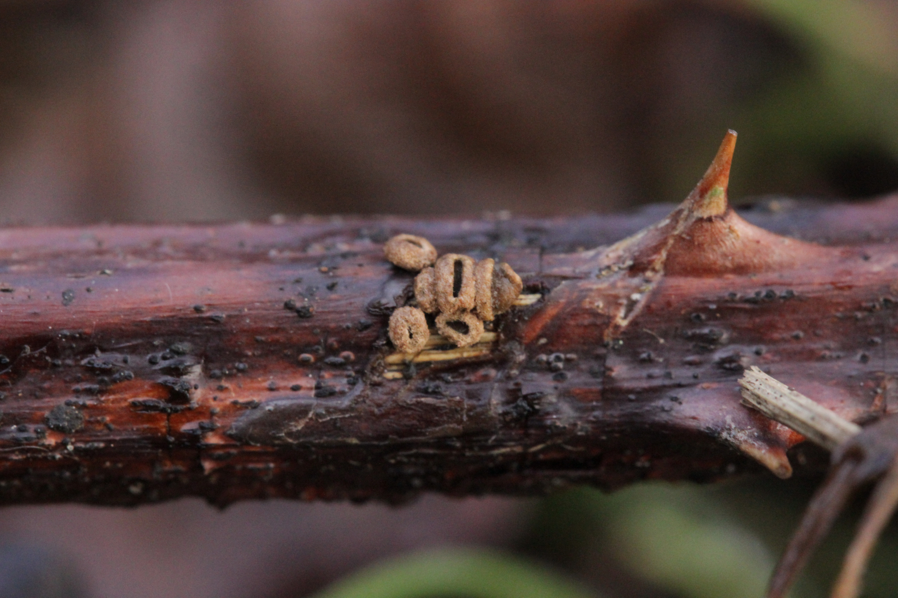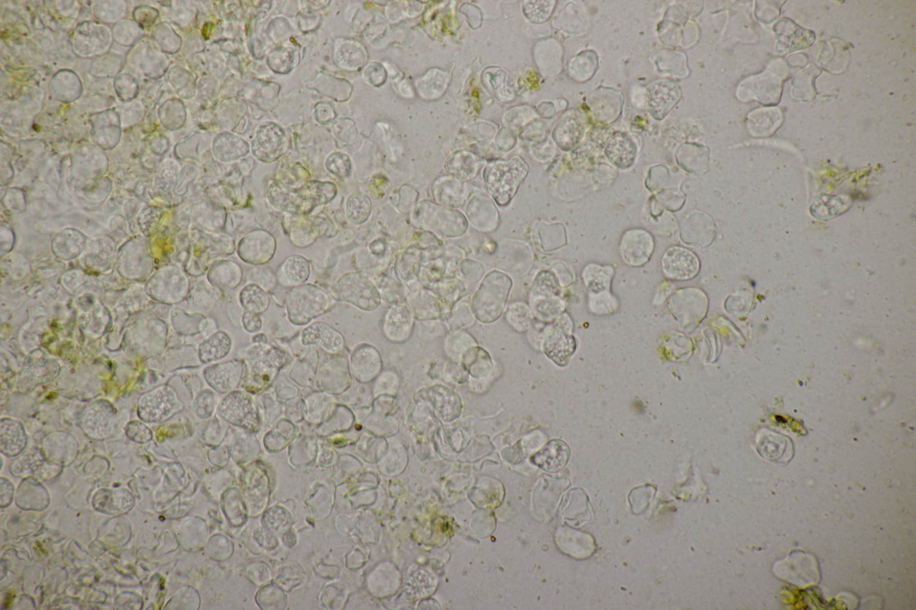 7. Hier dachte ich erst an einen hübschen Rindenpilz auf Brombeere. Aber im Mikroskop gab es dann nur unförmige Zellen. Vielleicht ein Schleimpilz-Sklerotium? Ich hab das Ganze jetzt mal in die feuchte Kammer gestellt und beobachte, was passiert.