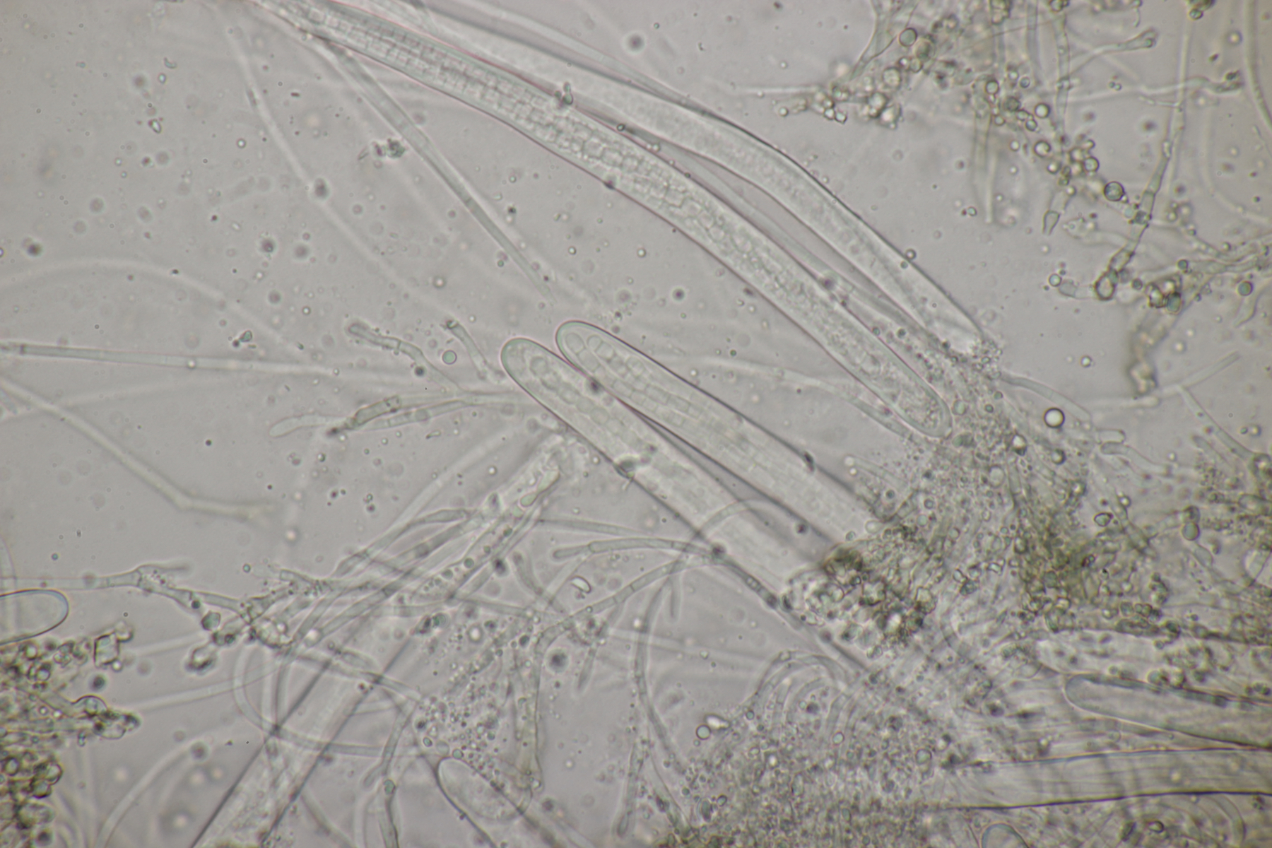 5. Das scheint das zu sein, was Zotto unter Schizoxylon compositum inamyloid führt, gefunden auf Rubus fruticosus agg. Als ich den Pilz fotografierte, sprachen mich die beiden oben schon erwähnten Damen an. Ich erklärte, daß ich Pilze suche, allerdings nicht zum Essen und zeigte ihnen meinen Fund. Sie befanden, daß das in der Tat sehr winzige Pilze sein und wollten wissen, wie die aussehen, wenn sie mal fertig sind. Als ich dann erläuterte, daß die Fruchtkörper schon reif sind und nicht mehr weiter wachsen, waren sie dann doch etwas erstaunt.