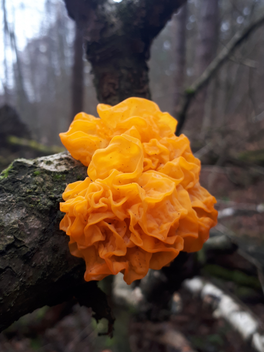Das Holz dürfte nicht so relevant sein. Die Doppelgänger-Art Tremella aurantia parasitiert auf Schichtpilzen (Stereum hirsutum) und die weitaus häufigere Tremella mesenterica parasitiert auf Peniophora-Arten, die aber meist nicht sichtbar sind.