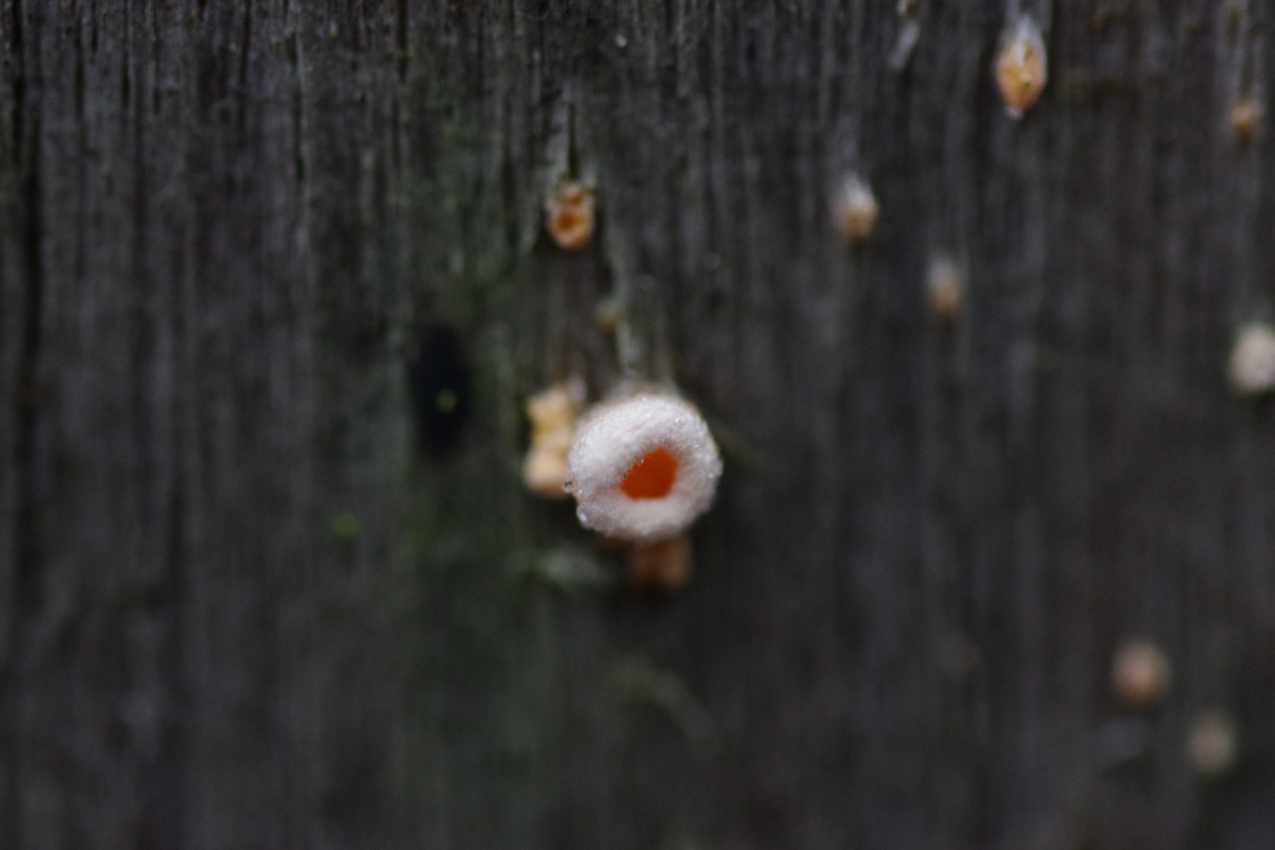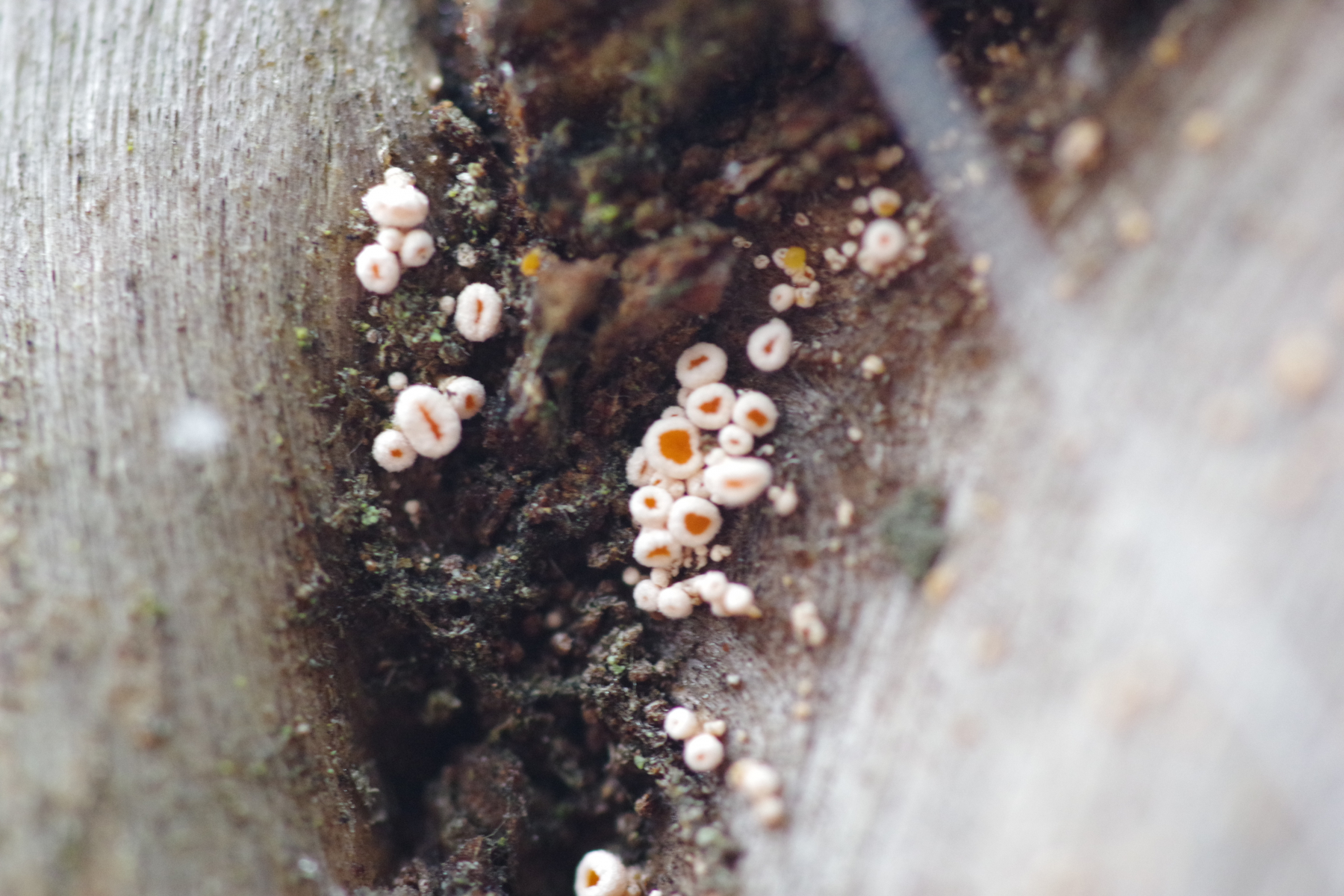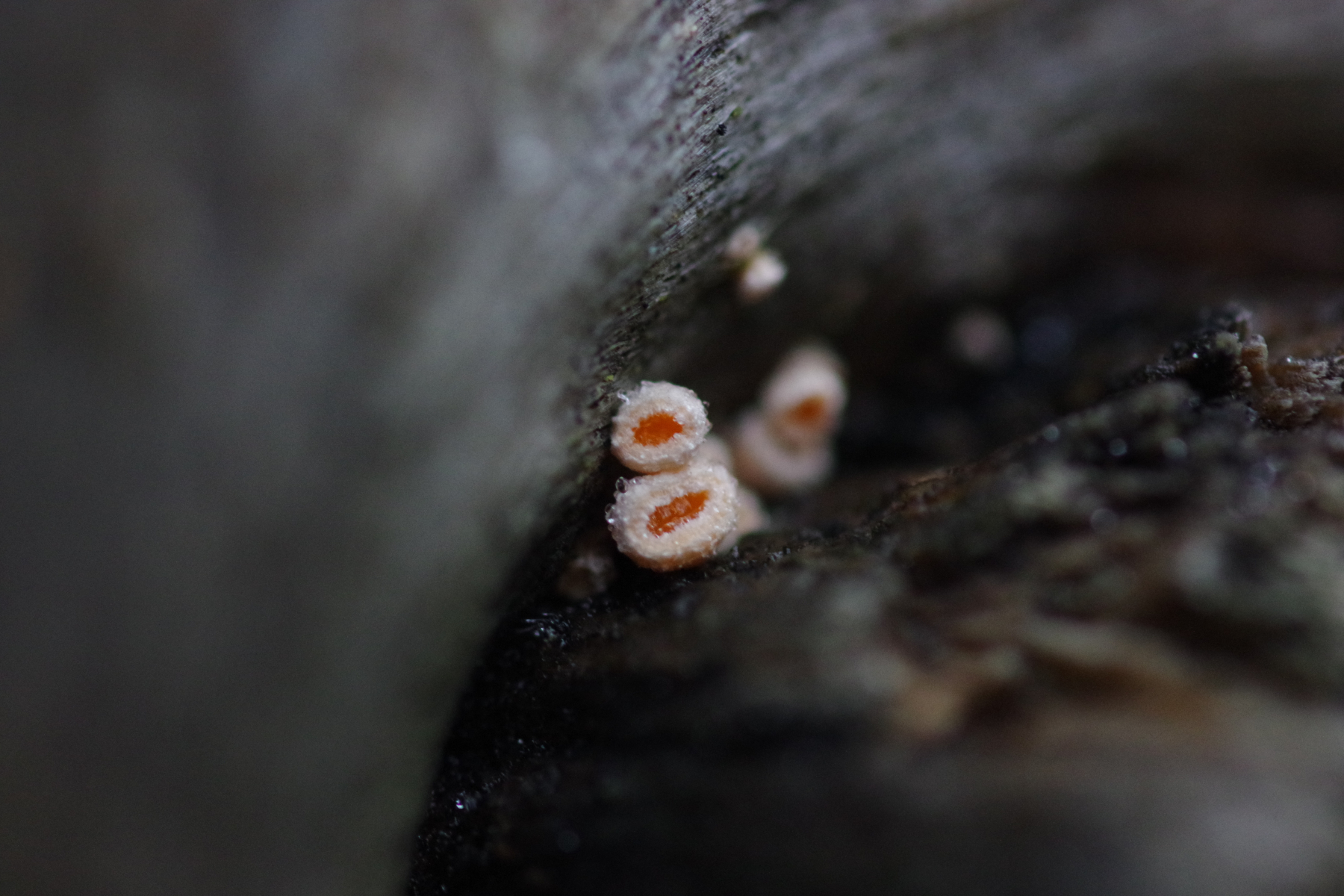 Hallo allerseits, beim Neujahrsspaziergang hatte ich den Becher ja schon mit gezeigt. Mittlerweile habe ich versucht herauszufinden was das sein könnte. Ja, ich weiß, das ist Häresie ohne Mikroskop - mea culpa. Substrat (tote Kiefer, direkt auf rindenfreiem Holz, überwiegend an harzigen Stellen), Haarigkeit und Farbe legen die Gattung Lachnellula dar. Da kann man dann etliche Arten ausschließen, die auf anderes Substrat spezialisiert sind (anhand der Angaben im Schlüssel von Baral, o.J., den man im Netz finden kann). Von dem was übrigbleibt, finde ich L. resinaria besonders passend, immer in der Hoffnung, dass ein Epithet manchmal auch sinnvoll sein kann (resinaria - harzig), weil der Pilz bevorzugt auf harzigen Stellen wachsen soll. Das würde passen, an harzigen Stellen tritt der im Cluster auf, sonst am Holz nur vereinzelt, und auch dort sind Harztröpfchen zu sehen (Bild 3). Die heimische Literatur (Kutorga, 2020) nennt 7 Arten der Gattung, ist aber kaum als vollständig anzusehen, für L. resinaria gibt es dort nur einen Fund auf Fichte vom April.