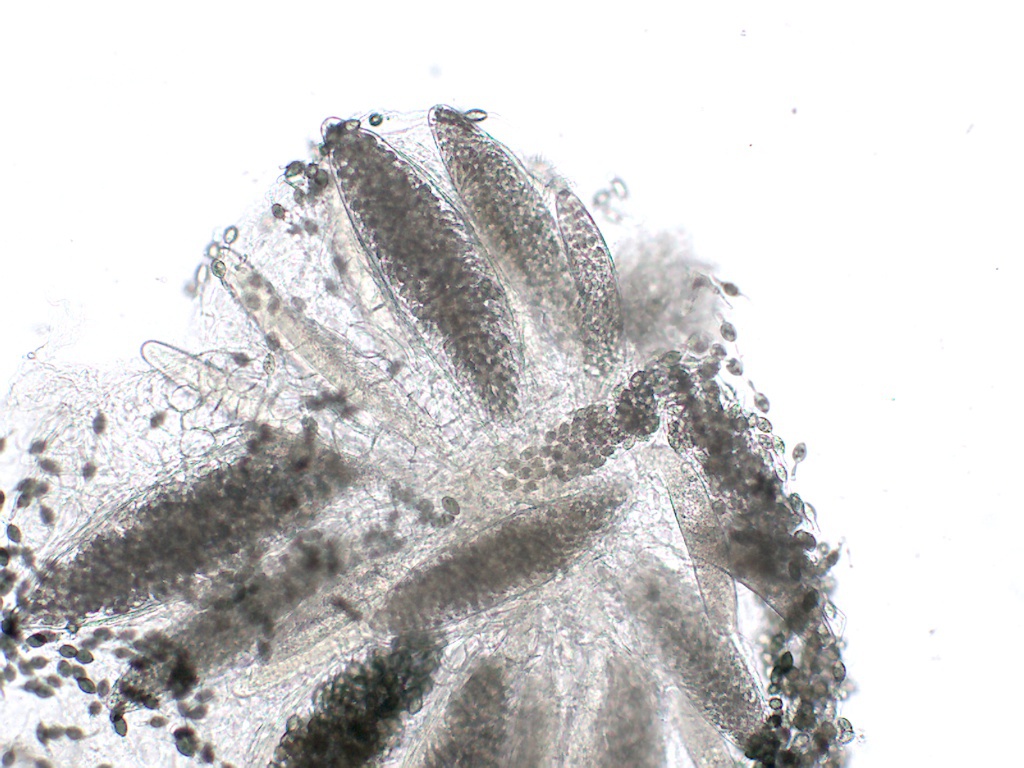 Das Problem ist das abschätzen der Sporenzahl im Ascus. Da der Ascus aussergewöhlich groß daherkommt, konnte ich mit der Präpariernadel einen halbreifen Ascus isolieren und etwas quetschen. Dabei kam ich eindeutig auf weit mehr als 200 Sporen. Somit waren P. setosa und P. bifida mit ihren 128 Sporen raus. Für P. curvicolla mit seinen 256 Sporen sind die Sporen zu klein. Was dann blieb war P. granulostiata mit nochmehr Sporen.