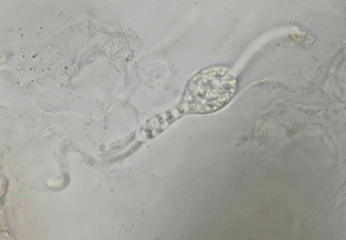 Das Problem ist das abschätzen der Sporenzahl im Ascus. Da der Ascus aussergewöhlich groß daherkommt, konnte ich mit der Präpariernadel einen halbreifen Ascus isolieren und etwas quetschen. Dabei kam ich eindeutig auf weit mehr als 200 Sporen. Somit waren P. setosa und P. bifida mit ihren 128 Sporen raus. Für P. curvicolla mit seinen 256 Sporen sind die Sporen zu klein. Was dann blieb war P. granulostiata mit nochmehr Sporen.