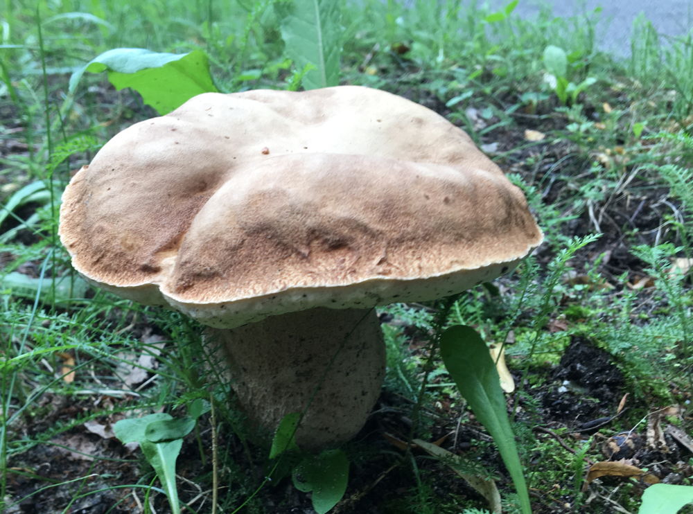 Ein Riesensteinpilz, leider jenseits von essbar, direkt am Gehweg.