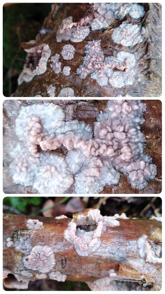 Ich fĂŒrchte, in diese Phlebia mĂŒsste man reinmikroskopieren. FĂŒr Phlebia radiata wĂ€re nicht nur die Farbe, sondern auch die Wuchsform (so knubbelig auf glattem Untergrund?) und vor allem die Kombination aus Wuchsform und Farbspektrum ungewöhnlich. So rein vom Aussehen her wĂŒrde ich da eher an >Phlebia livida s.l.< denken.