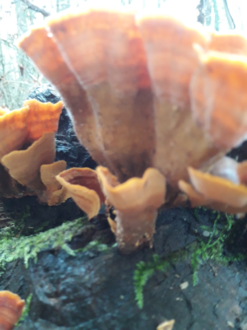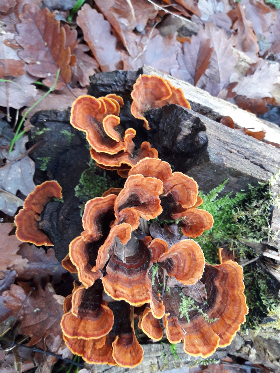 Mit dem Farbspektrum (satte rot-, braun- und orangetöne) und der Wuchsform könnte das auch ganz gut Stereum insignitum (Prächtiger Schichtpilz) sein, wenn das Substrat Rotbuche wäre.