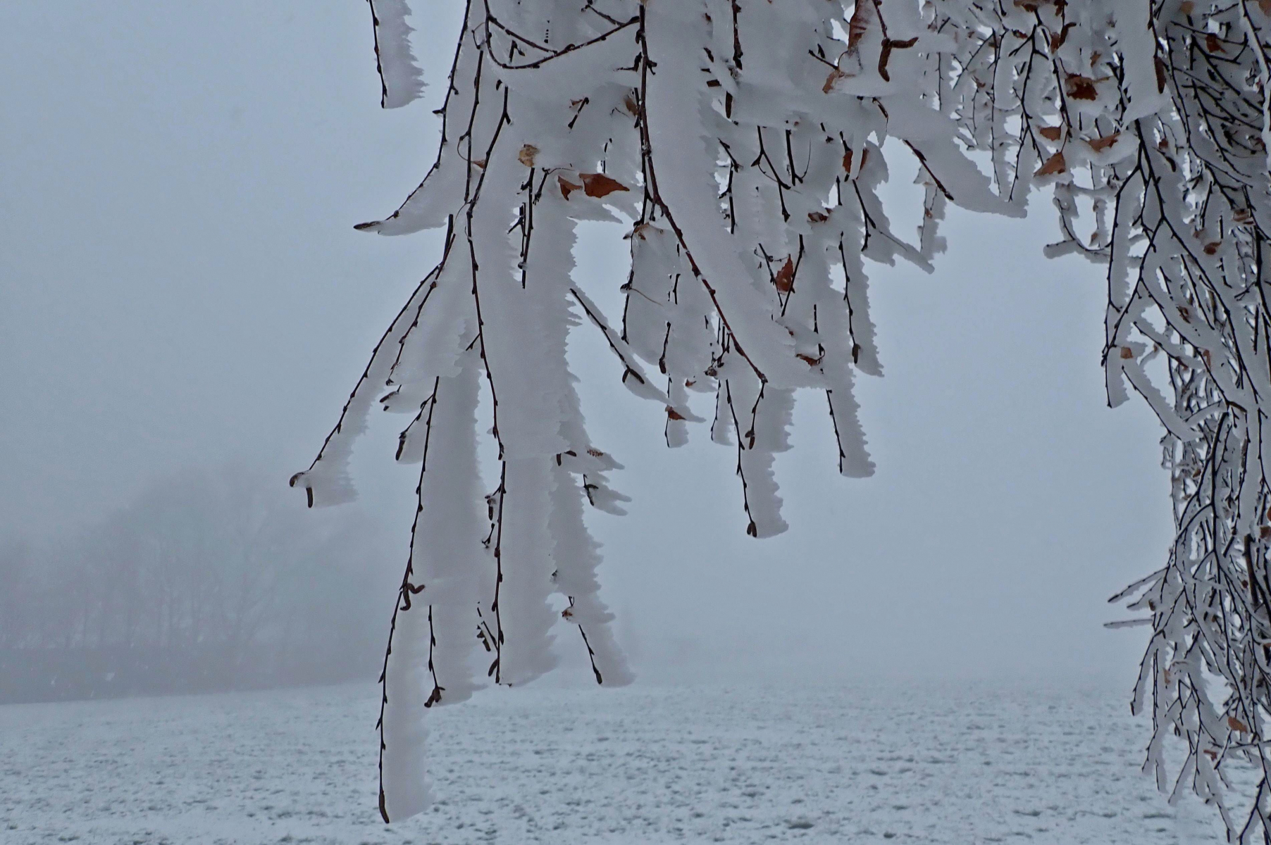 Bei uns sieht es zur Zeit so aus. Schnee, Nebel und "Eisfedern" an Ästen und Gräsern.