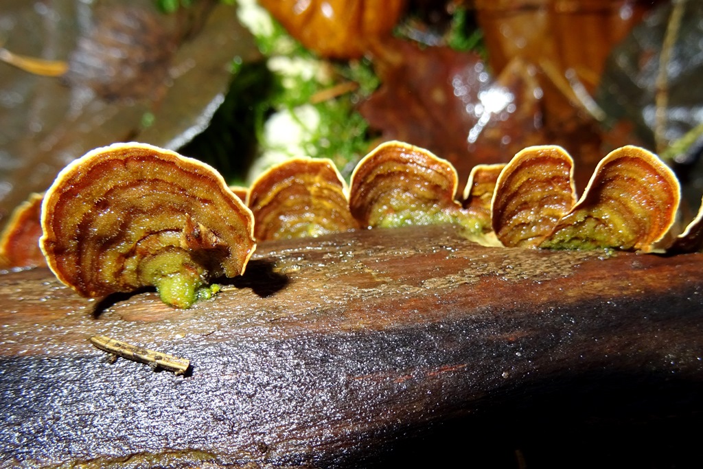 Samtiger Schichtpilz (Stereum subtomentosum) an einem Birkenast.