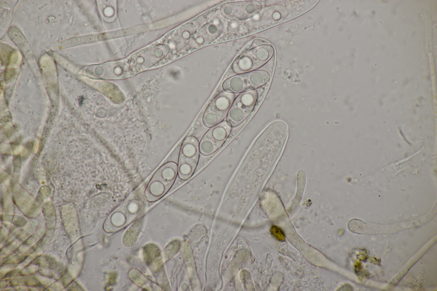 5. Cheilymenia sp., leider ohne Sporen. Die Paraphysenform deutet aber zu C. granulata. Ich hab auch mal was eingesteckt, vielleicht entwickeln sich in der warmen Wohnung ja auch noch ein paar Fruchtkörper mit Sporen.