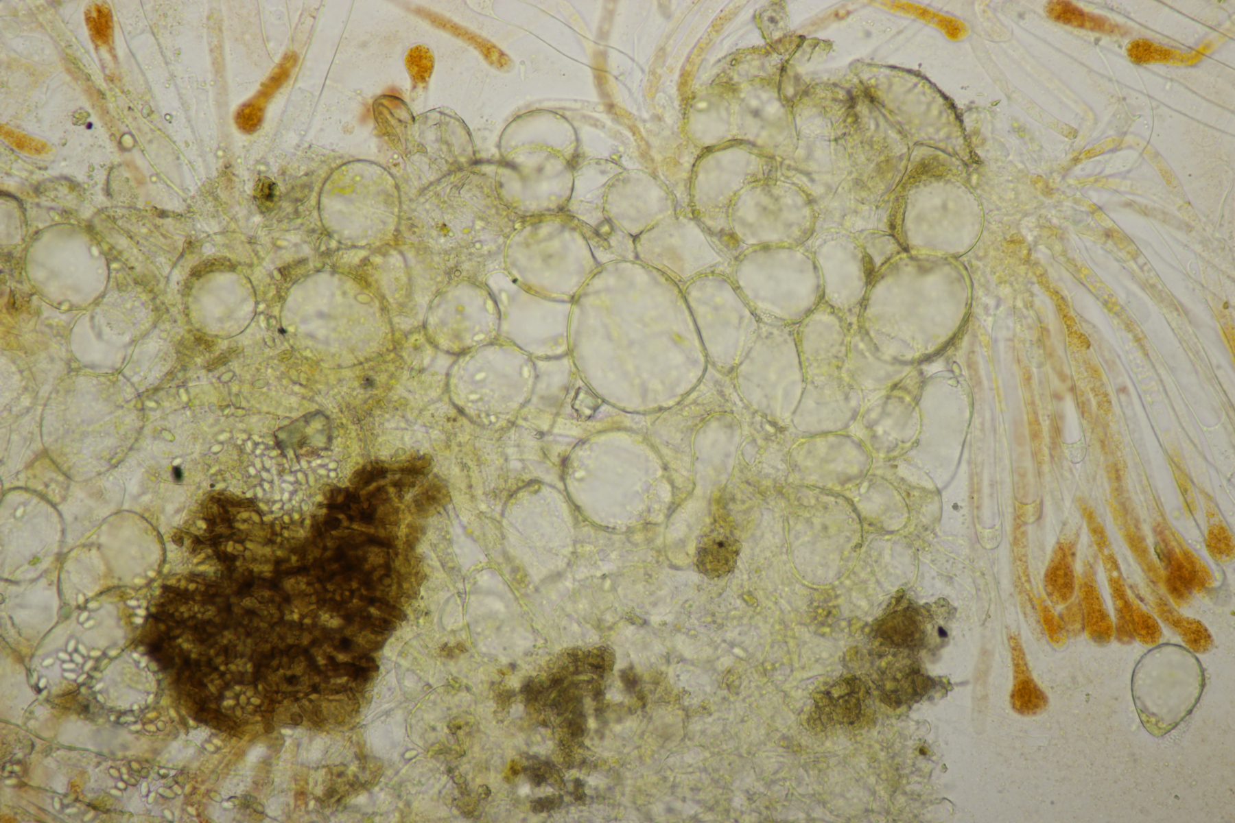 2. Lachnella sp. Makroskopisch ist war ein Violetthauch erkennbar, aber mikroskopisch waren die Haare komplett hyalin.