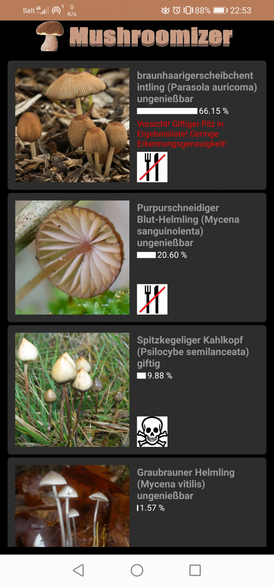 Und der Screenshot: Ja das ist nun etwas verrückt. Ich kann man Ergebnis von gestern nicht rekonstruieren, das App hält den Pilz jetzt für einen Riesenträuschling :/