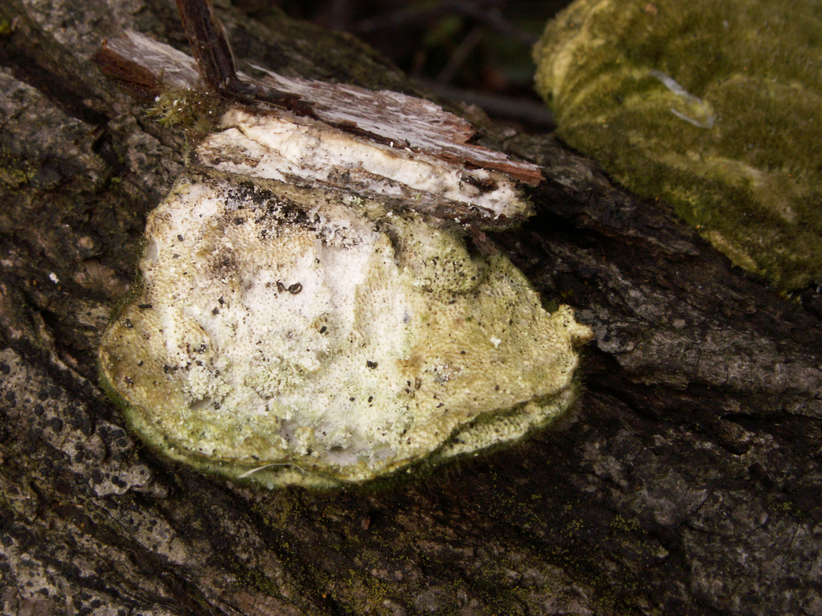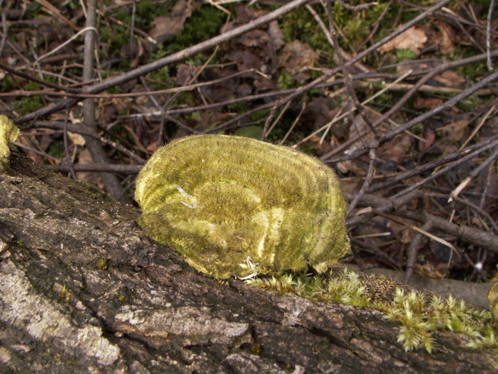 Das hier ist allerdings schon Trametes hirsuta und nicht Trametes trogii, da bin ich mir wegen der Wuchsform, den flachen Fruchtkörpern und der deutlichen strukturellen Zonierung der Hutbehaarung sehr sicher. Auch wenn die ungewöhnlich pelzig ist, aber das kann hirsuta durchaus auch.