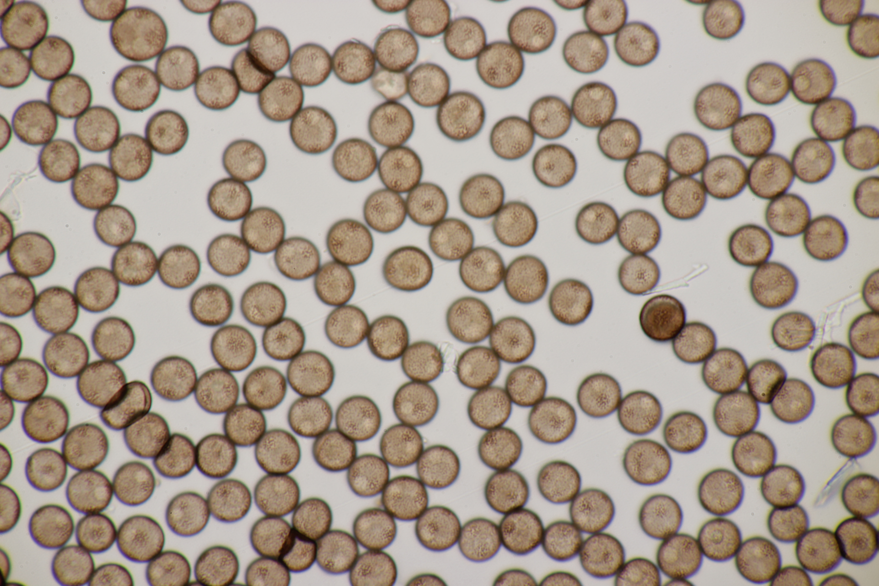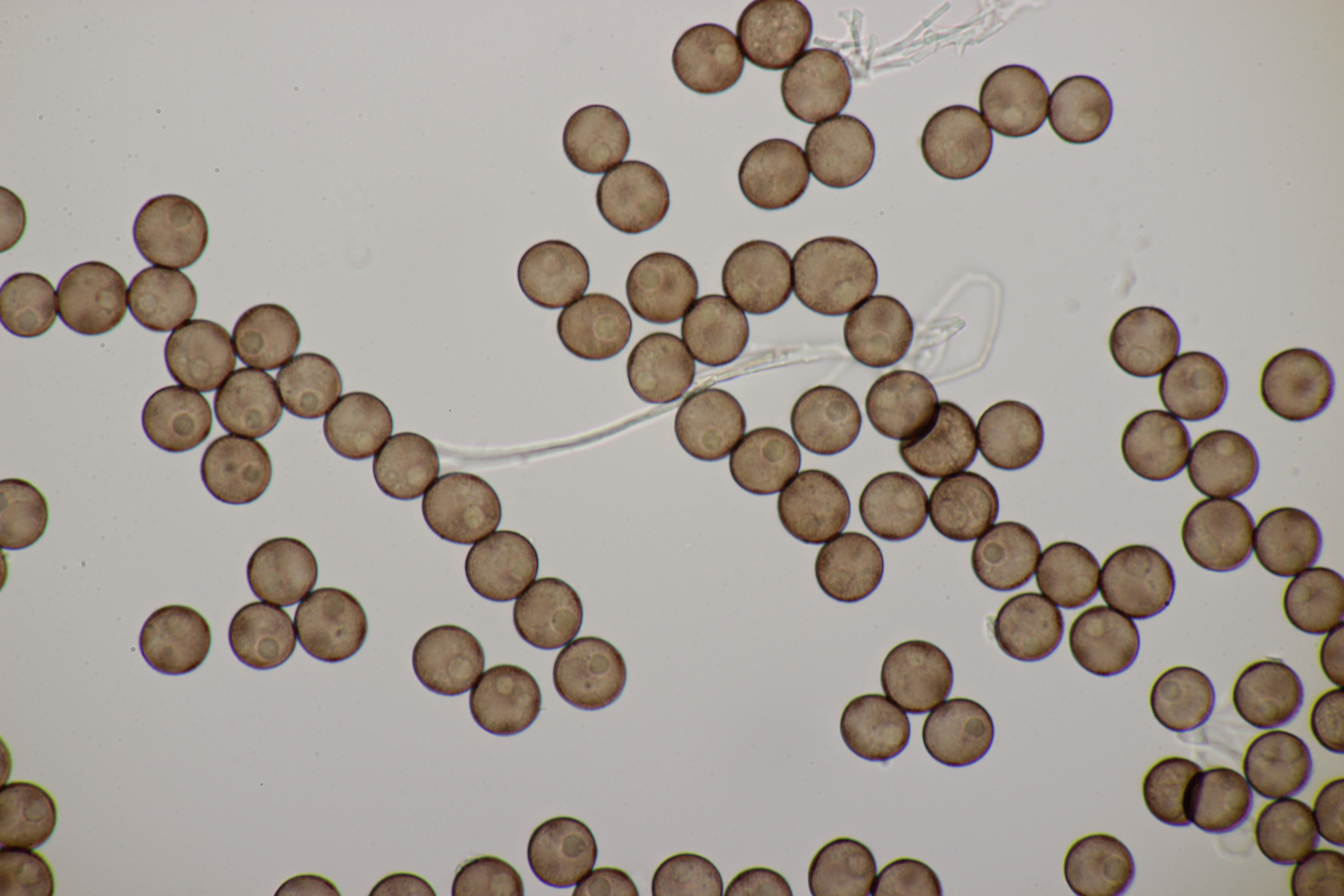 1. Hier würde ich gattungstechnisch zu Physarum tendieren. Sporen (10.4-12.3) µm bzw. (11.4+-0.5) µm. Eventuell P. leucophaeum?