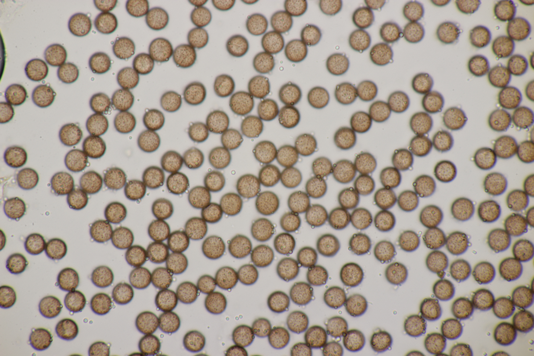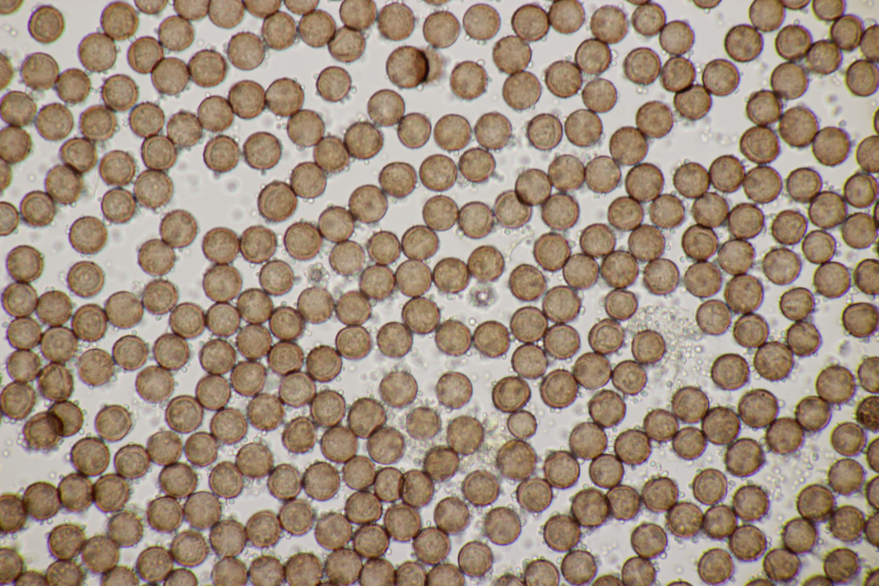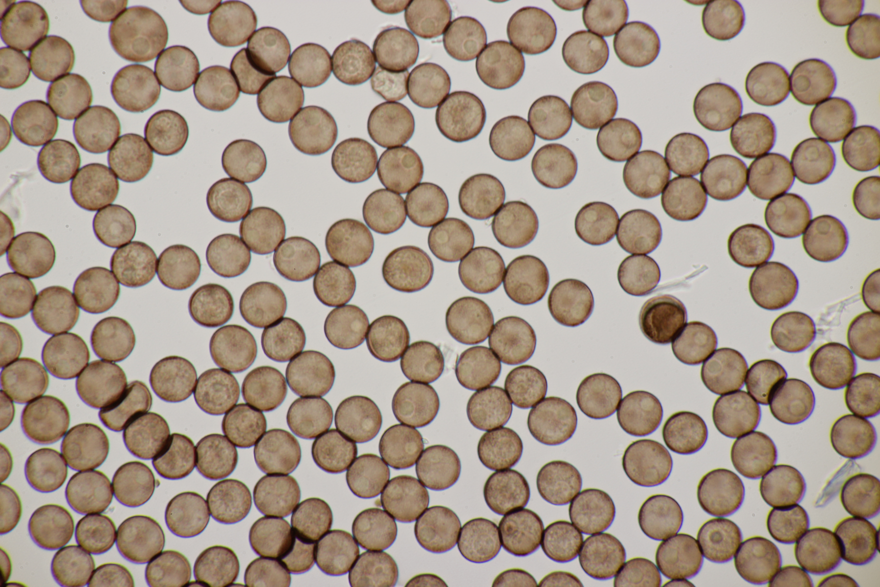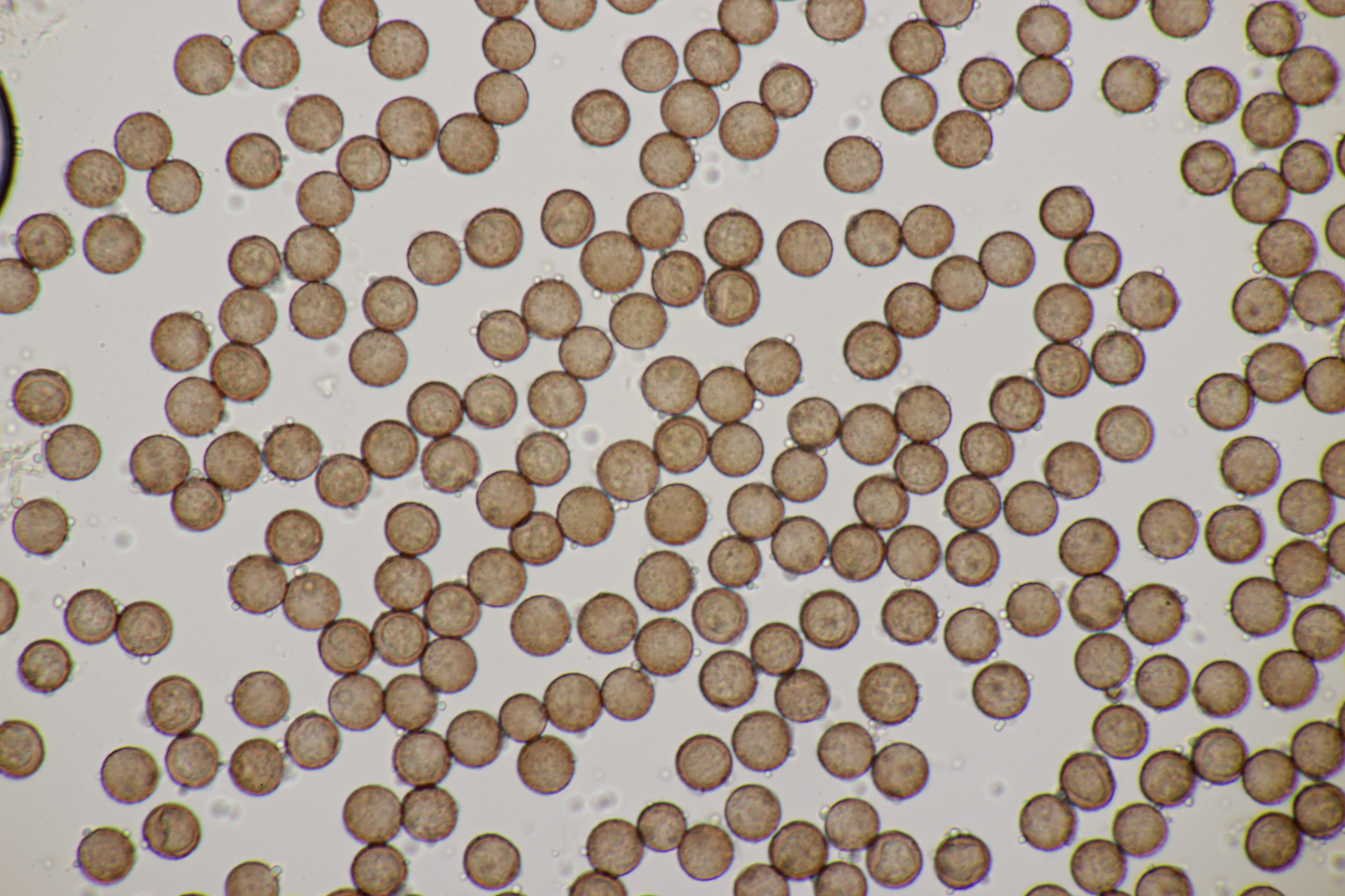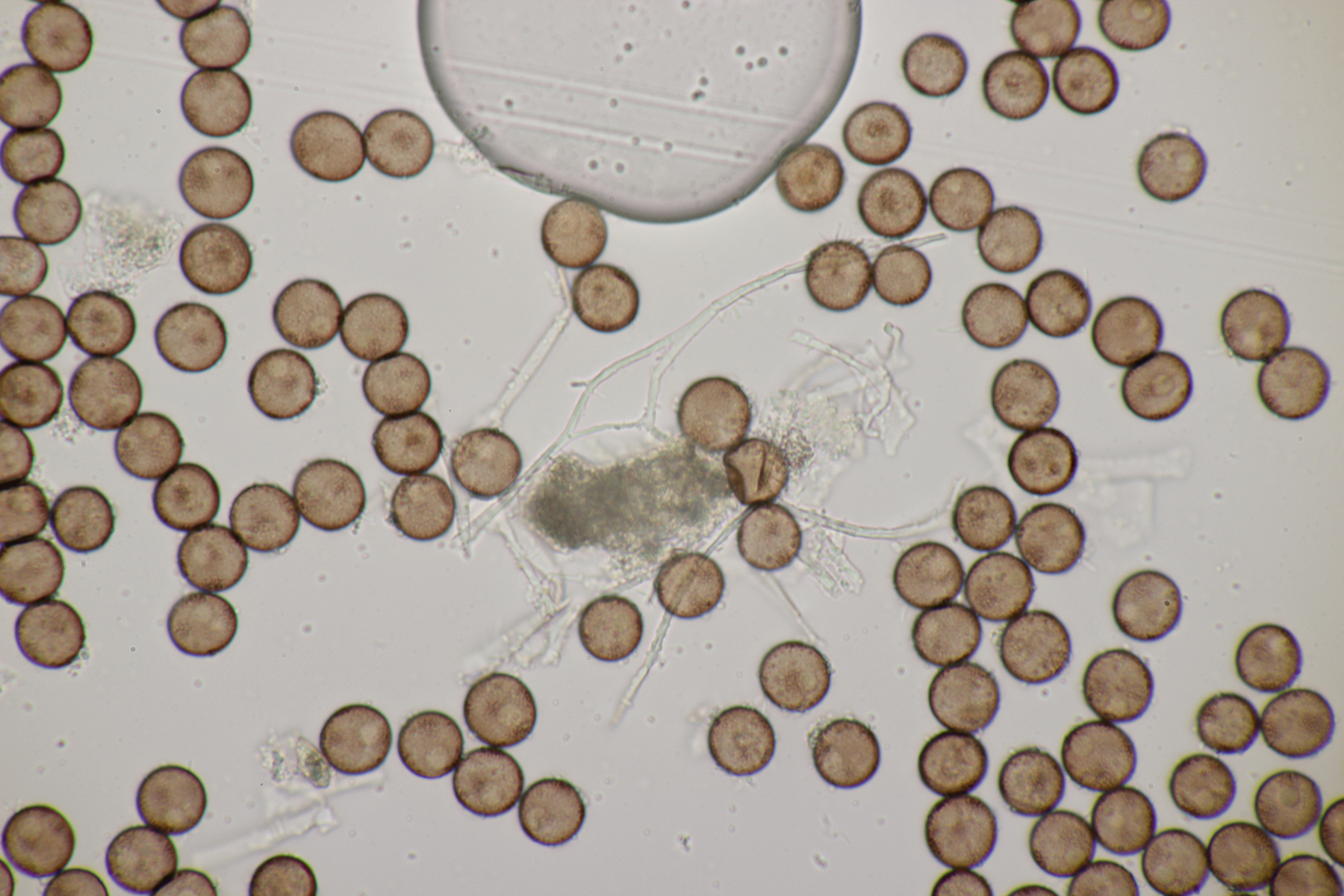 2. Ganz klar ein Craterium mit Sporen von (8.5-10.3) µm bzw. (9.3+-0.5) µm. Wenn man genau hinschaut, erkennt man oben auf der Sporenmasse Kalk, aber irgendwie passen C. aureonucleatum und C. leucocephalum var. leucocephalum nicht. Also doch einfach C. minutum?