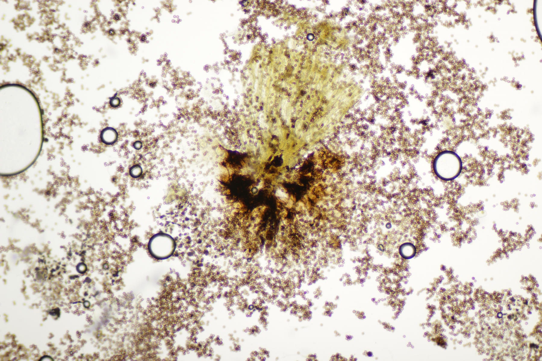 2. Ganz klar ein Craterium mit Sporen von (8.5-10.3) µm bzw. (9.3+-0.5) µm. Wenn man genau hinschaut, erkennt man oben auf der Sporenmasse Kalk, aber irgendwie passen C. aureonucleatum und C. leucocephalum var. leucocephalum nicht. Also doch einfach C. minutum?