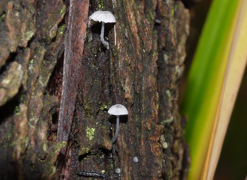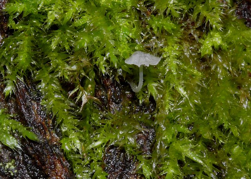 In Lübeck am Waldrand wachsen heute diese Mini-Pilzchen aus einem Baumstumpf. Zum Größenvergleich habe ich mal ein Pilzchen aufgenommen, das zwischen dem Zypressen-Schlafmoos (stimmt das?) wächst - also wirklich klein, vielleicht 2-5 mm.