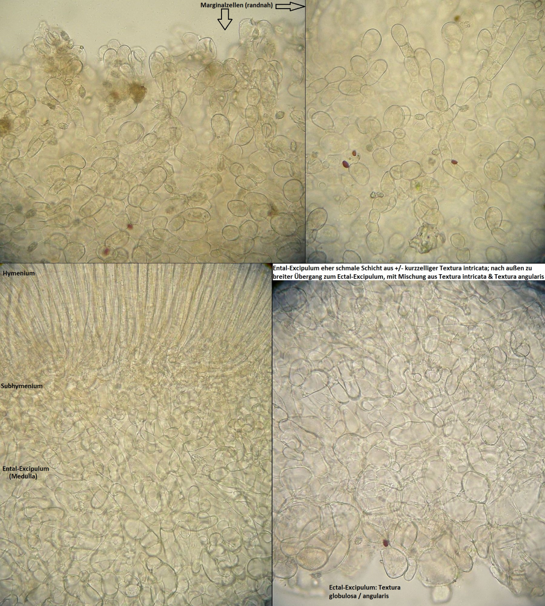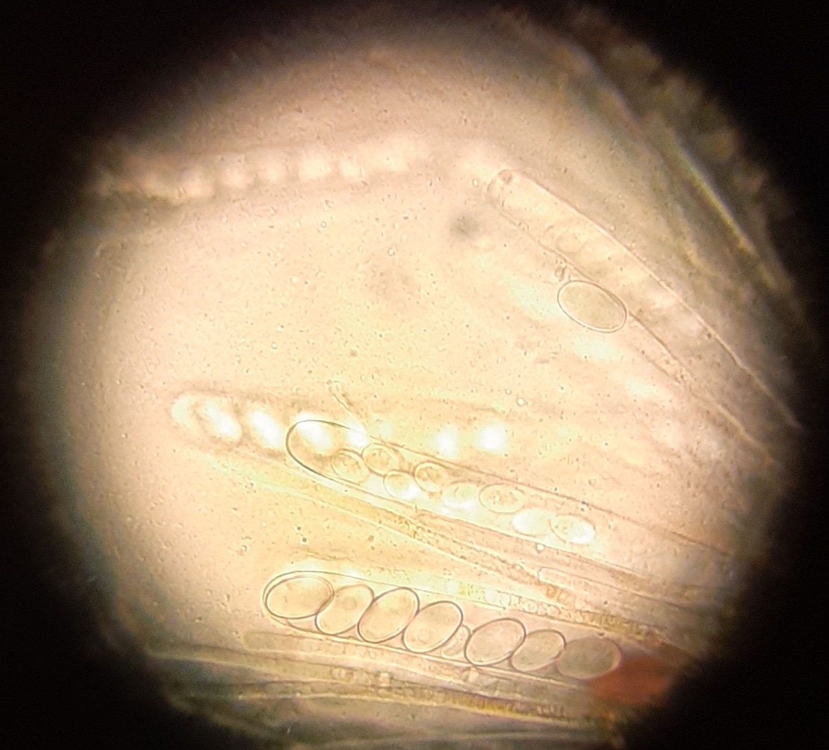 Da ich außer Sporen und Asci nicht wirklich mit der Anatomie vertraut bin, kann ich nur aufs Geratewohl fotografieren, und so richtig toll sind die Fotos auch nicht... Messen kann ich im Moment auch nicht, das Mikroskop mit dem Messokular hat irgendjemand ins Home Office entwendet glaube ich. :/