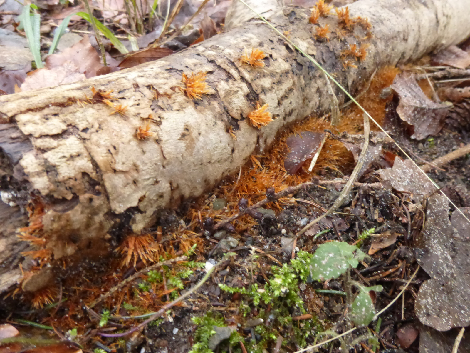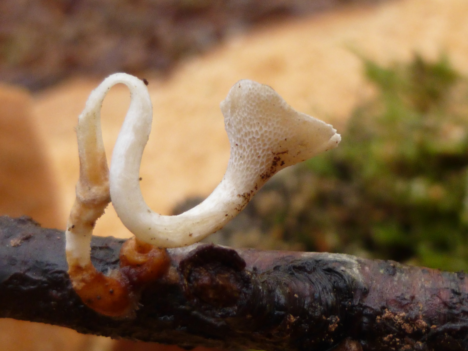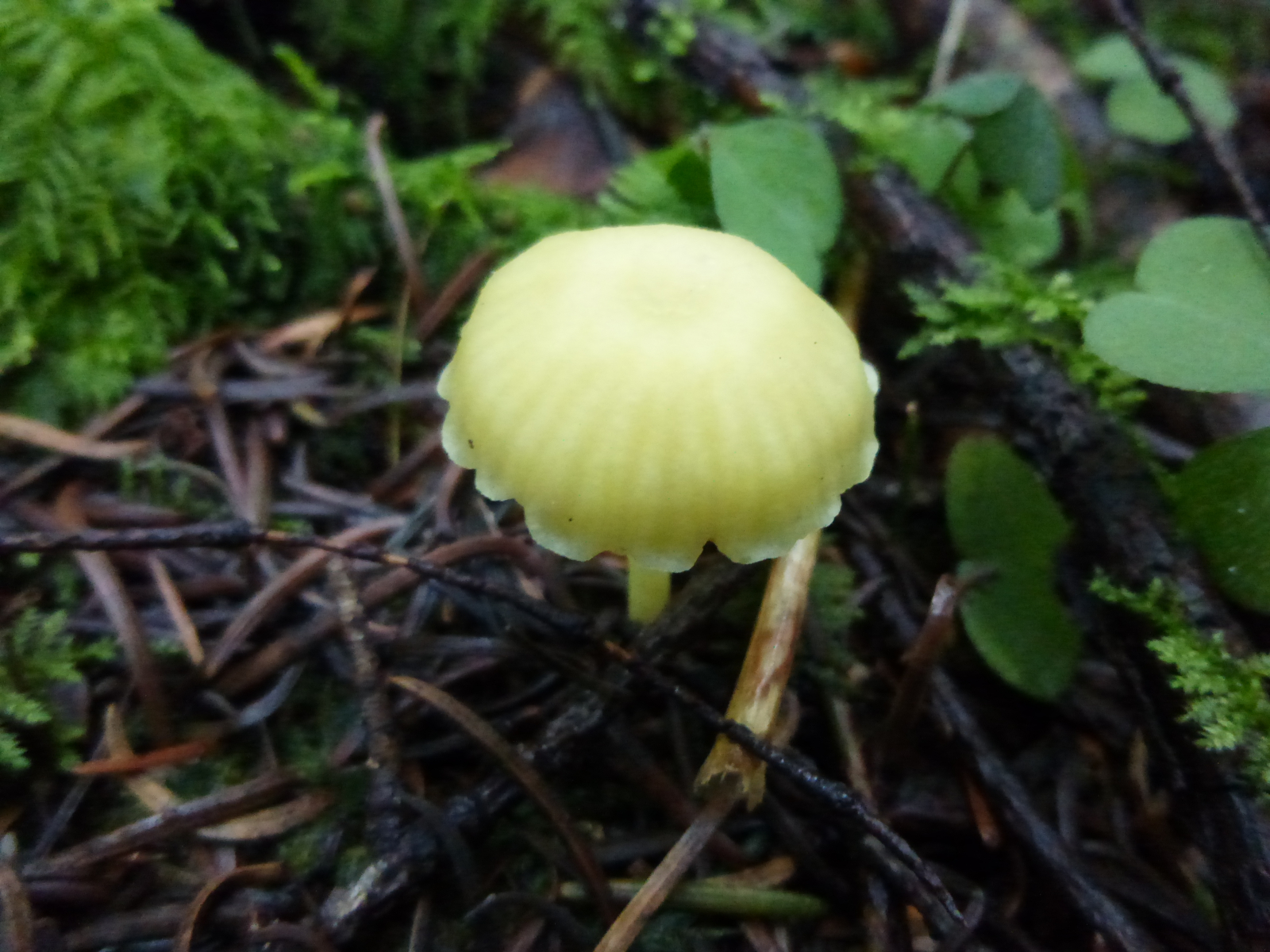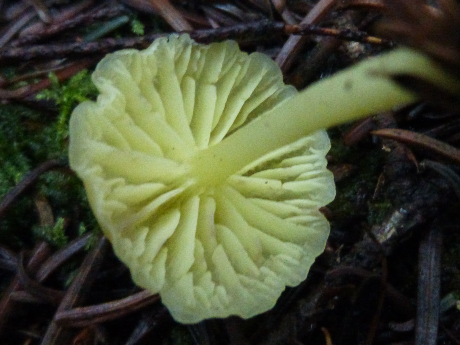 Fundort: Tannenwald, Fk überall gleichfarben gelb, einziger Fk, in Nachbarschaft vermutlich Duft-Trichterling (Clitocybe fragrans)