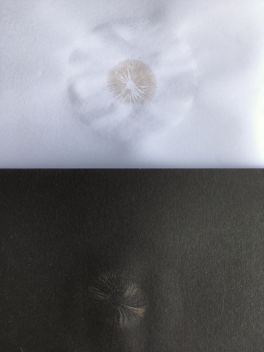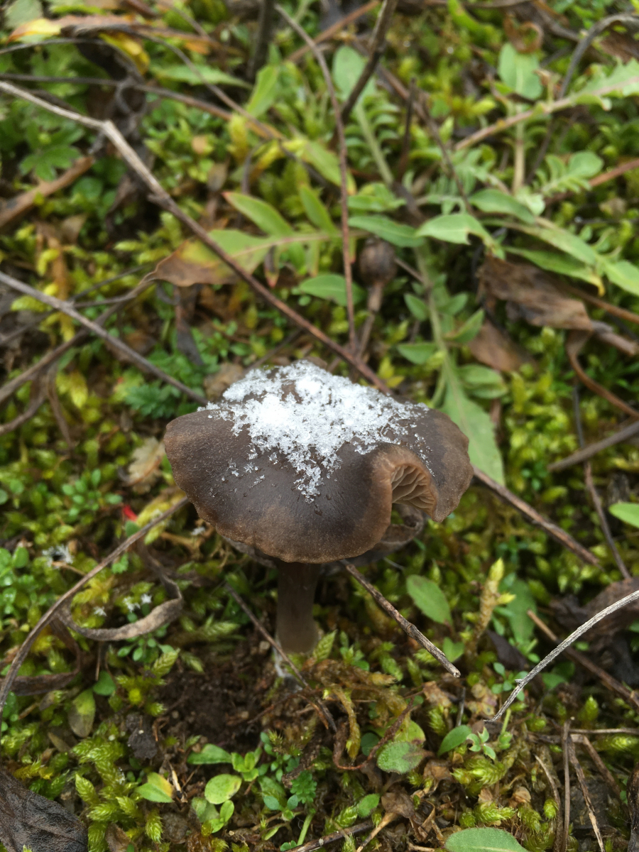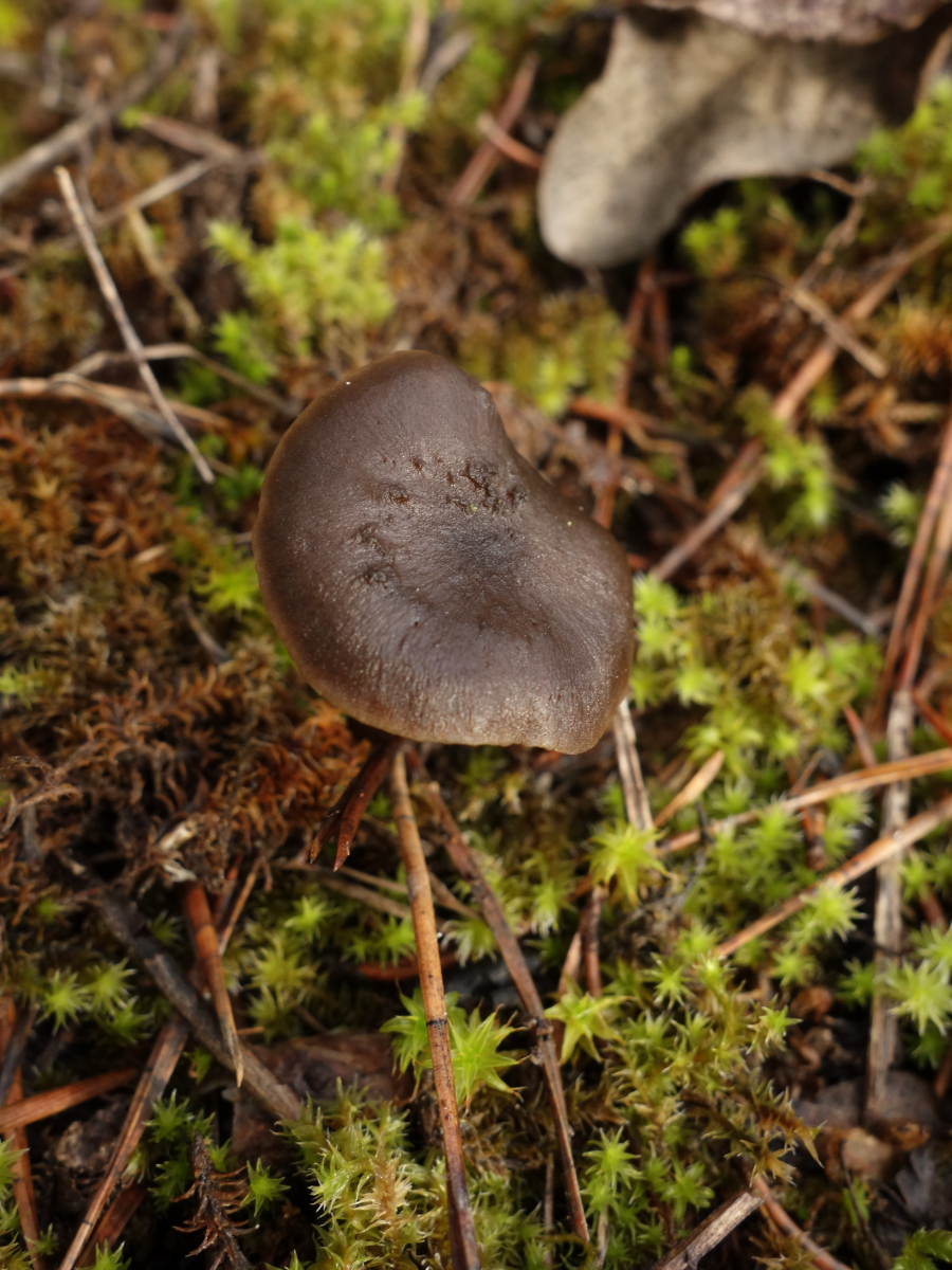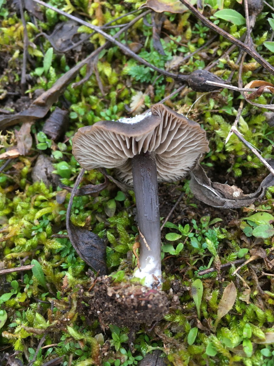 Hut dunkelbraun, etwas gräulicher matter Effekt, kaum gerieft zum Rand hin, flach gebuckelt, manche Exemplare mit zentralem "Stielbuckel". Lamellen ausgebuchtet angewachsen, beige später grau-hellbraun mit fraglcih leicht rötlichem Schimmer. Sporenpulver beige mit schwachem rosastich. Stiel braun, bei alten Exemplaren hohl, leicht faserig, weisser Basalfilz. Keinerlei Geruch bei unverletztem FK, nach zerreiben des Hutes deutlich mehlig. Auch wenn ich weiß dass eine Bestimmung nur mikroskopisch möglich ist halte ich aufgrund der passenden makroskpischen Merkmale Entoloma cf sericeum zumindest für die kleinen runden Exemplare für nicht unwahrscheinlich.