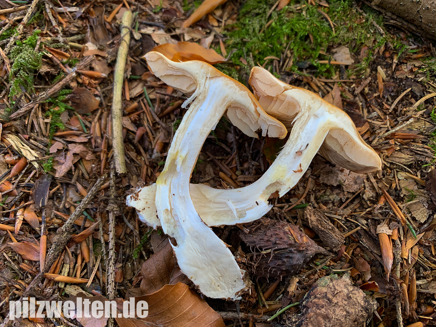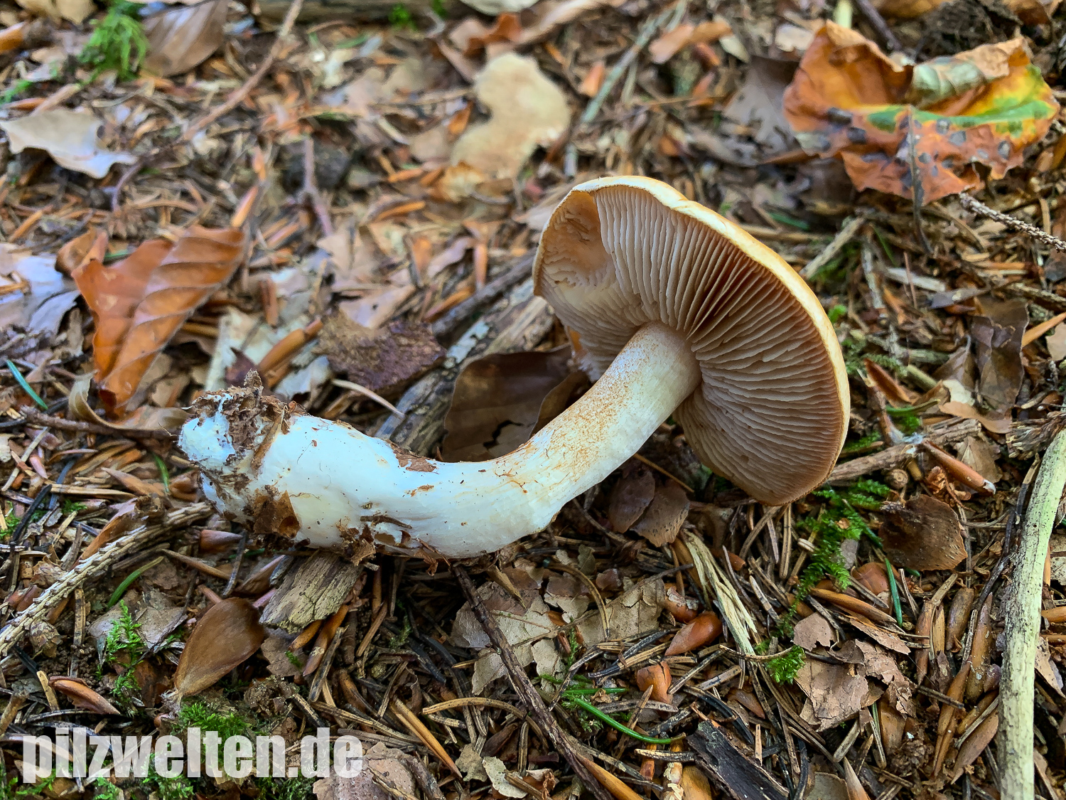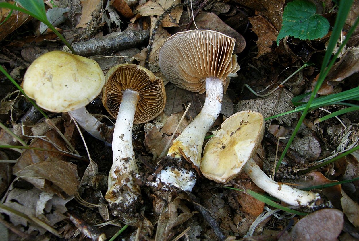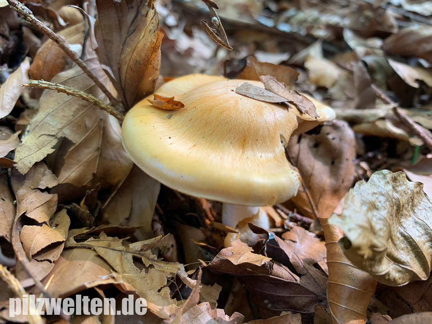 Wir haben zuerst nach gelbhütigen "Hebelomas" (Fälblingen) gesucht, aber konnten keine Art mit ähnlichen Merkmalen finden - suchen wir vielleicht an der völlig falschen Stelle? Was für uns für Hebeloma spec spricht: Ausgebuchtet angewachsenen Lamellen, Stiel und Lamellen annähernd mit der gleichen Farbe, das bräunliche Sporenpulver, die verdickte Stielbasis.