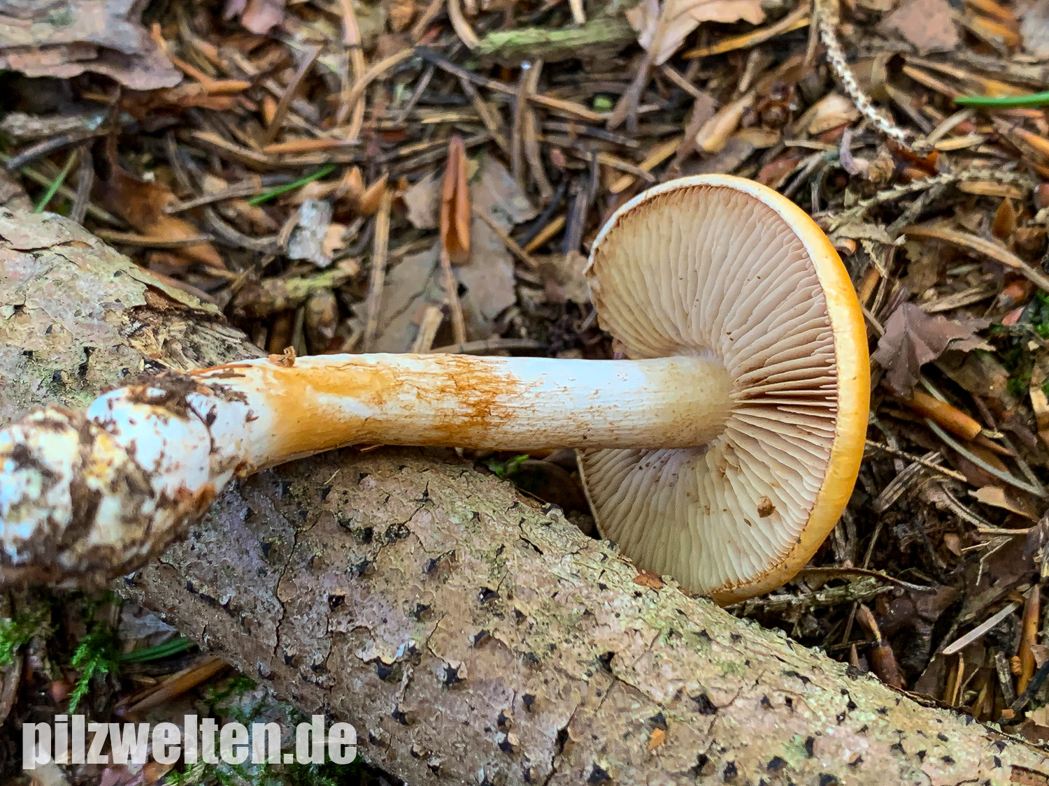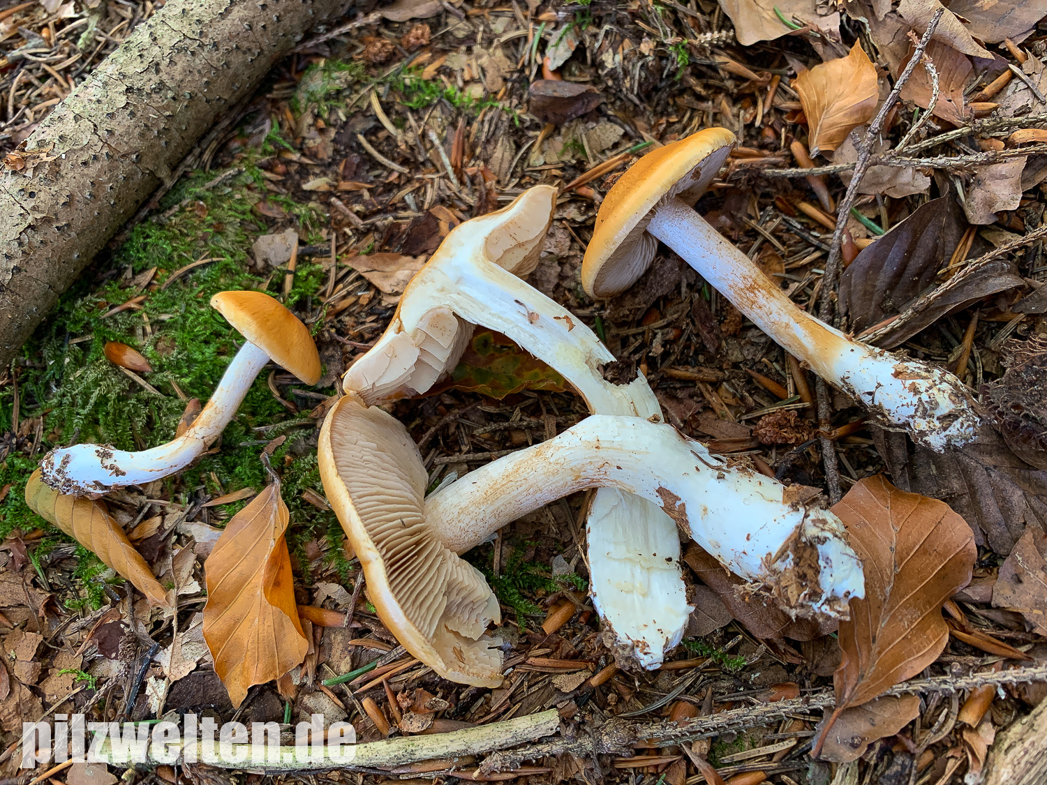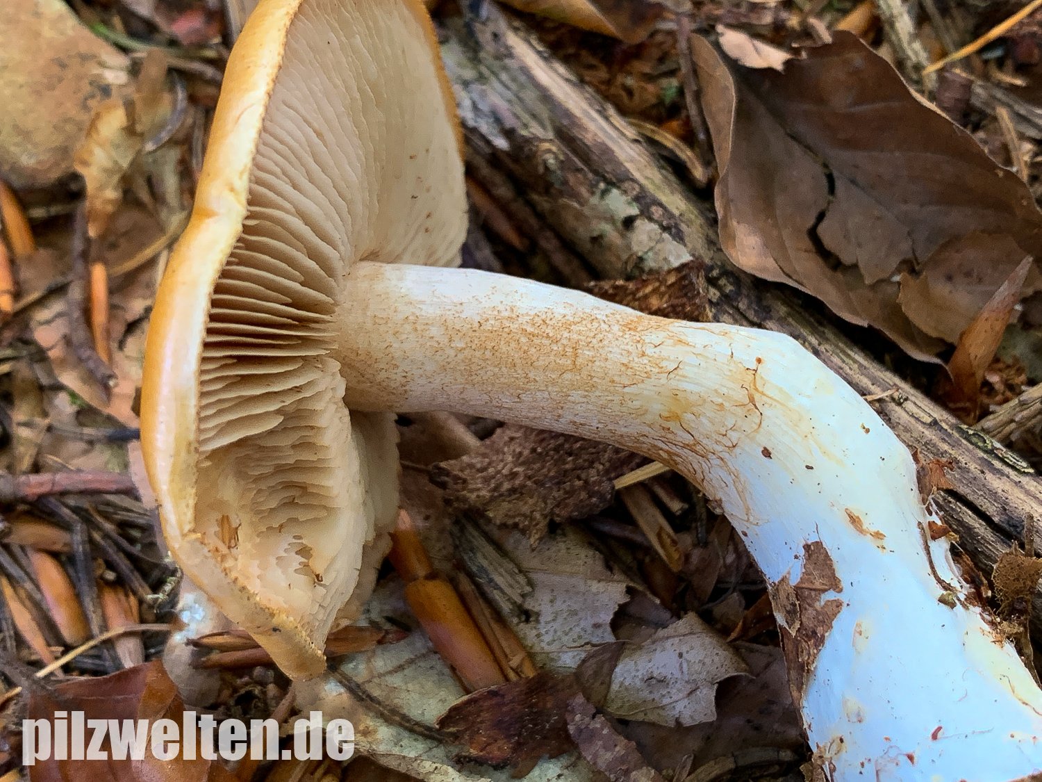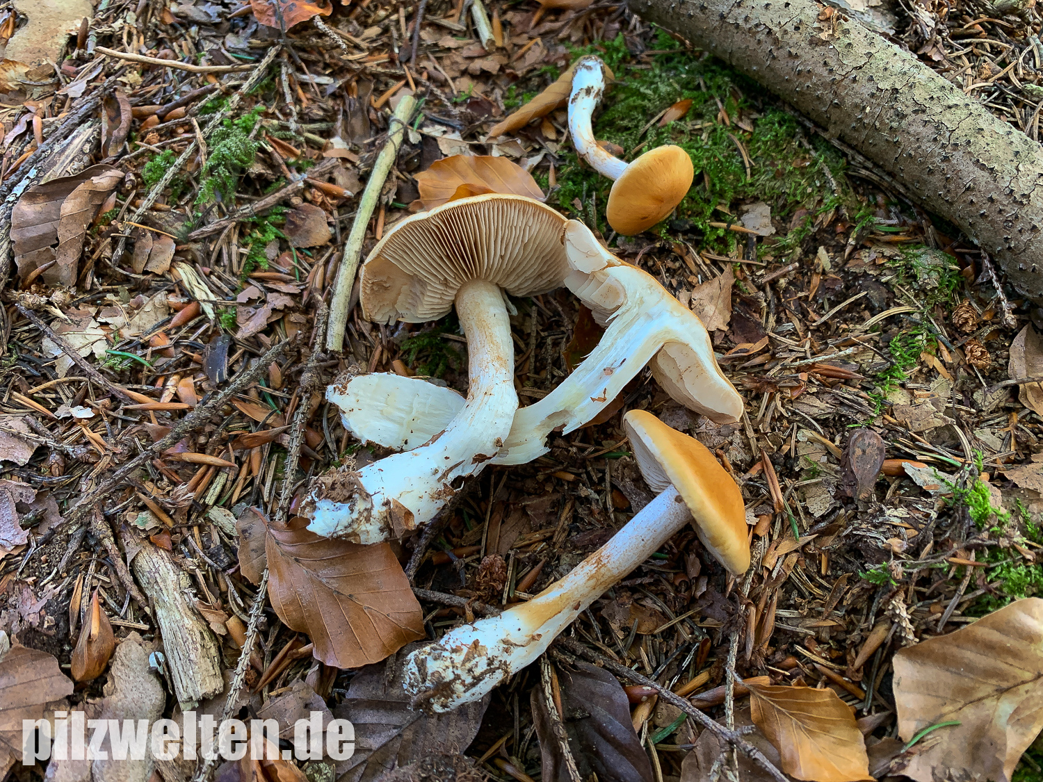 Wir haben zuerst nach gelbhütigen "Hebelomas" (Fälblingen) gesucht, aber konnten keine Art mit ähnlichen Merkmalen finden - suchen wir vielleicht an der völlig falschen Stelle? Was für uns für Hebeloma spec spricht: Ausgebuchtet angewachsenen Lamellen, Stiel und Lamellen annähernd mit der gleichen Farbe, das bräunliche Sporenpulver, die verdickte Stielbasis.