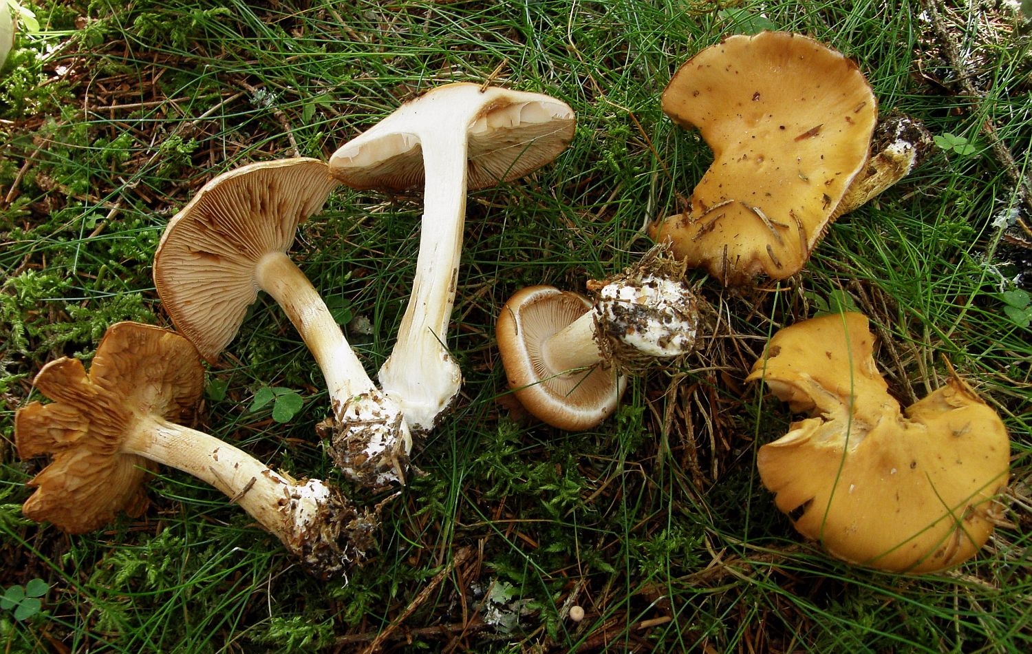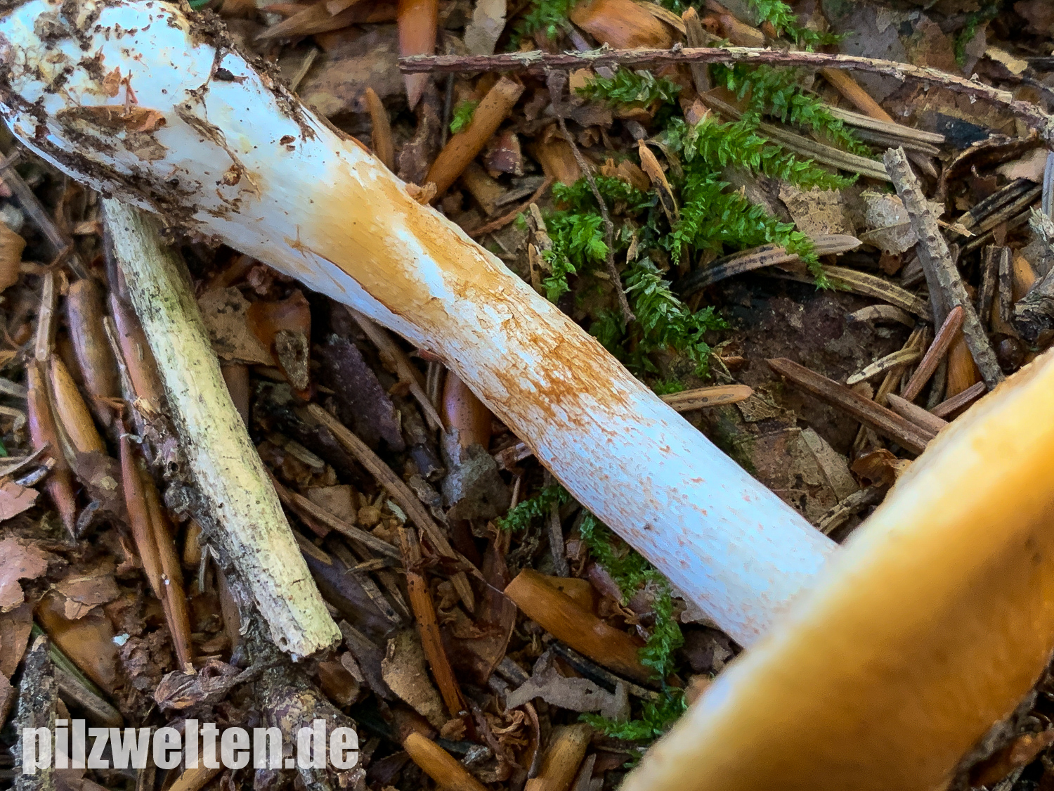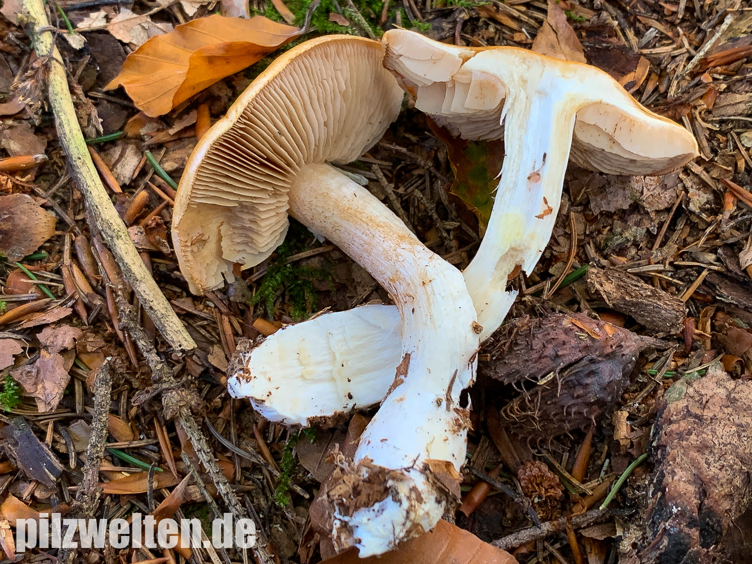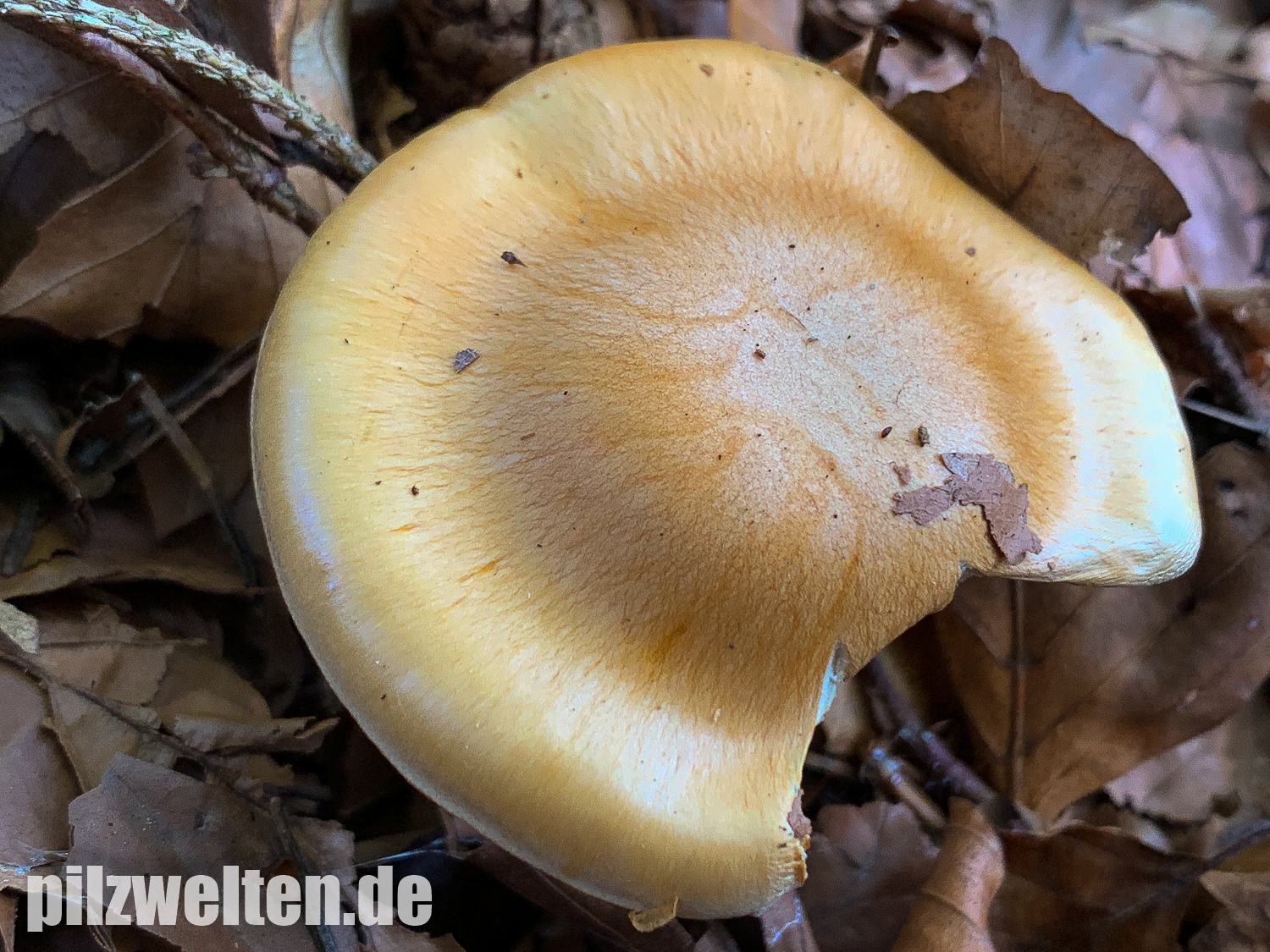 Wir haben zuerst nach gelbhütigen "Hebelomas" (Fälblingen) gesucht, aber konnten keine Art mit ähnlichen Merkmalen finden - suchen wir vielleicht an der völlig falschen Stelle? Was für uns für Hebeloma spec spricht: Ausgebuchtet angewachsenen Lamellen, Stiel und Lamellen annähernd mit der gleichen Farbe, das bräunliche Sporenpulver, die verdickte Stielbasis.