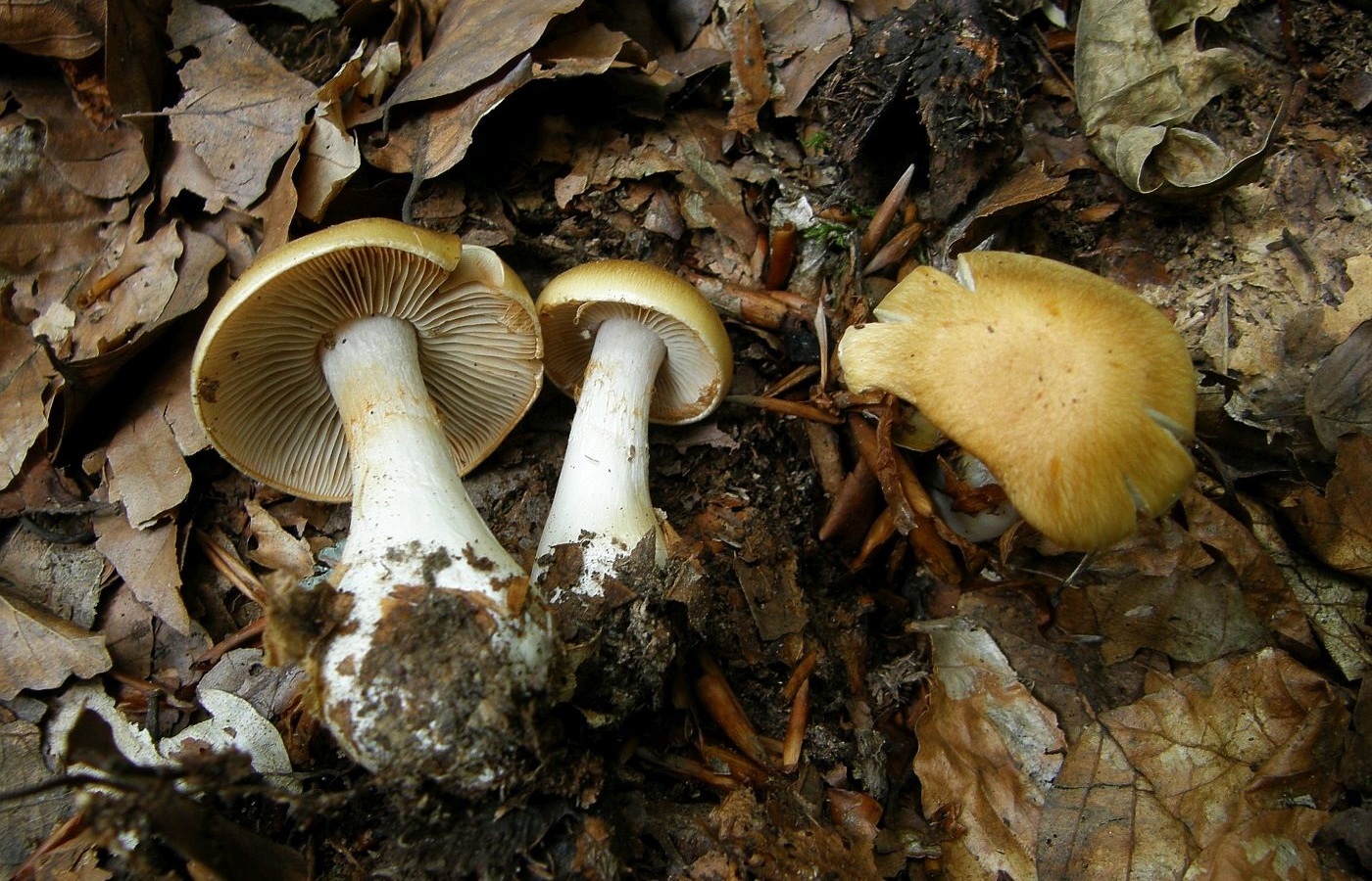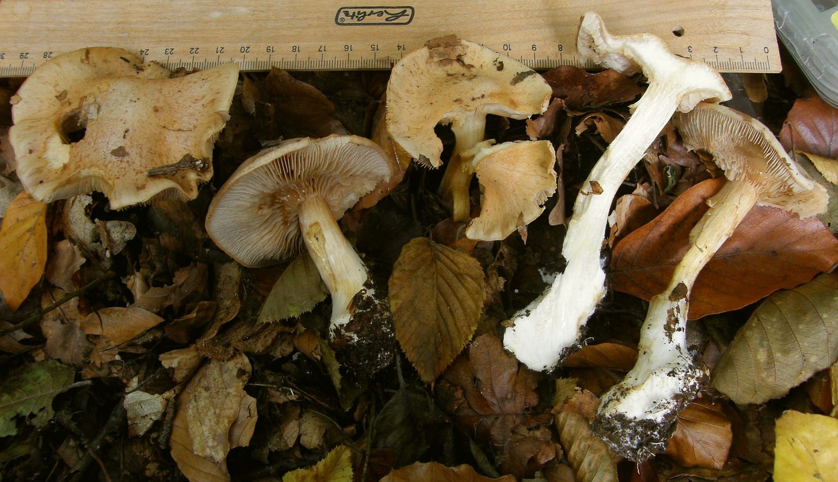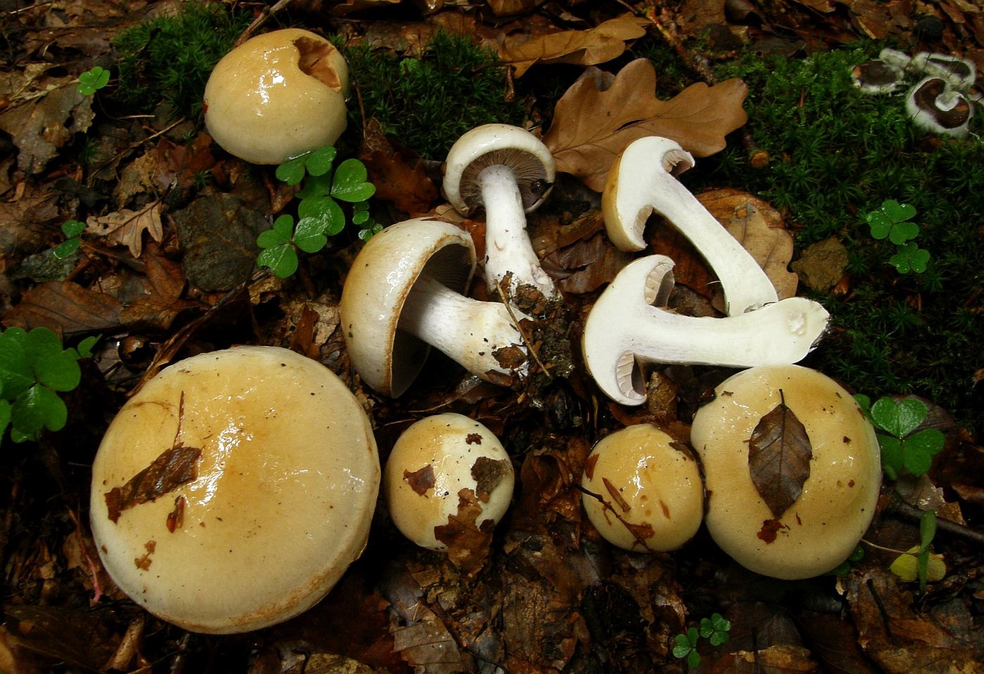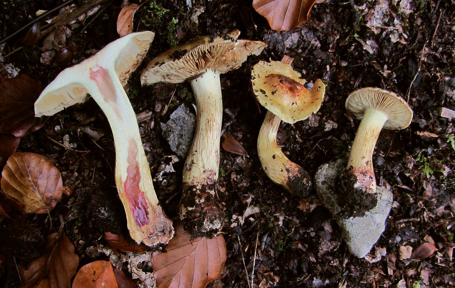 Wir haben zuerst nach gelbhütigen "Hebelomas" (Fälblingen) gesucht, aber konnten keine Art mit ähnlichen Merkmalen finden - suchen wir vielleicht an der völlig falschen Stelle? Was für uns für Hebeloma spec spricht: Ausgebuchtet angewachsenen Lamellen, Stiel und Lamellen annähernd mit der gleichen Farbe, das bräunliche Sporenpulver, die verdickte Stielbasis.