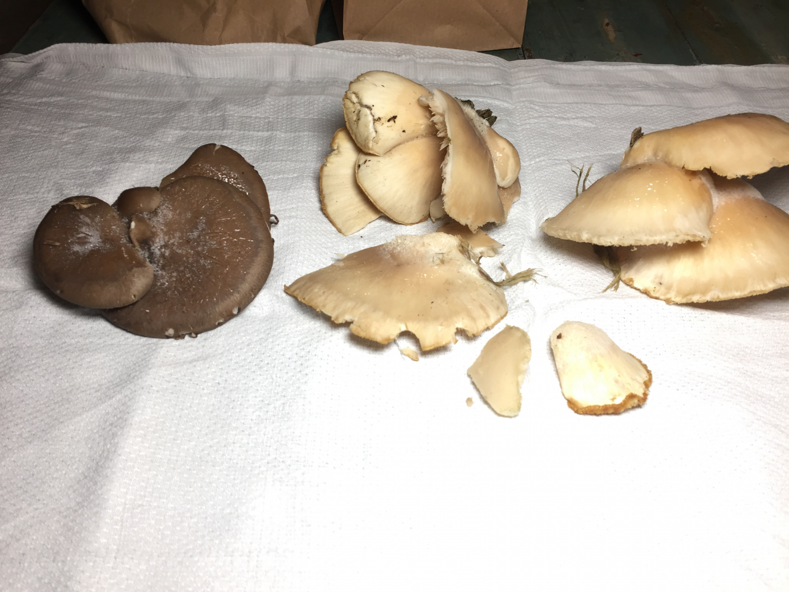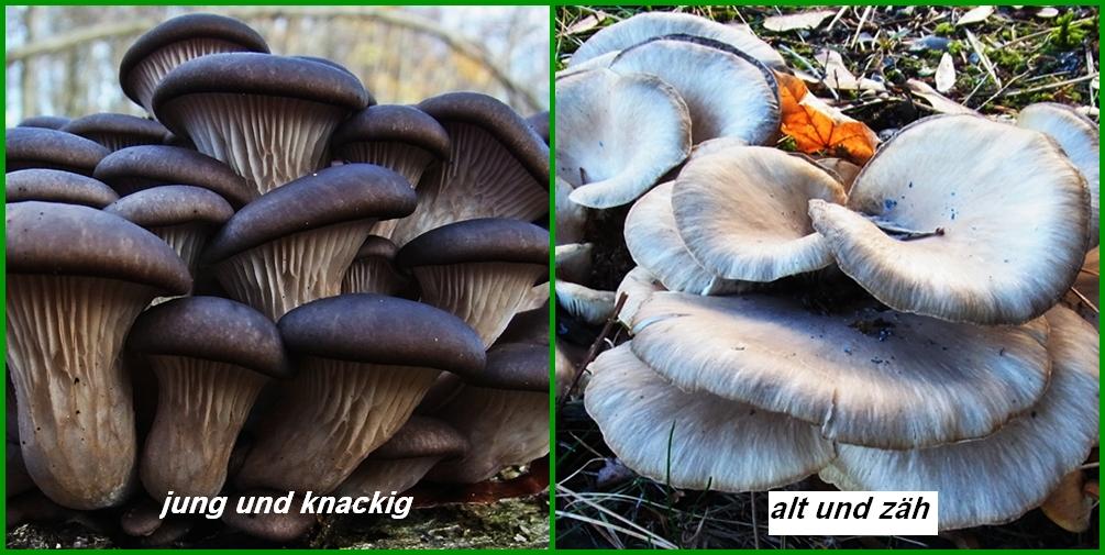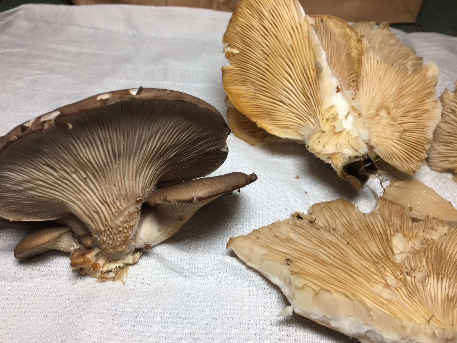 Links die Austernseitlinge, rechts die anderen Pilze (oder auch Austerns.)